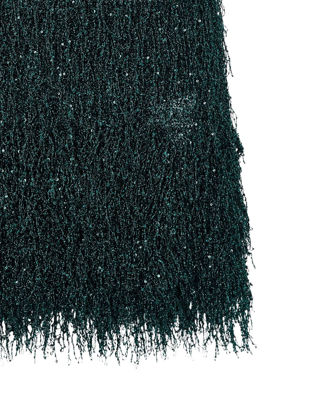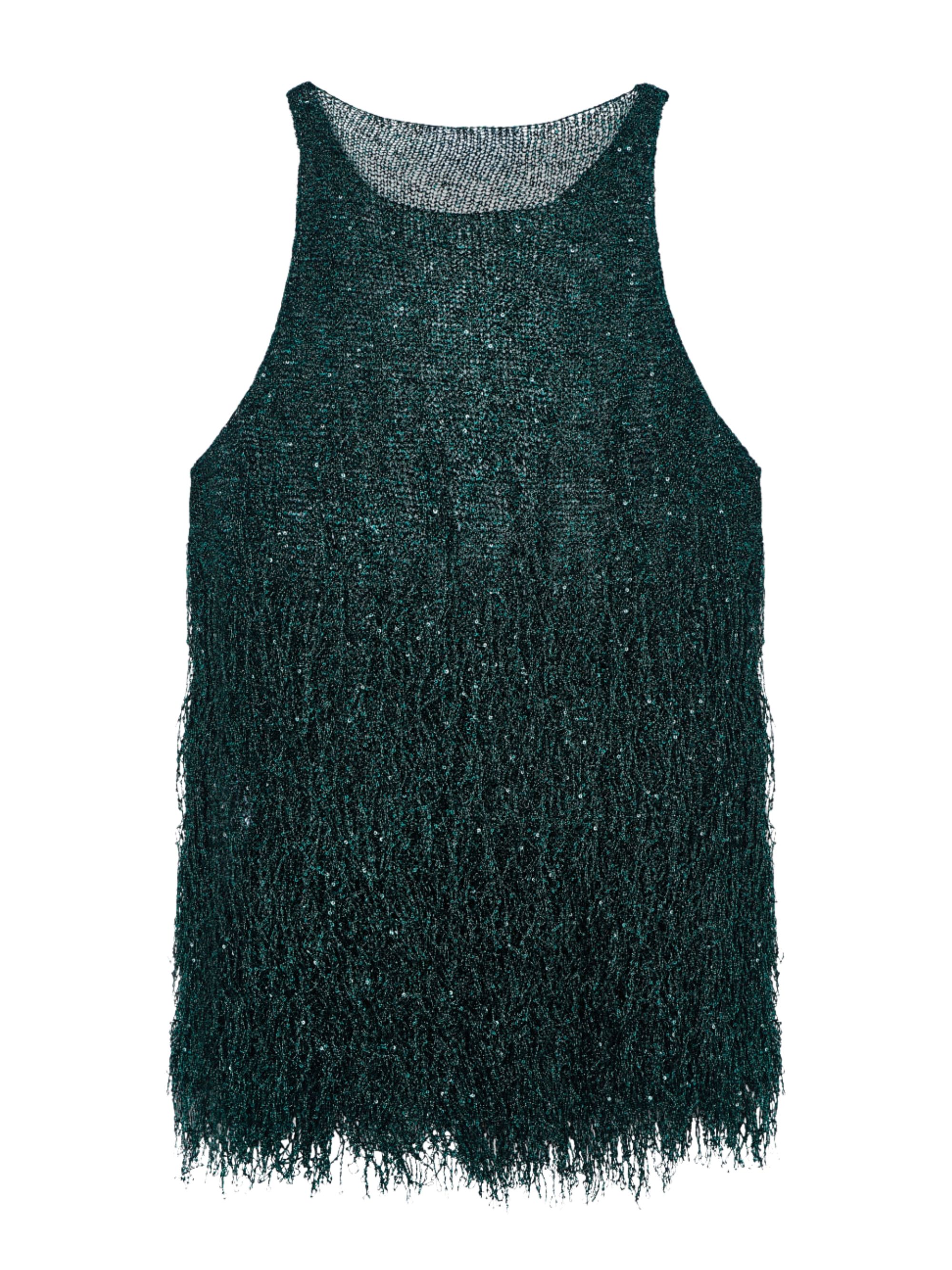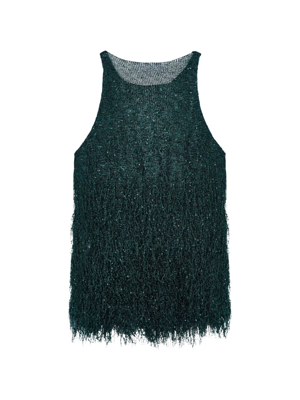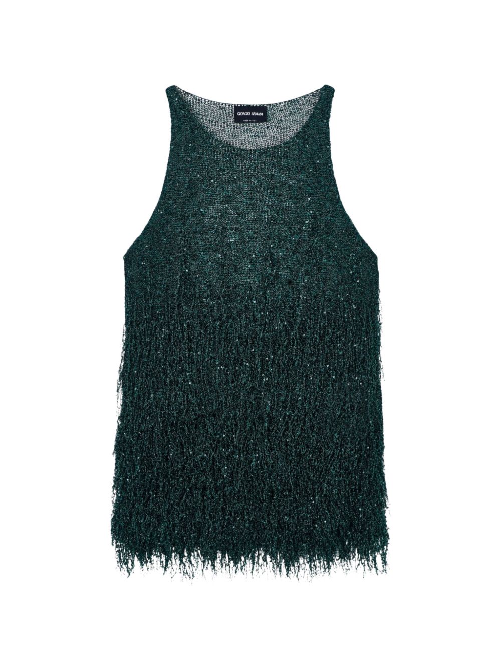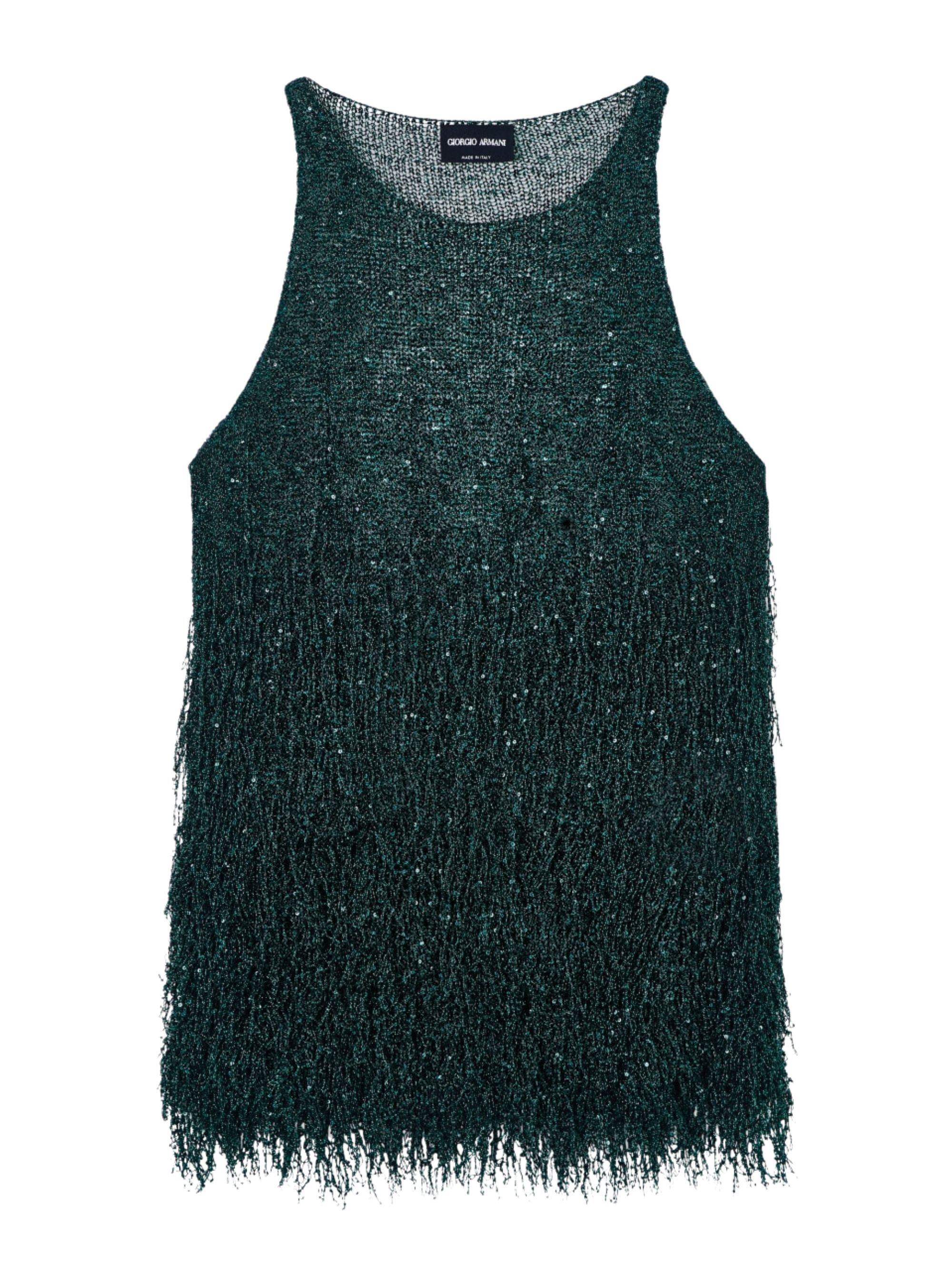 GIORGIO ARMANI green sleeveless lurex jersey fringed top with sequin fringe.