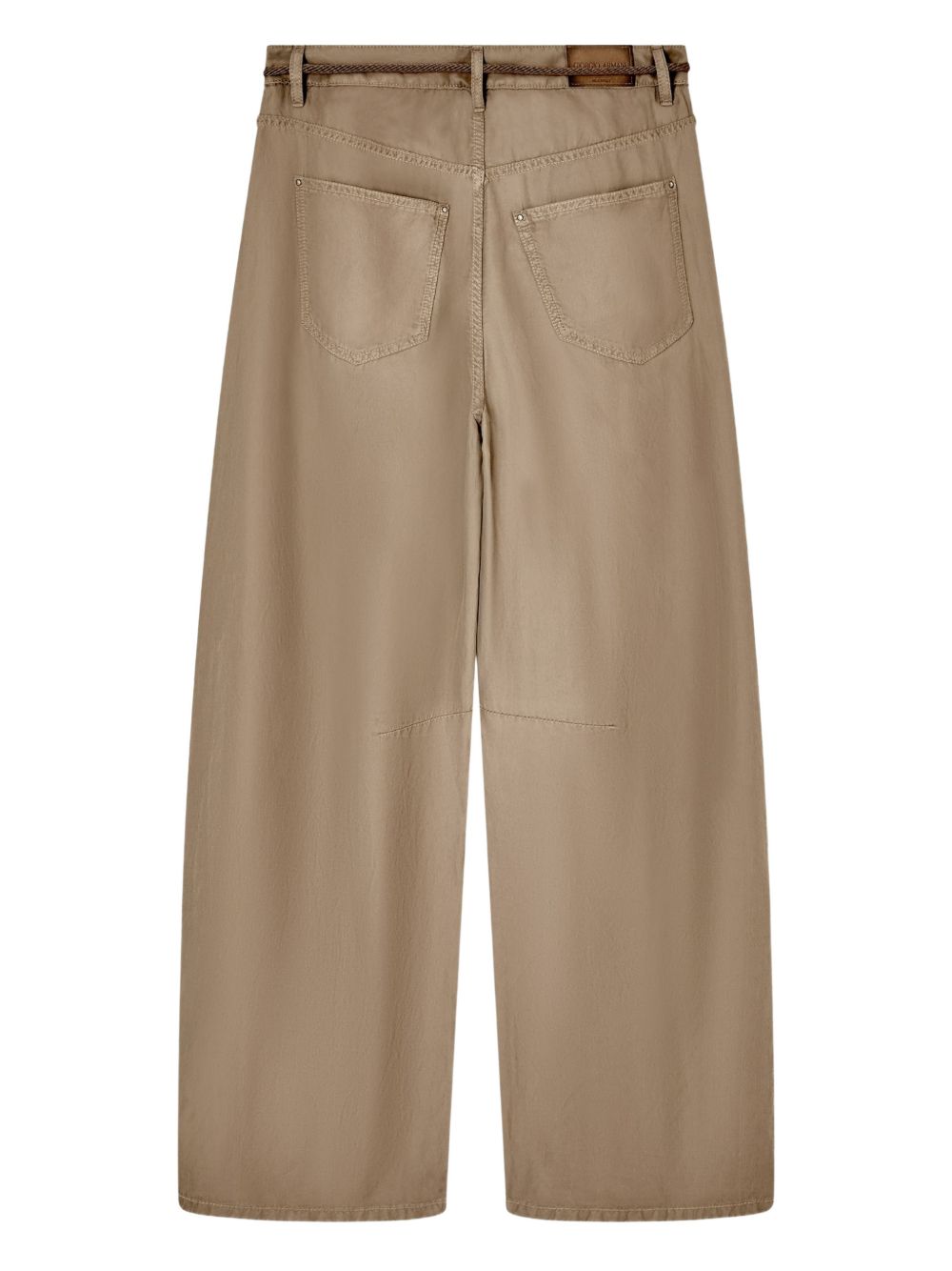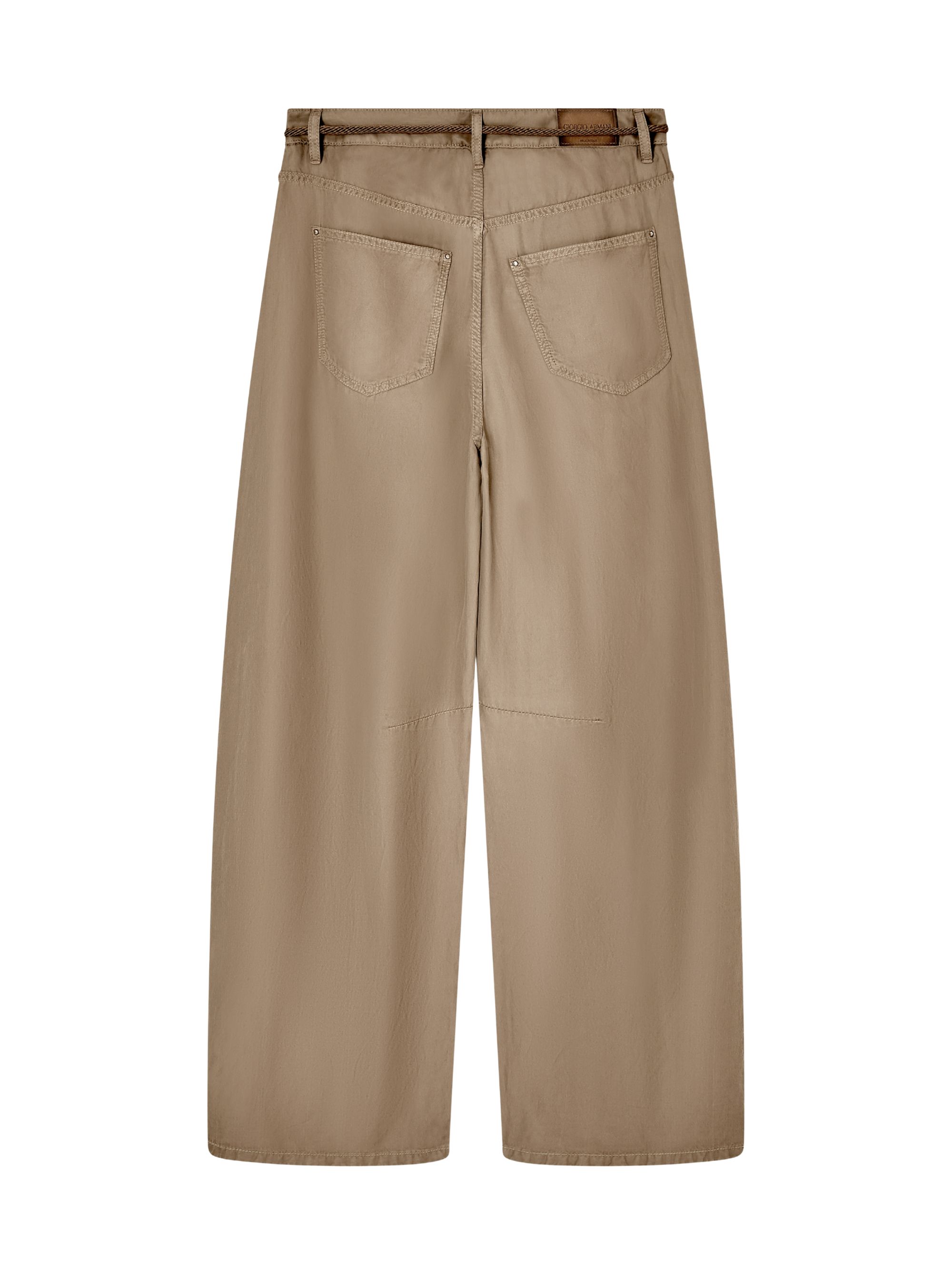 GIORGIO ARMANI brown belted trousers in cupro and linen, featuring a waistband with belt loops, a rope belt with tassels, a button and zip fastening, two front pockets and two patch pockets on the back.