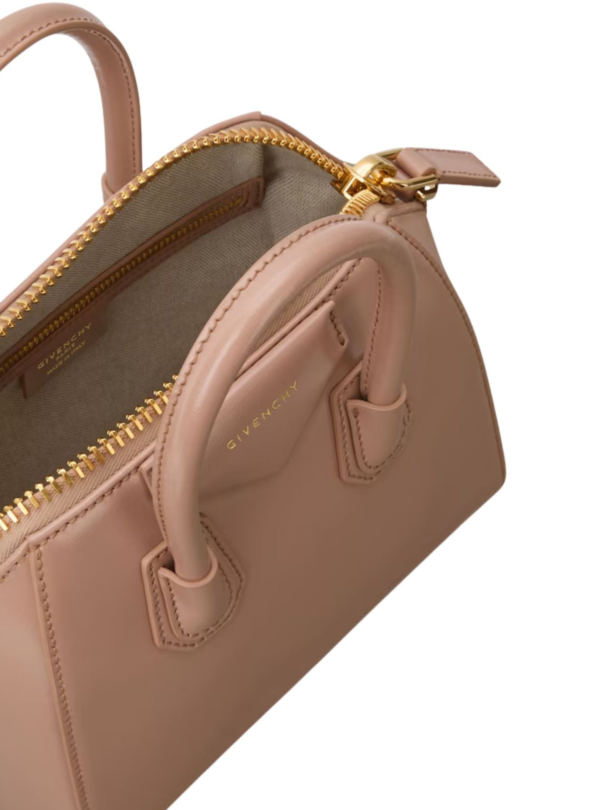 GIVENCHY mini Antigona bag in pink Box leather, featuring a zip closure, an adjustable and removable shoulder strap, an embossed gold Givenchy signature, gold hardware, and a main compartment. Dimensions: 22 x 20 x 13 cm.