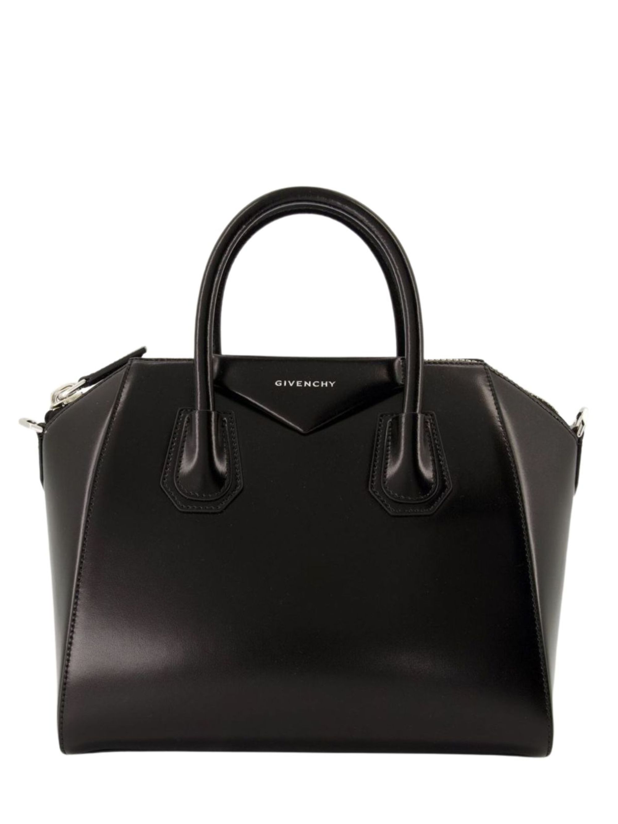 GIVENCHY Antigona bag in black leather, featuring an adjustable and removable shoulder strap, zip closure, gold metal lettering logo on the front, canvas lining, and an internal zip pocket. Dimensions: 33 x 23 x 17 cm.