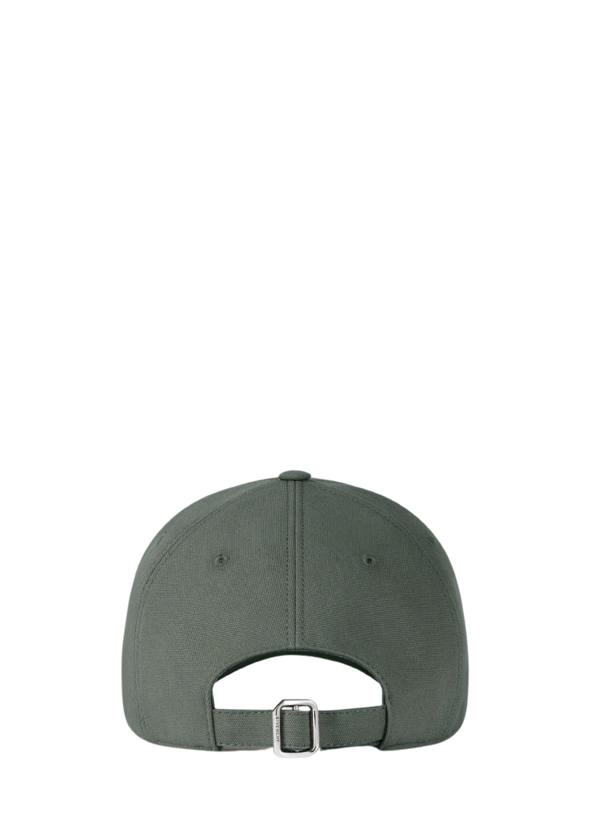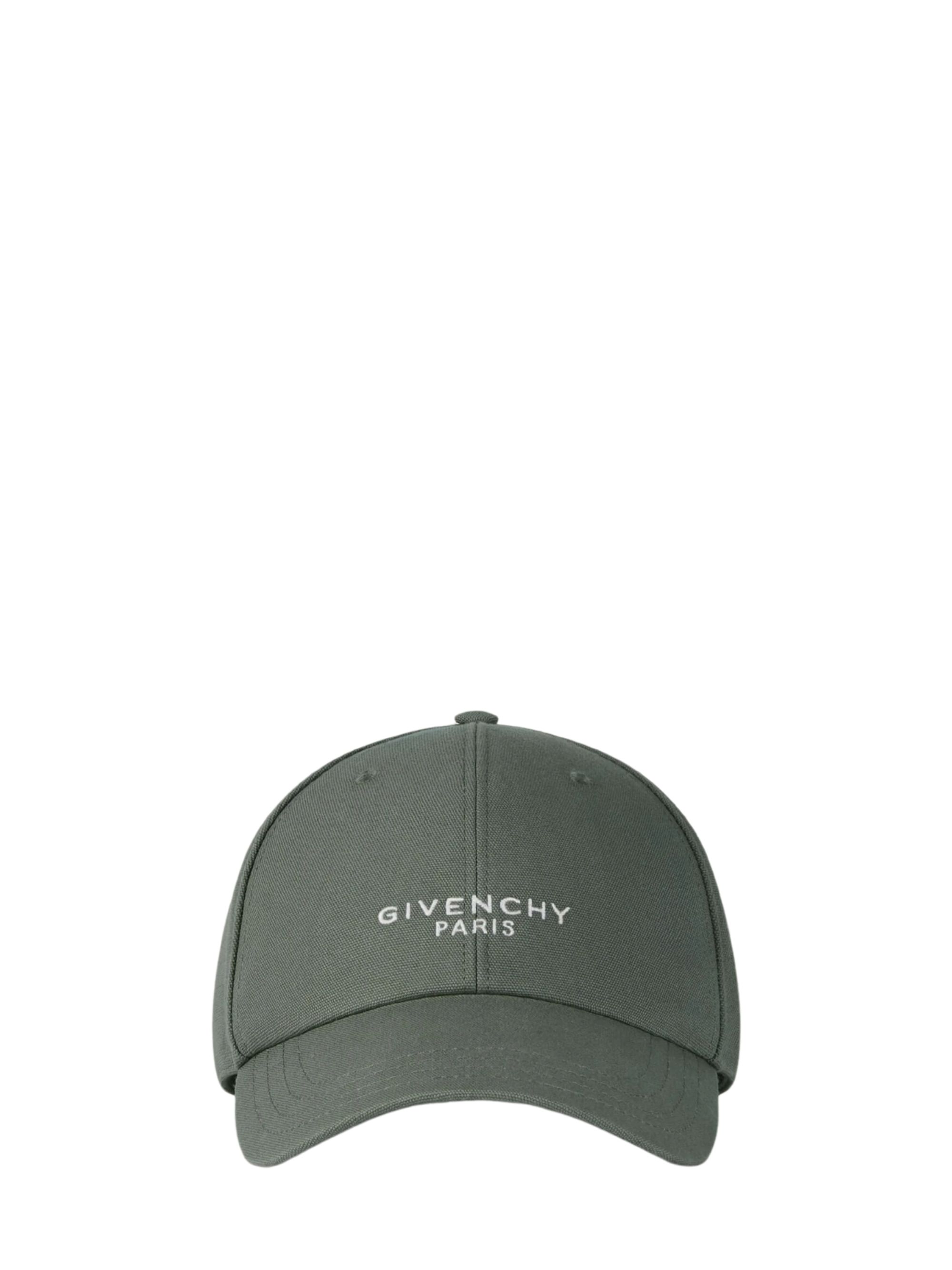 GIVENCHY embroidered cap in green cotton twill, featuring a curved visor, embroidered Givenchy Paris signature and a tab with a Givenchy engraved metal buckle on the back.
