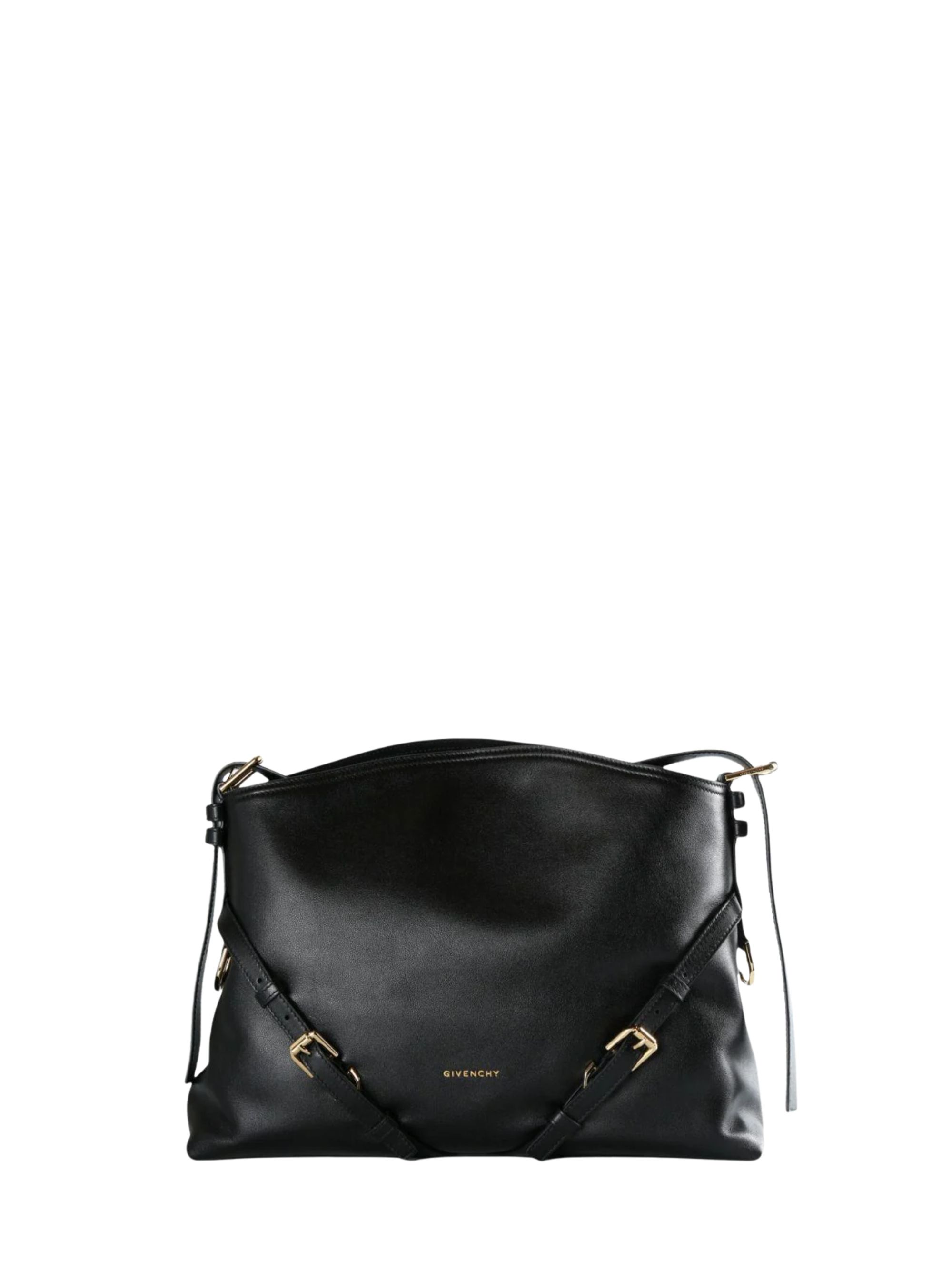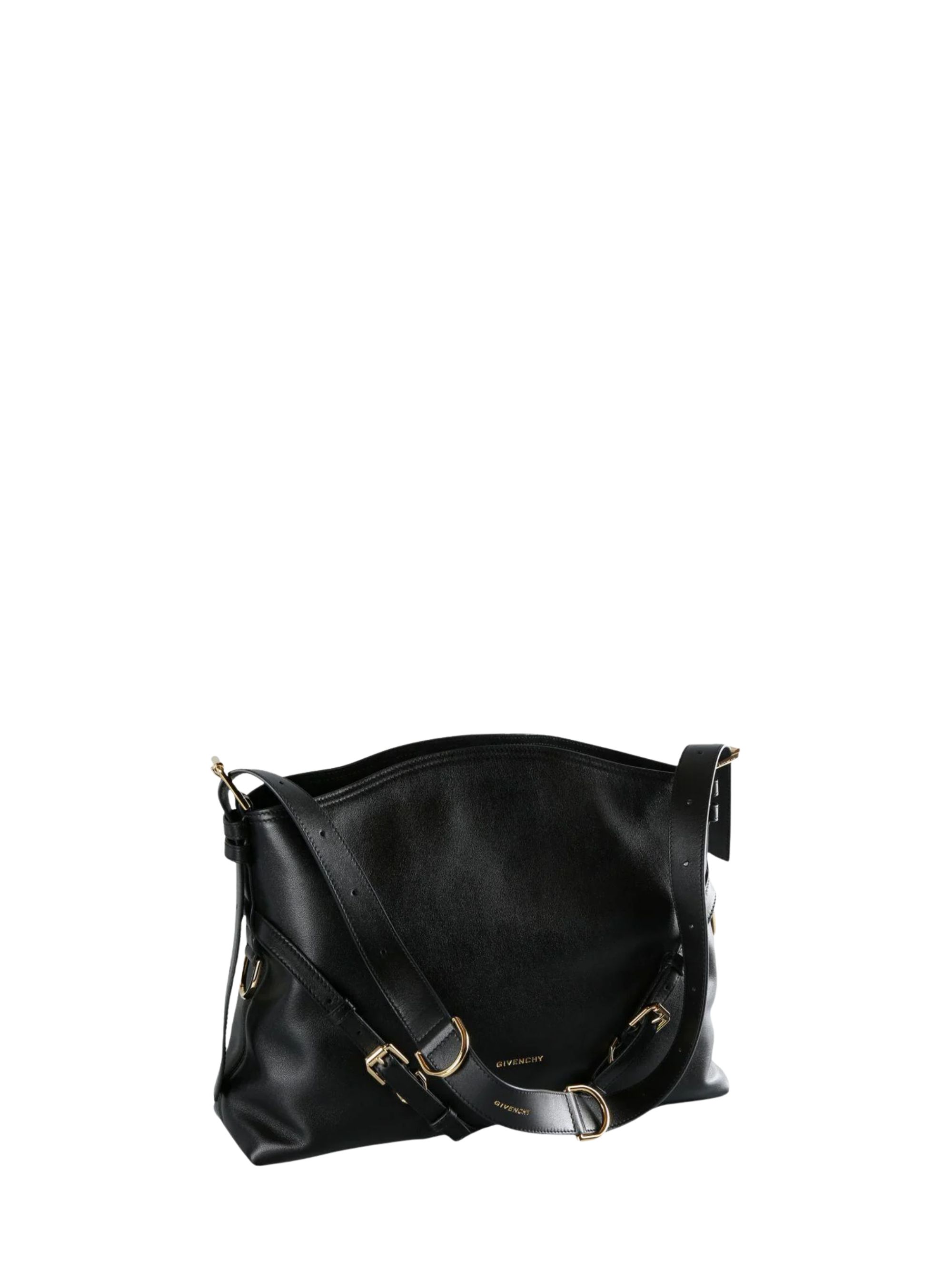 GIVENCHY Voyou bag in black leather featuring a V-shaped silhouette, an adjustable shoulder strap, an embossed logo lettering on the front, logo-engraved metal buckles, gold-tone hardware, and a main compartment. Dimensions: 38 x 28 x 10 cm.