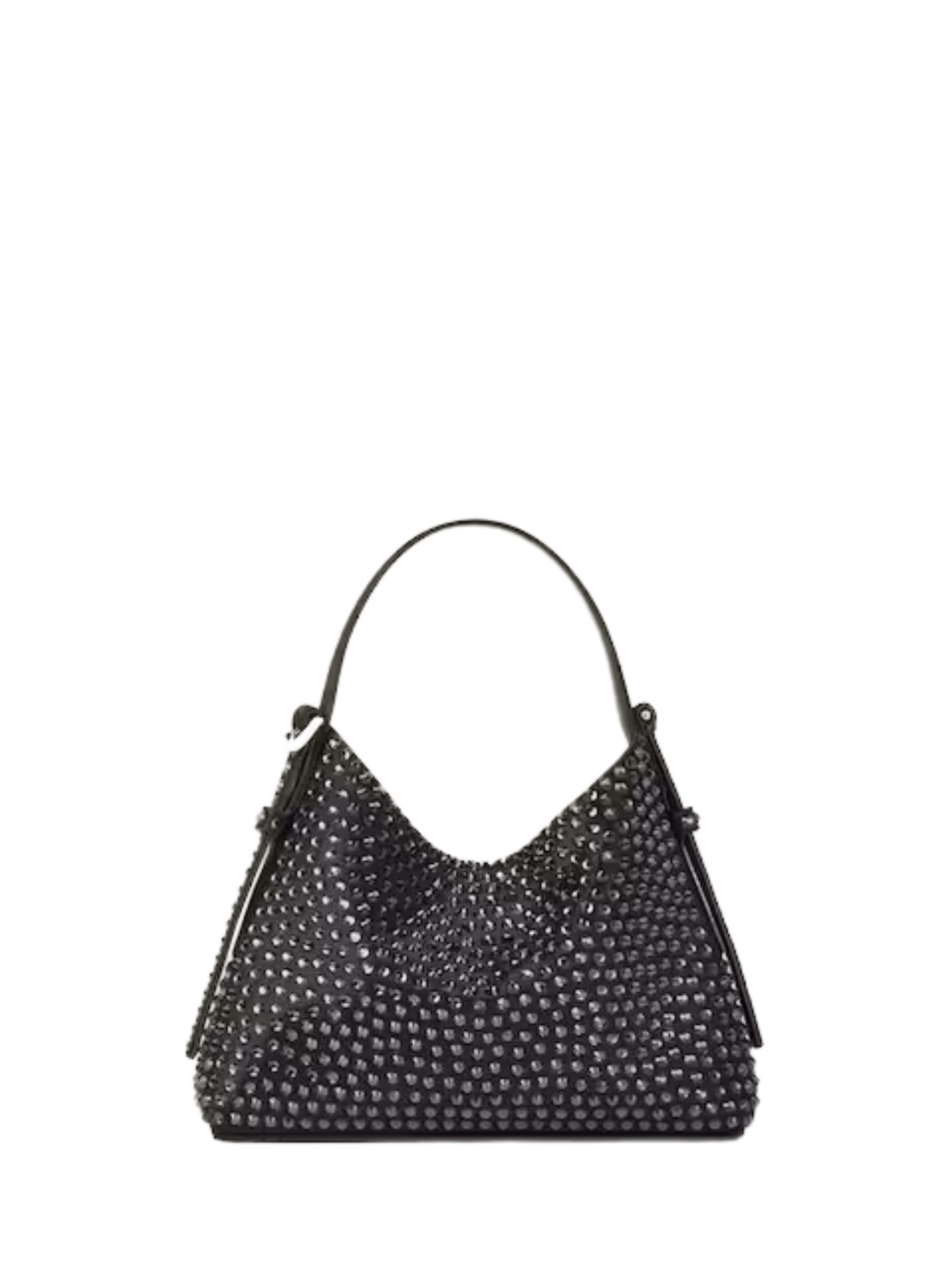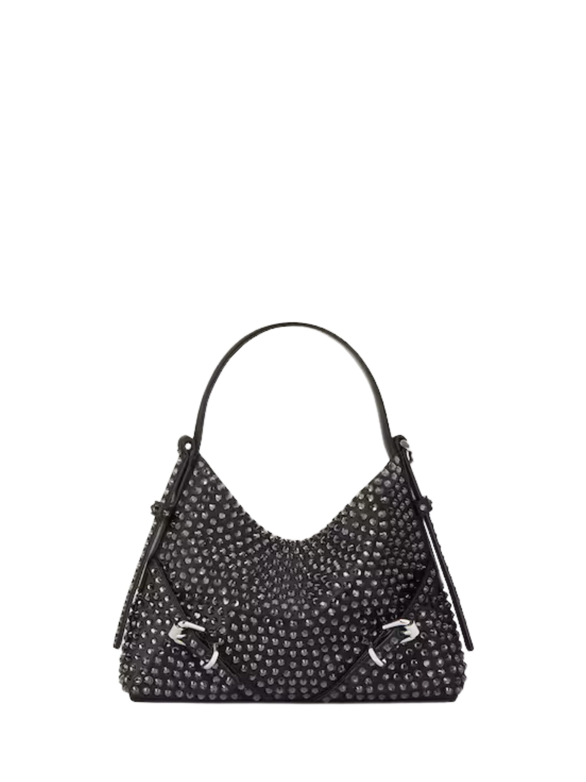 GIVENCHY Voyou bag in black viscose and silk, featuring all-over rhinestones, a top handle, a top opening, a Givenchy-engraved metal buckle, a removable shoulder strap, and a canvas lining. Dimensions: 18 x 13.5 x 3.5 cm.