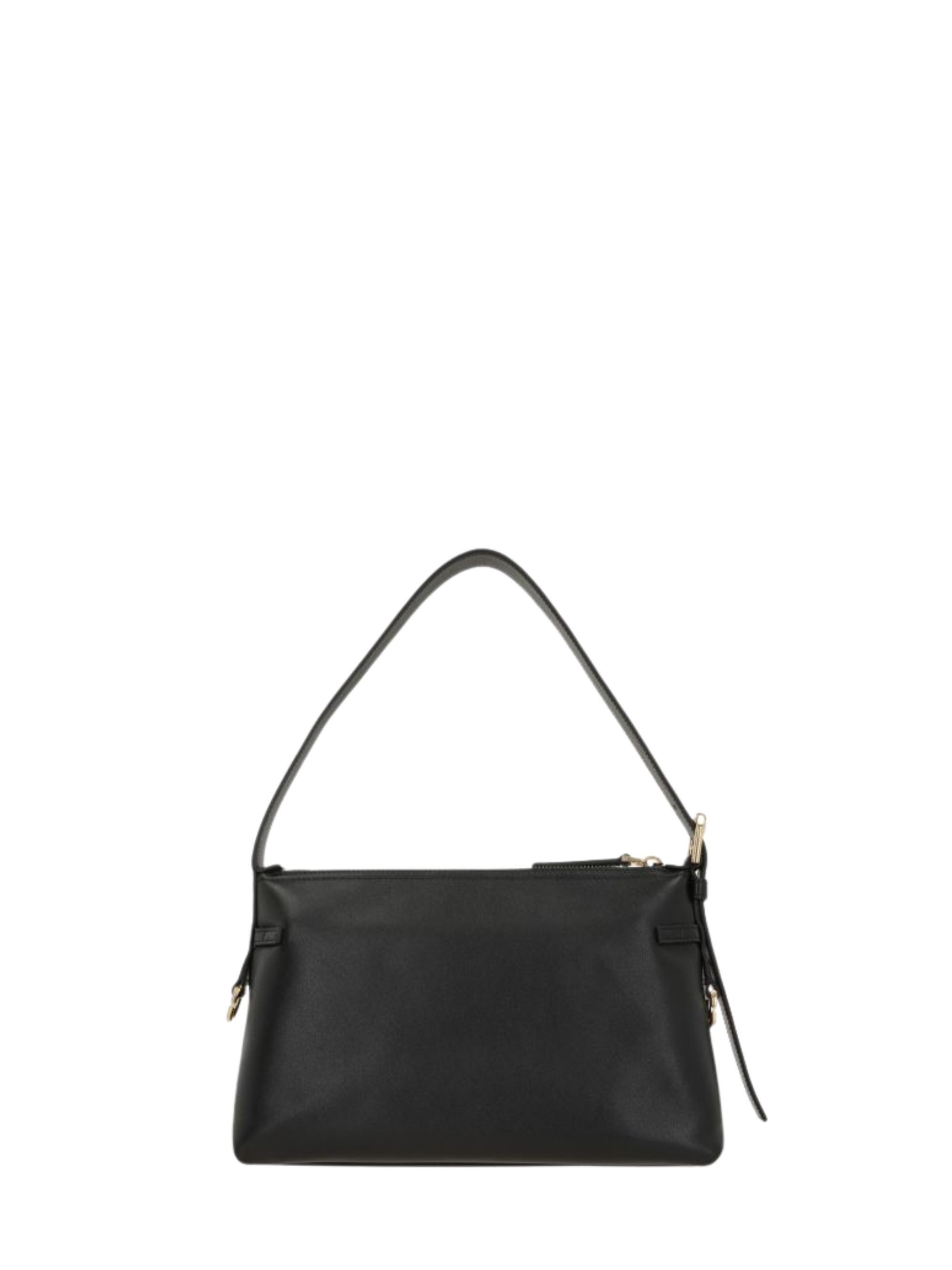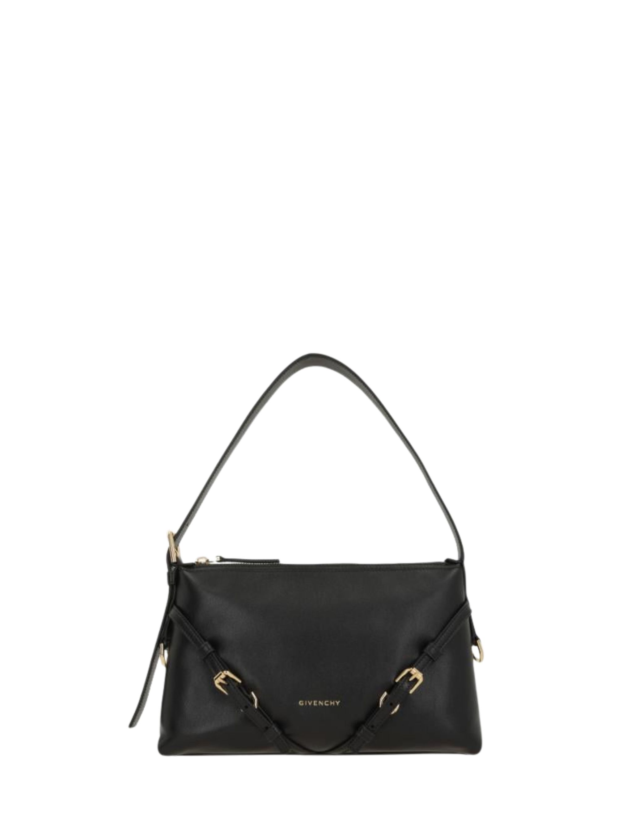 GIVENCHY Voyou mini bag in black leather, featuring gold hardware, adjustable buckles on the front, zip closure, adjustable shoulder strap, and embossed logo lettering on the front. Dimensions: 29.5 x 16.5 x 11 cm.