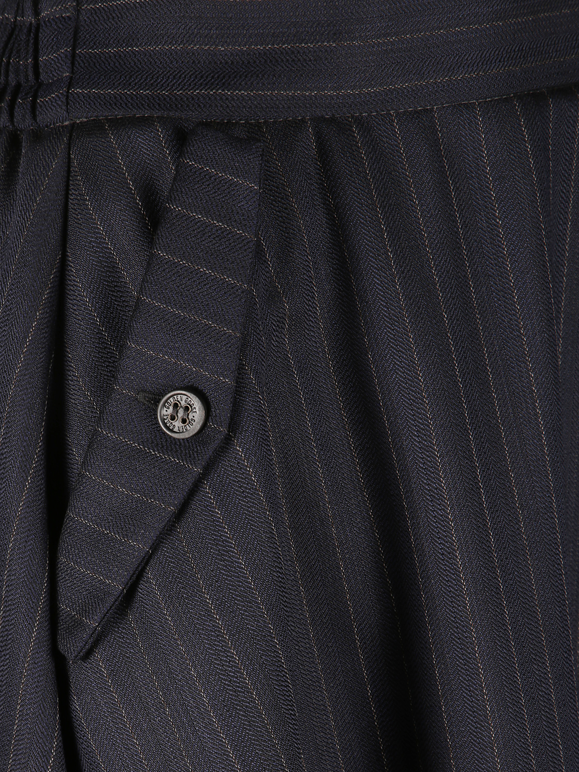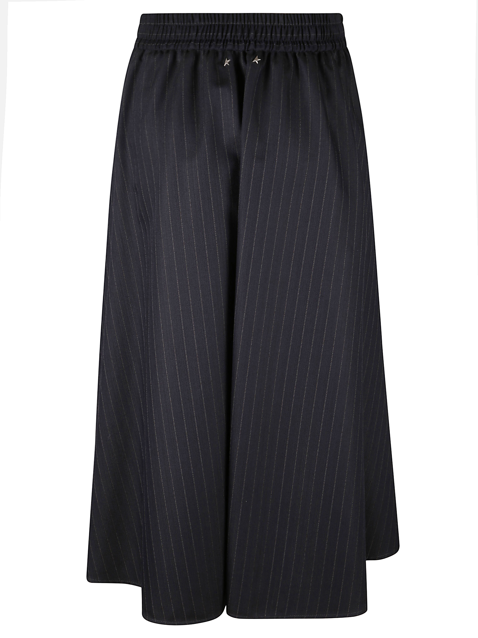 Blue wool circle skirt with pockets by GOLDEN GOOSE, featuring an elasticated waist, thin vertical stripes and two front patch pockets.
