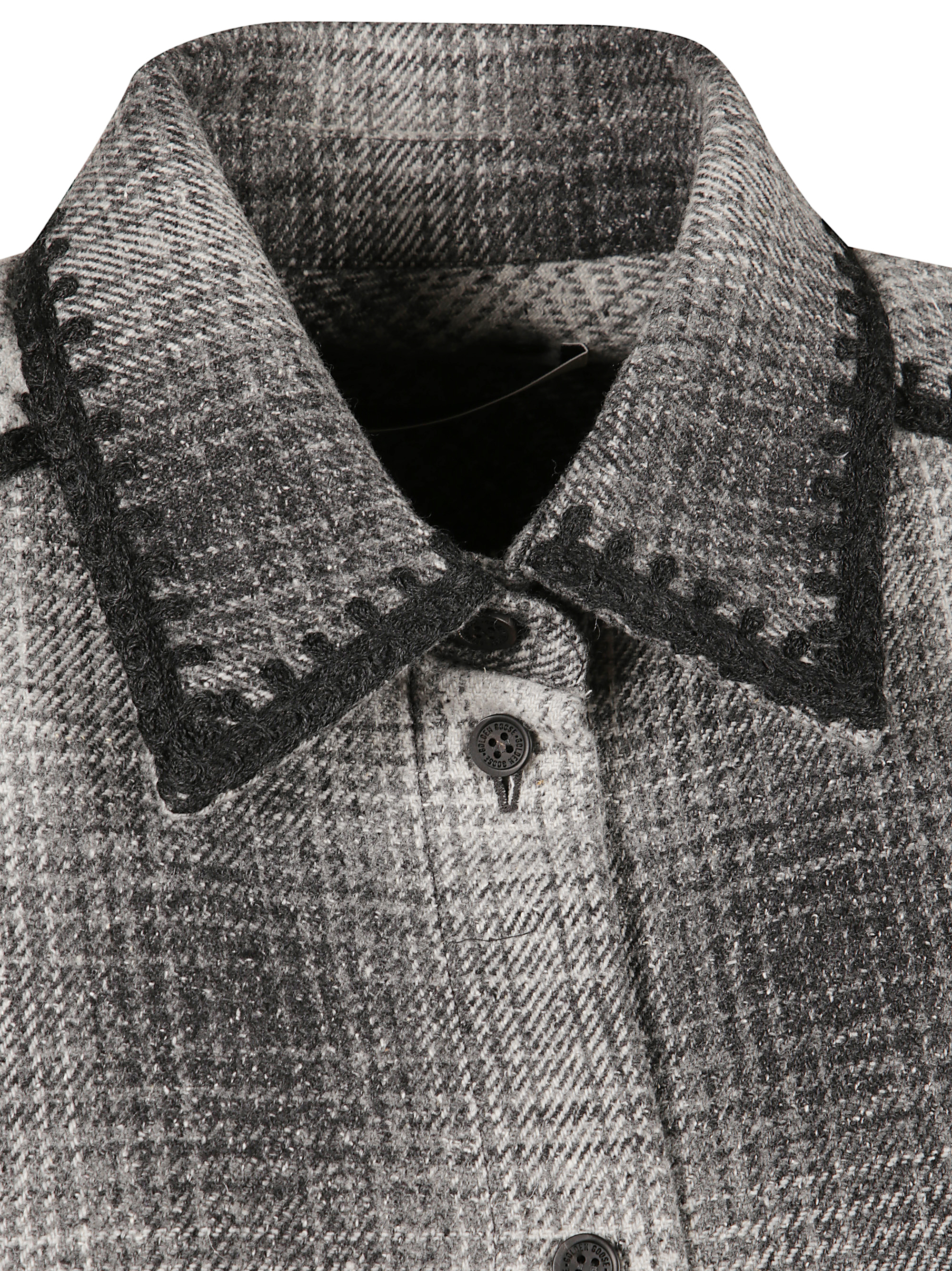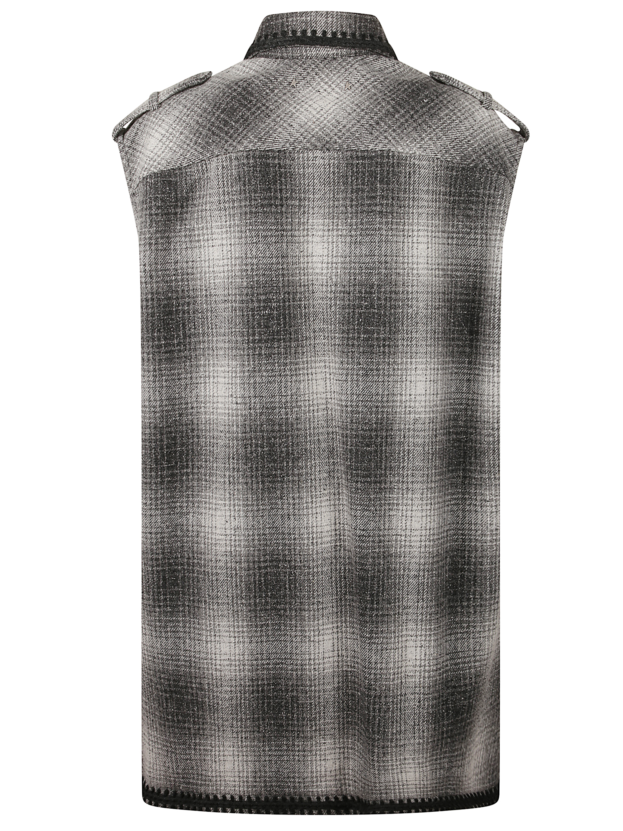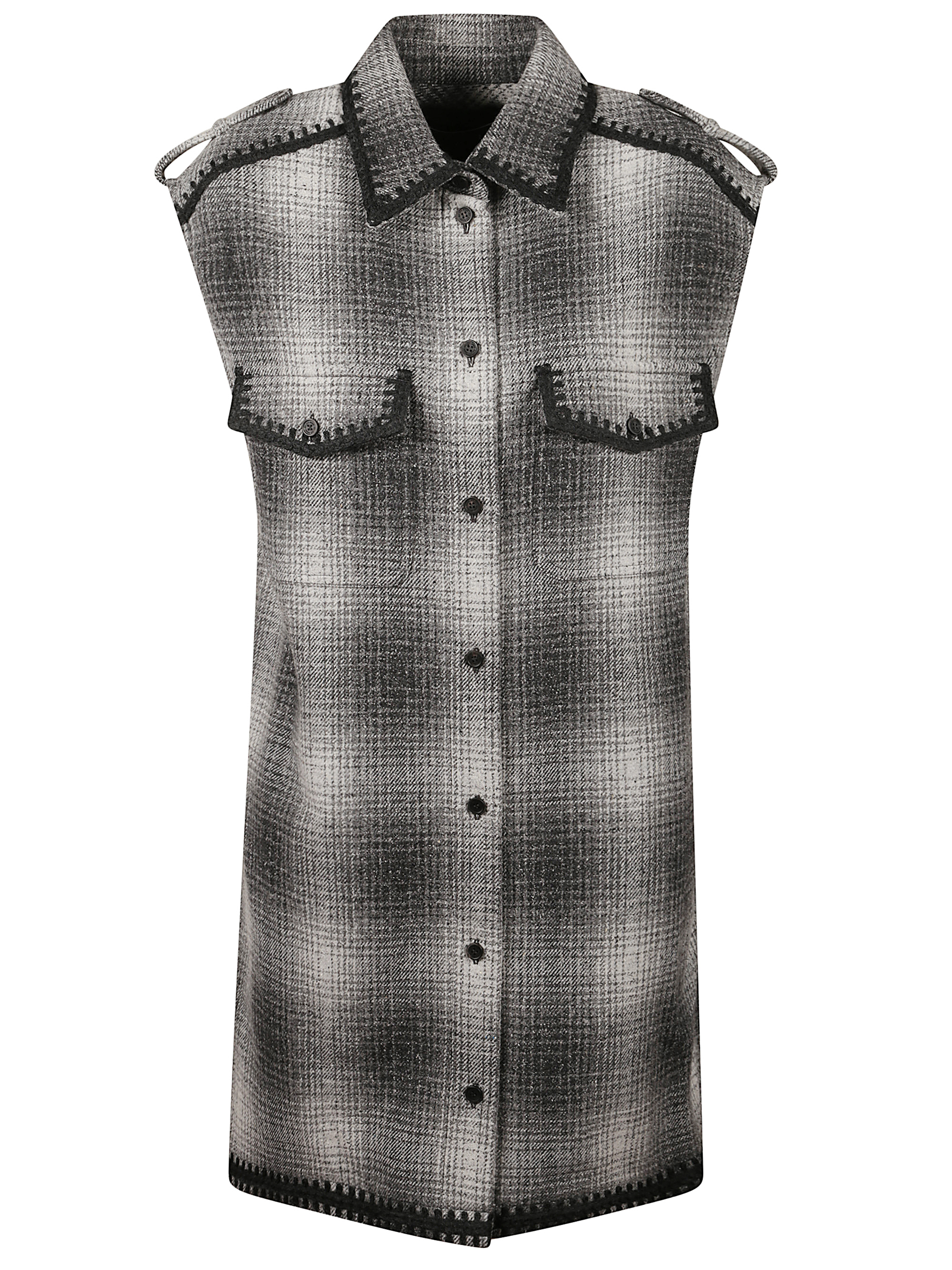 Sleeveless checked shirt dress by GOLDEN GOOSE in grey wool, featuring two patch pockets, a light grey checked pattern, a black button fastening and black embroidery on the edges.