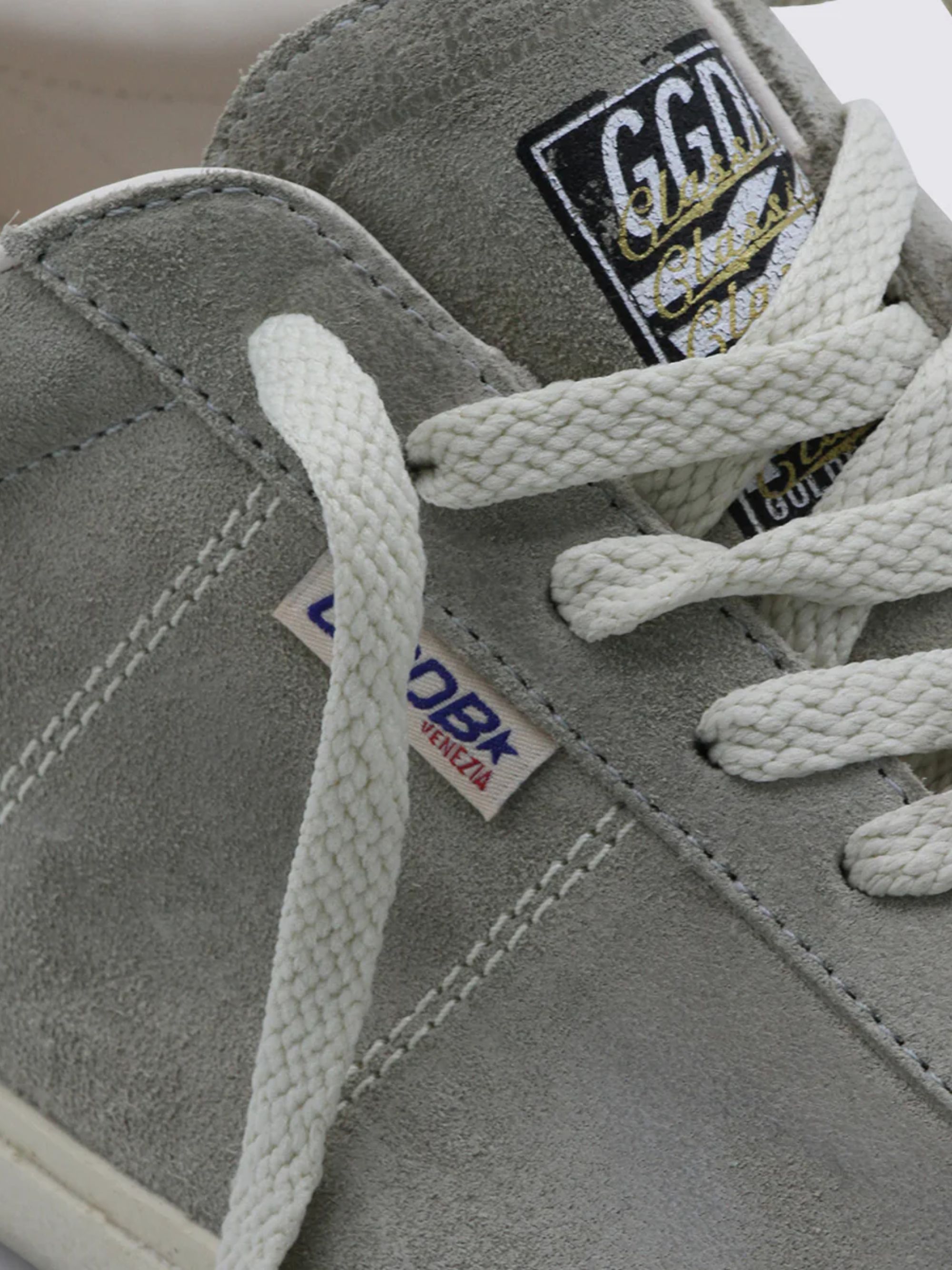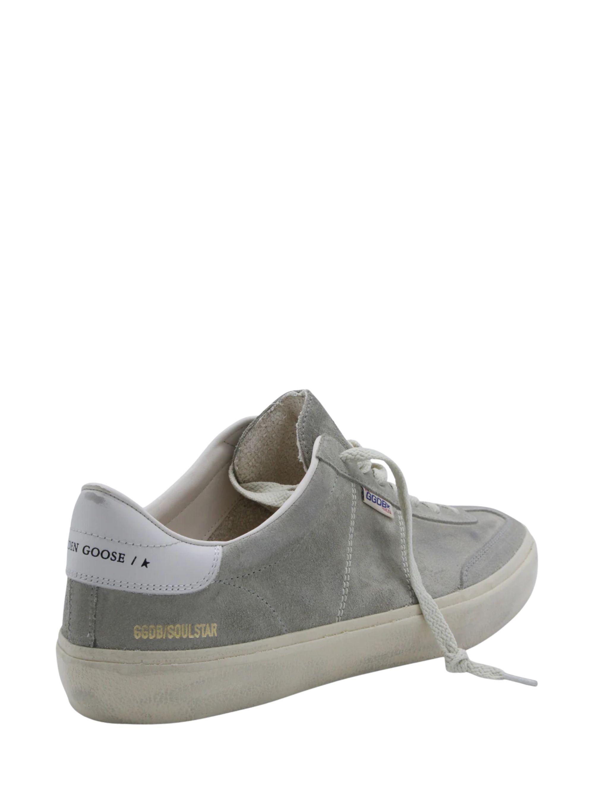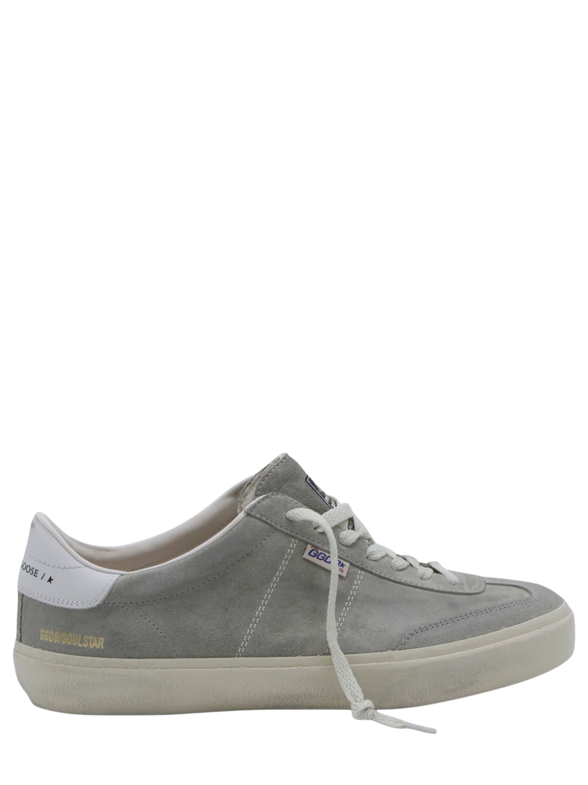 Soul Star sneaker by GOLDEN GOOSE in grey suede, featuring white leather heel tab, lace-up fastening, lived-in treatment, applied label and rubber sole.