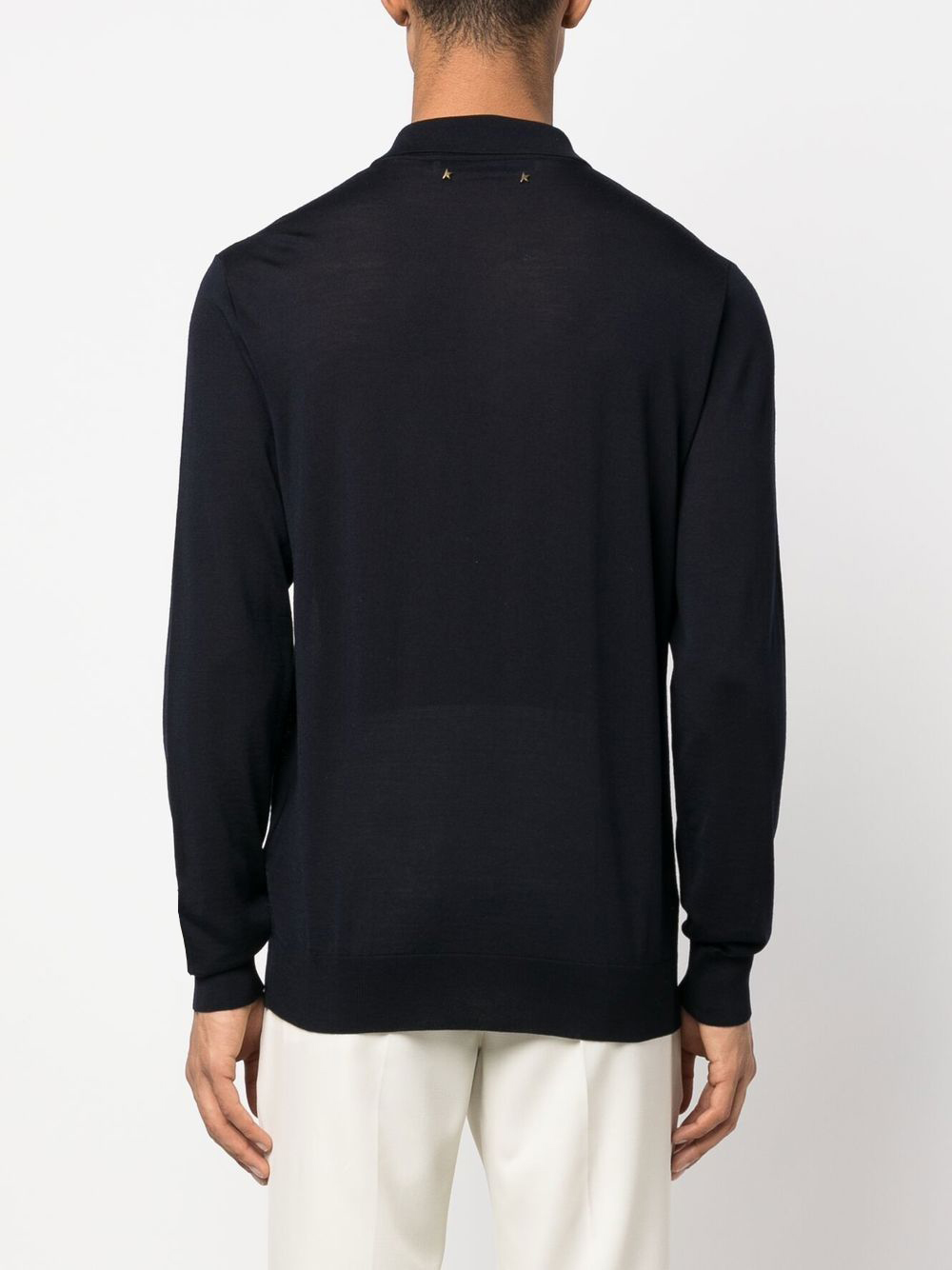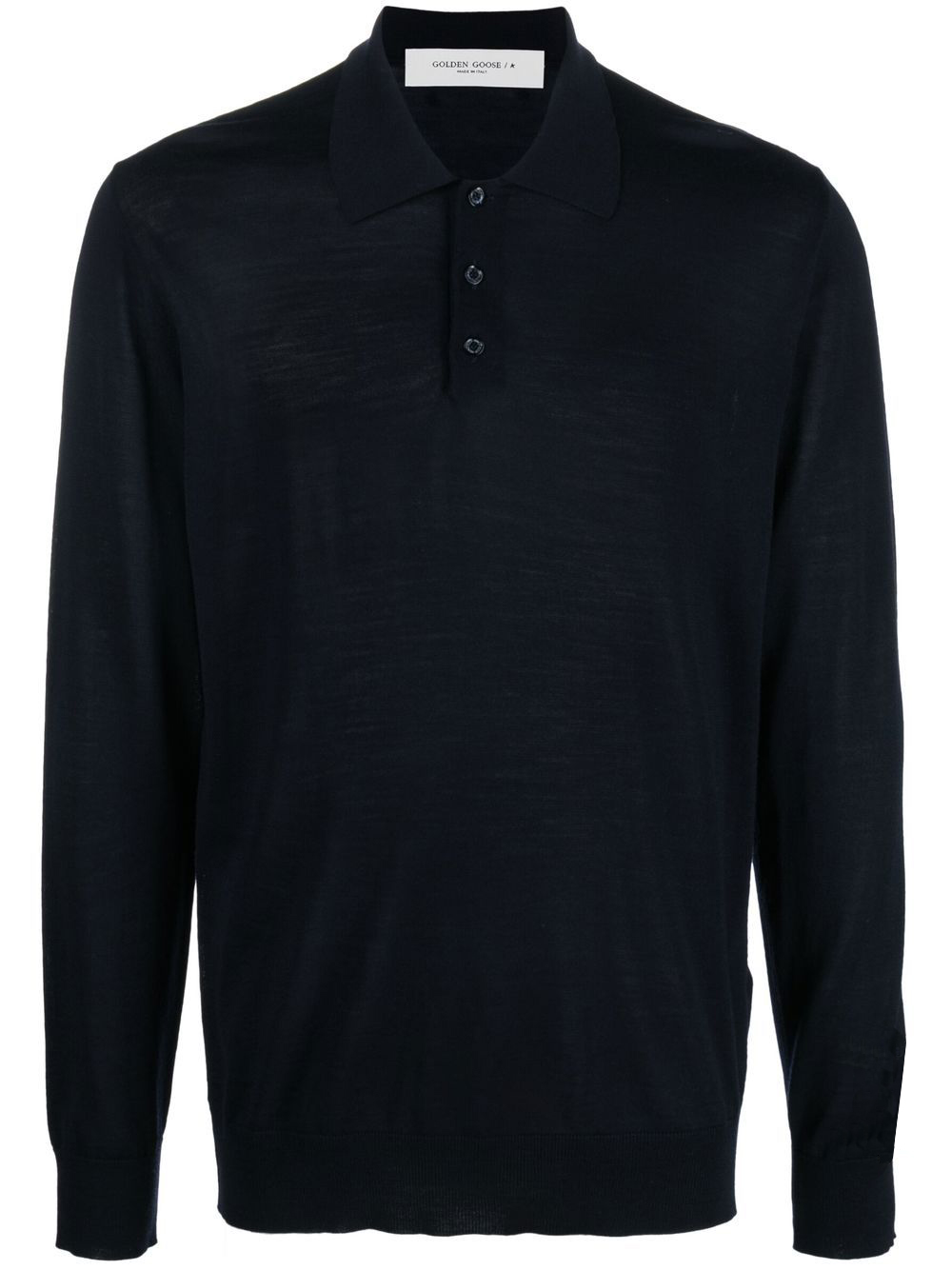 GOLDEN GOOSE navy blue virgin wool polo shirt with a classic collar, front button placket, long sleeves, and a straight hem.