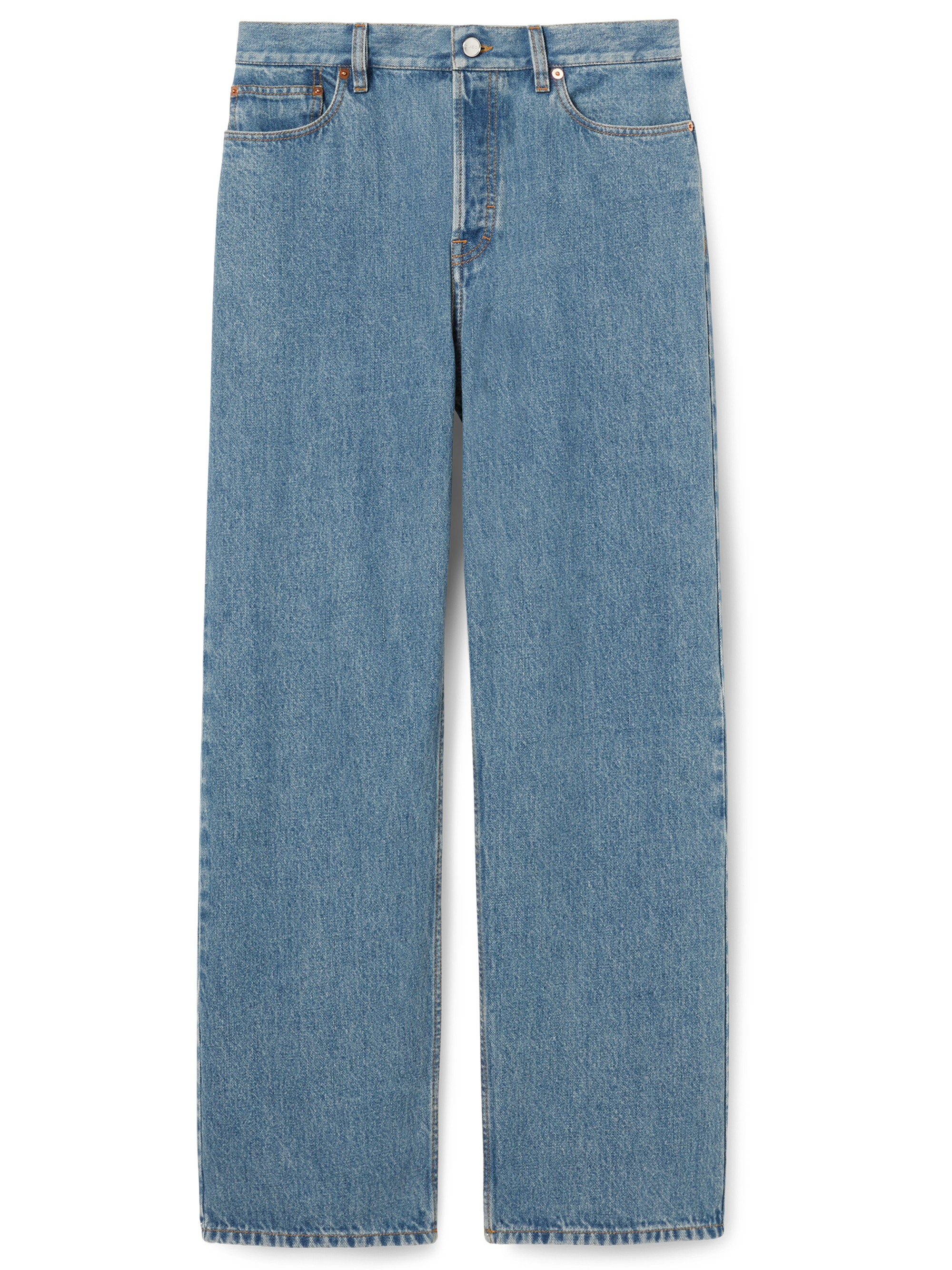 GUCCI medium blue cotton Baggy jeans with wide leg, five-pocket design and zip and button fastening.