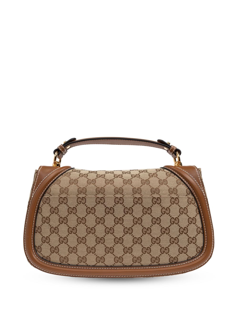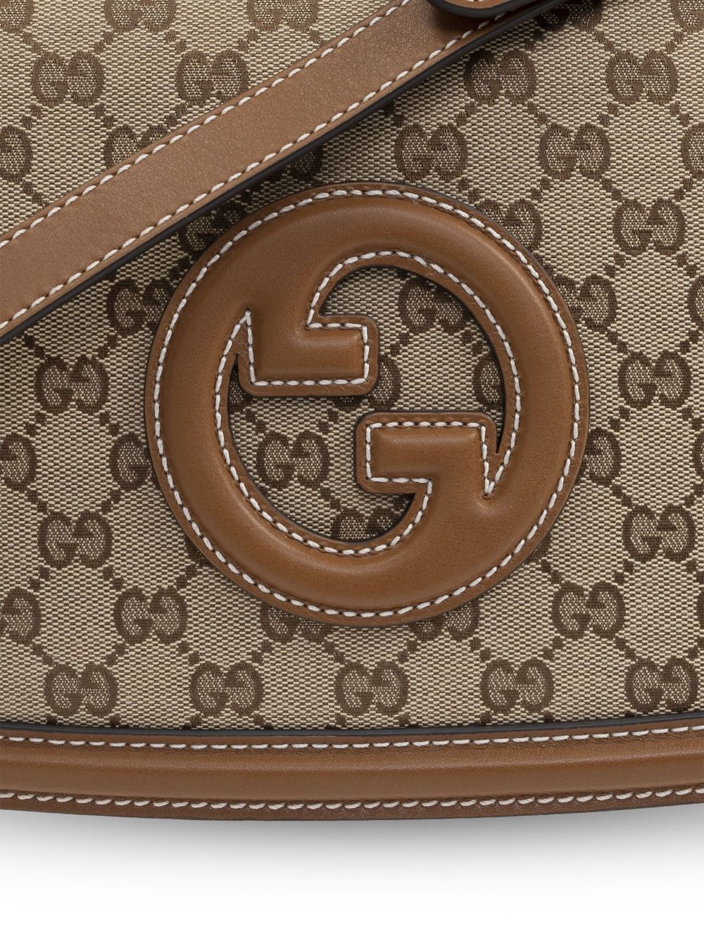 GUCCI Blondie handbag in beige and dark brown in fabric with leather trim, cotton and linen lining, round GG crossover, open pocket on the back and magnetic closure.