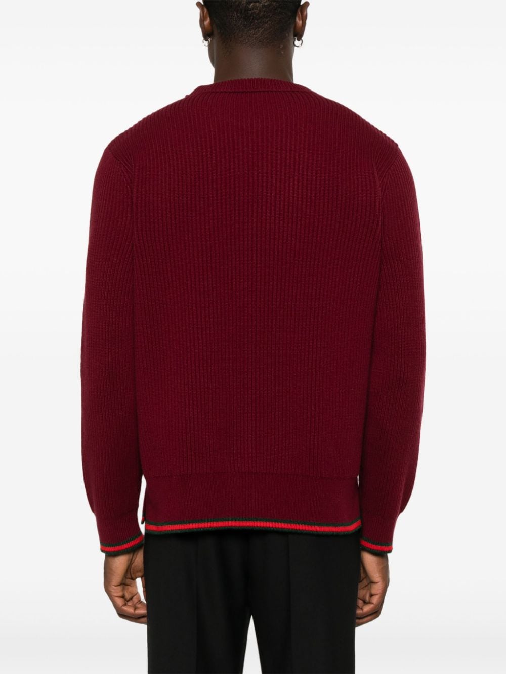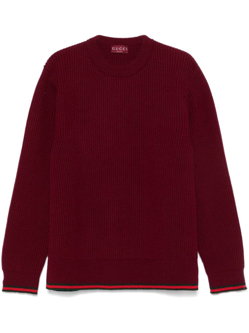 GUCCI burgundy crewneck sweater in a cashmere and wool blend with ribbed knit, side slits and signature Web detail.