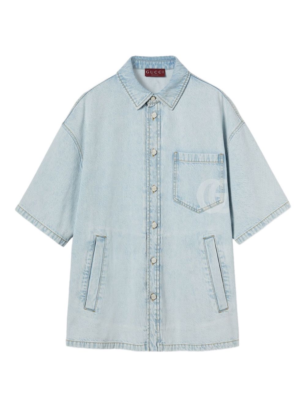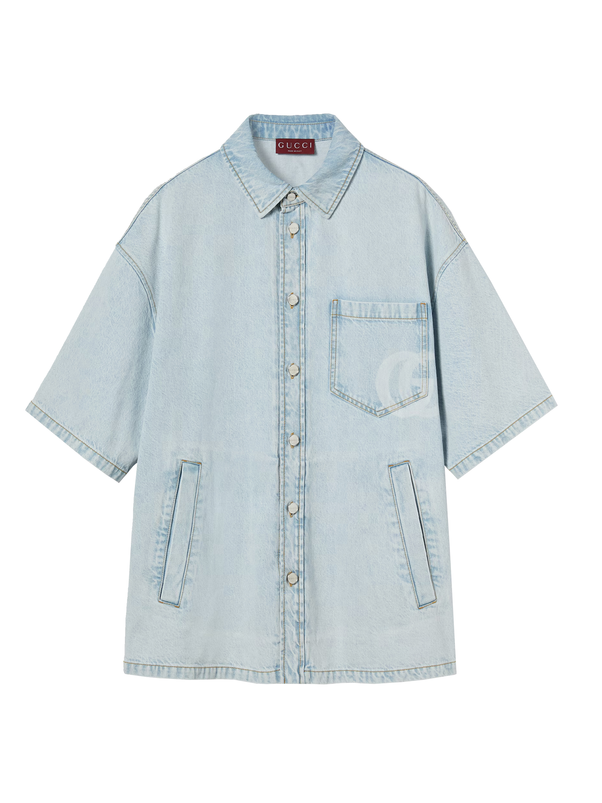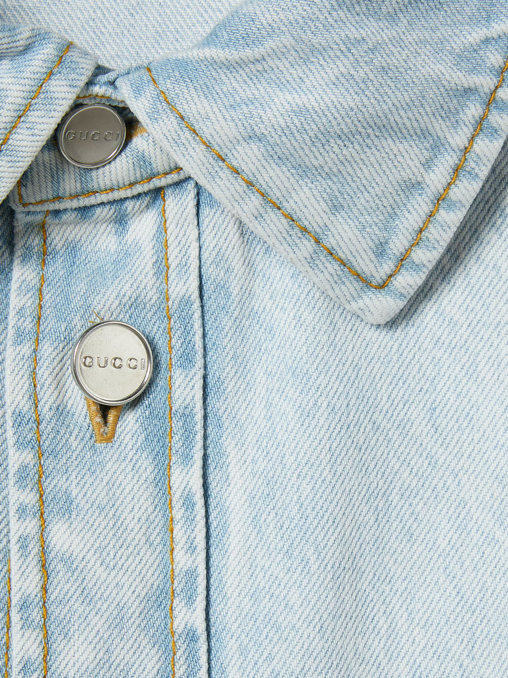 GUCCI denim shirt in light blue certified cotton, with lasered Gucci Made in Italy Liftboy crest, pointed collar, low shoulders, chest pocket, side pockets, side vents with snap buttons and button closure.