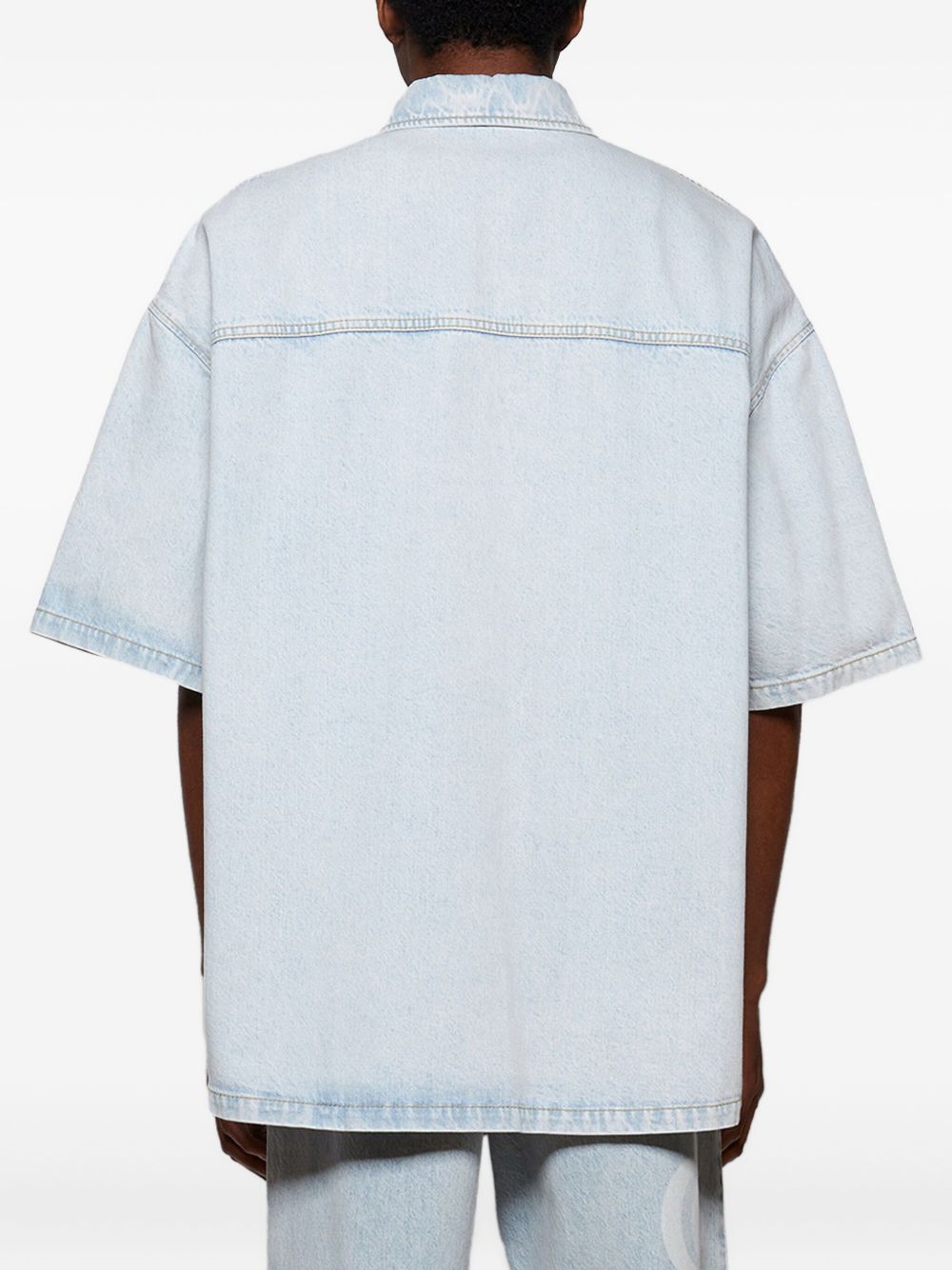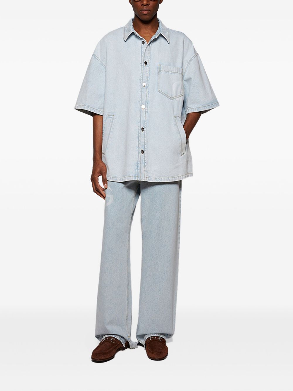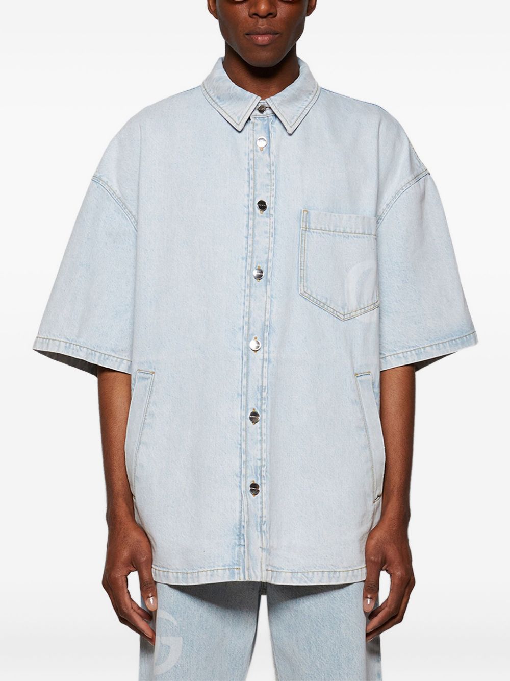 GUCCI denim shirt in light blue certified cotton, with lasered Gucci Made in Italy Liftboy crest, pointed collar, low shoulders, chest pocket, side pockets, side vents with snap buttons and button closure.