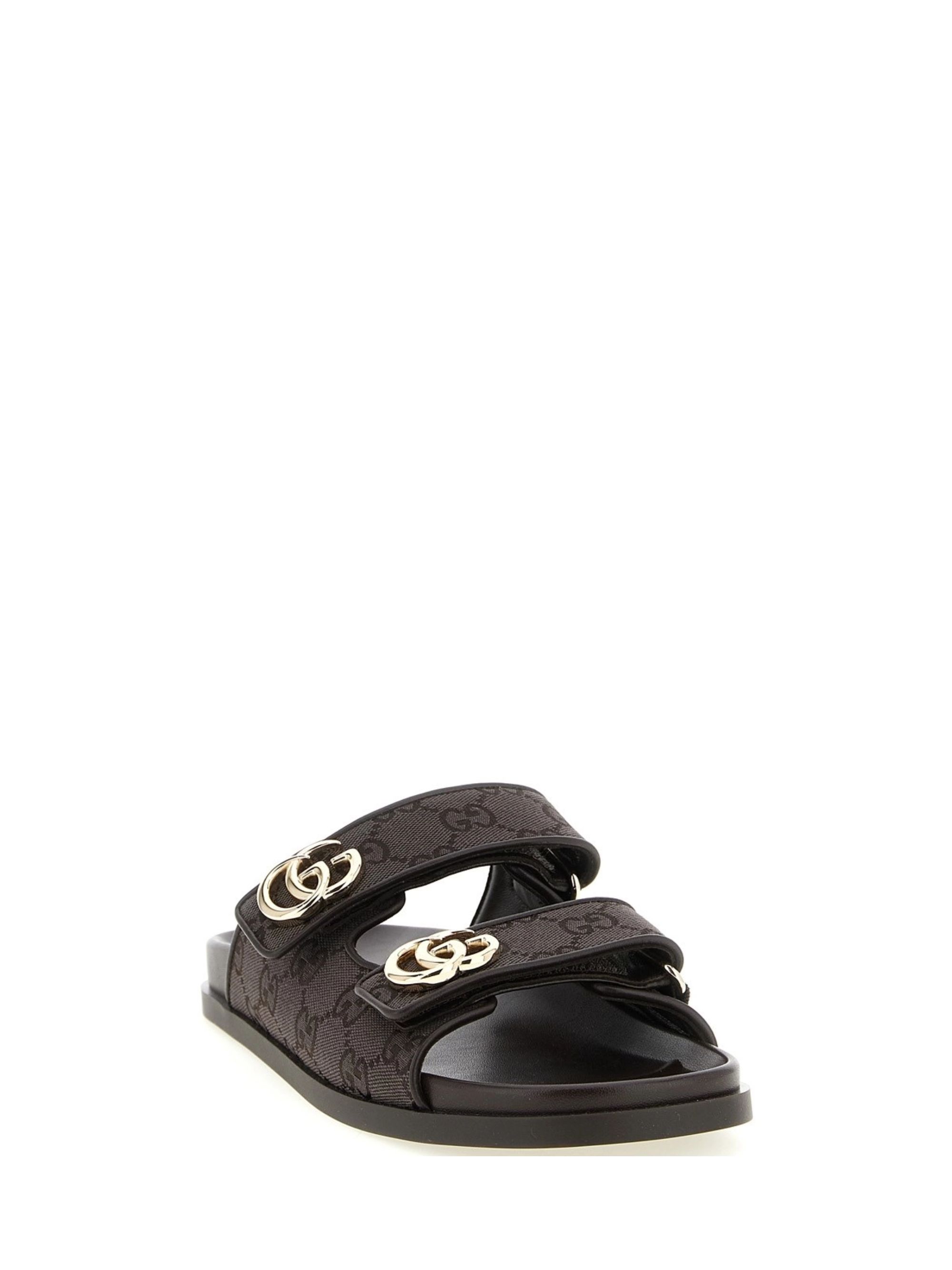 GUCCI brown GG canvas Double G sandal featuring gold hardware, Double G and strap with velcro closure.
