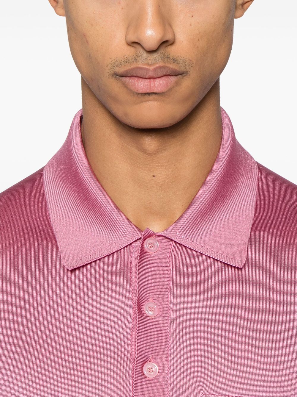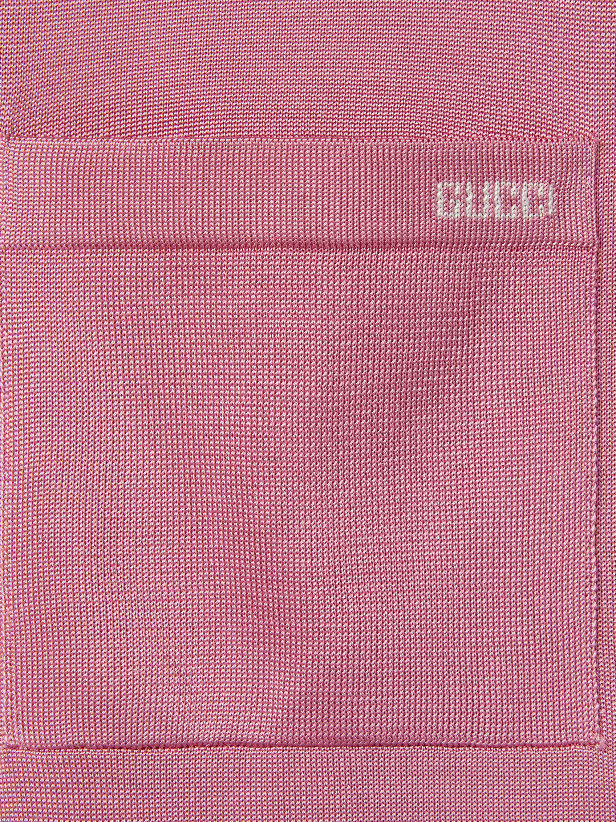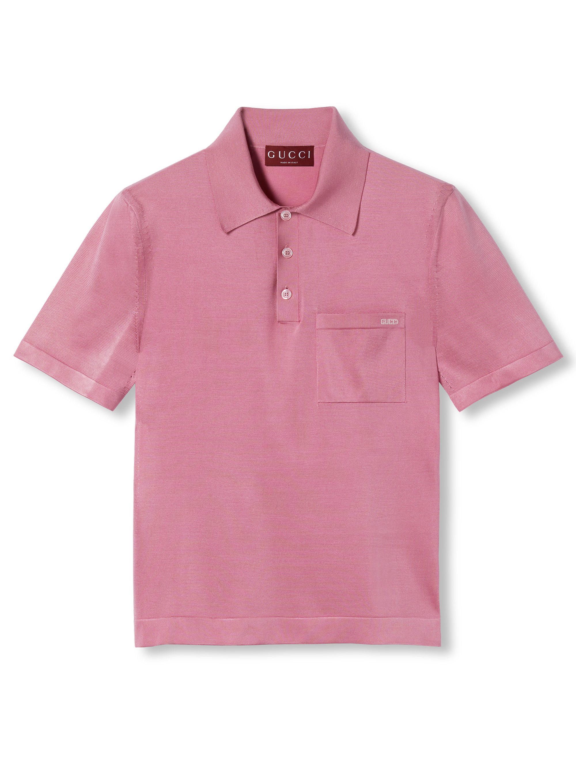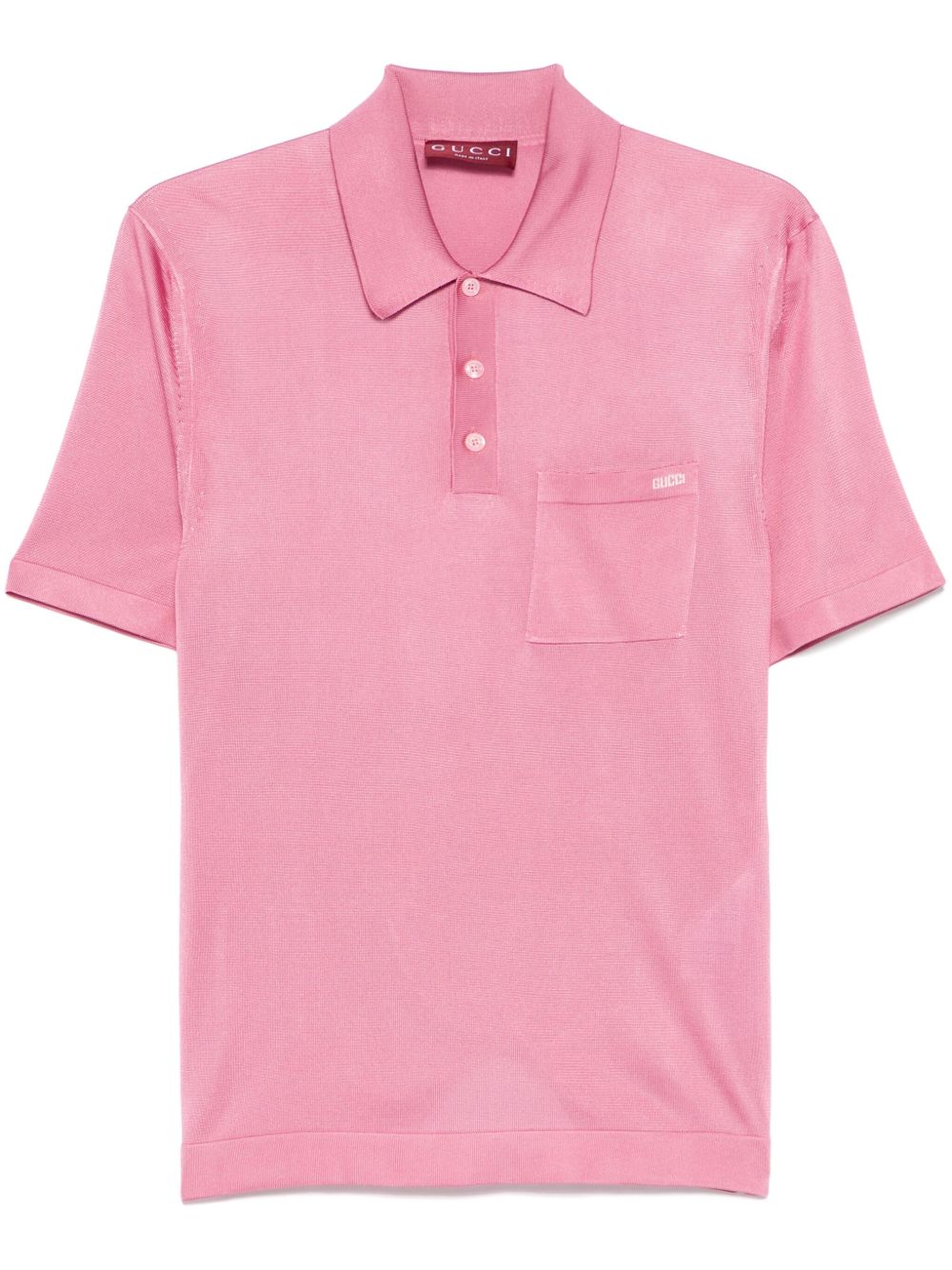 GUCCI pink fine silk knit polo shirt with collar, short sleeves, chest pocket and half button fastening.
