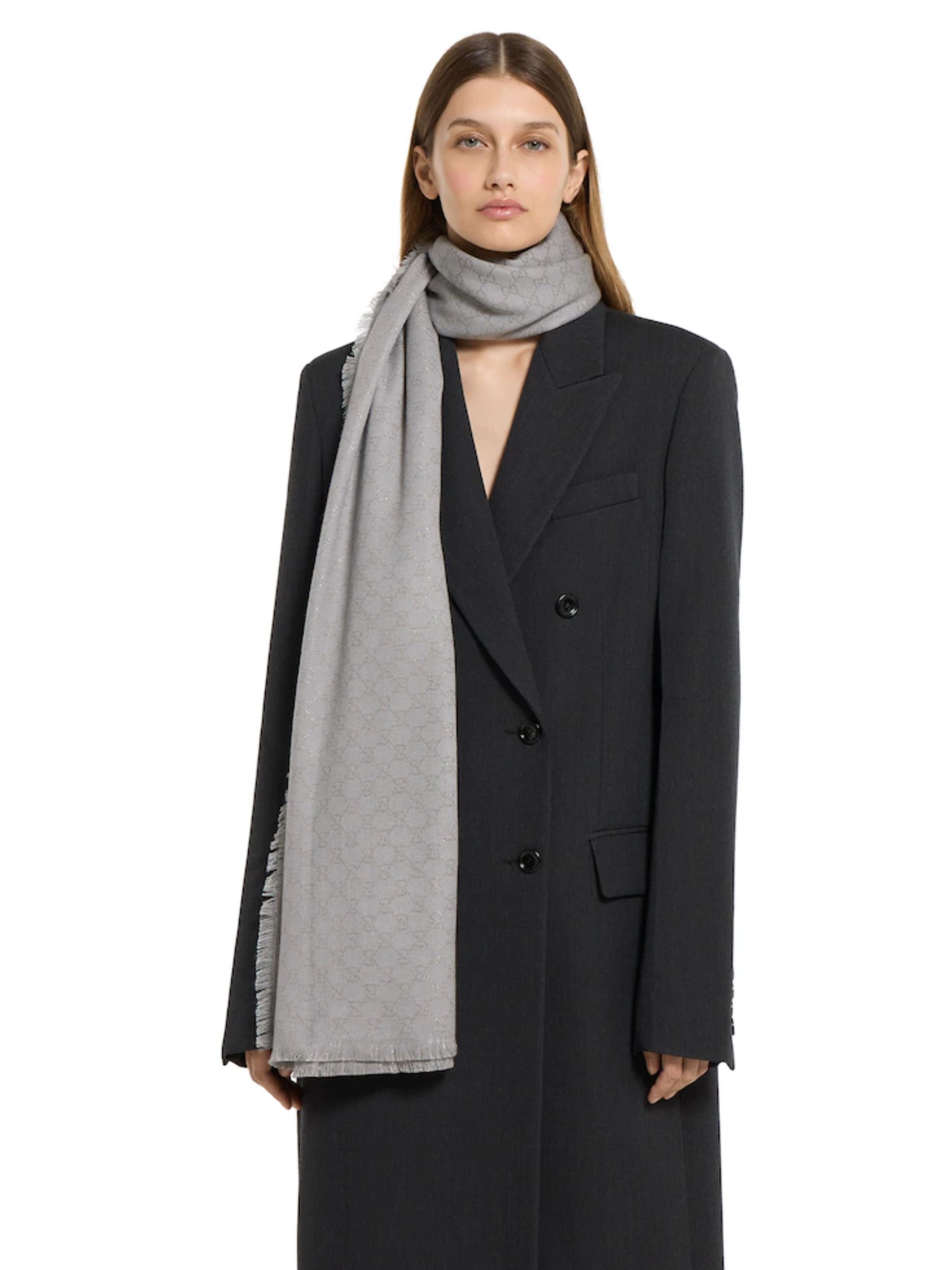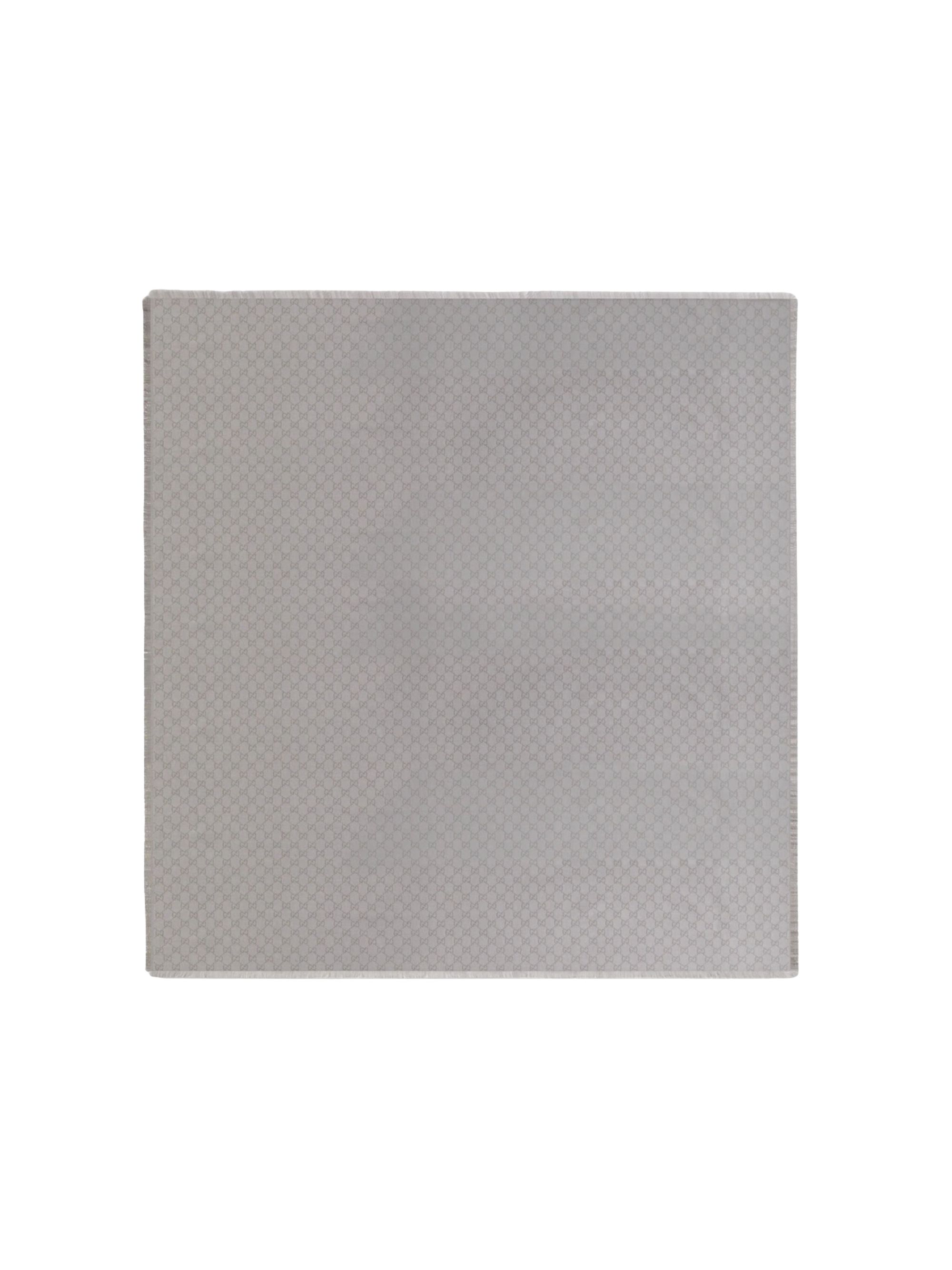 GUCCI GG lamé silk and wool scarf in gray. Dimensions: 130 x 130 cm.