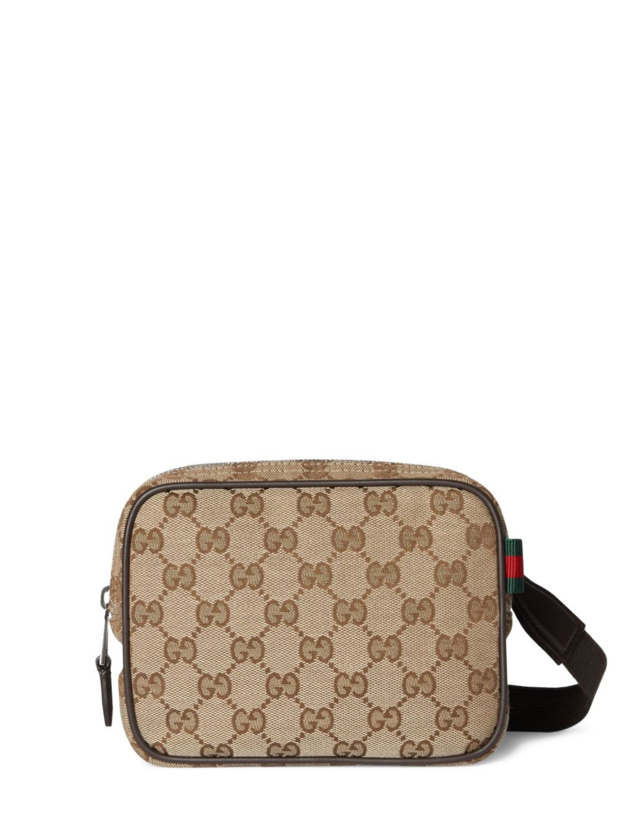 Brown GUCCI bag in GG Supreme fabric and leather with removable and adjustable fabric shoulder strap, external card slots and zip closure.