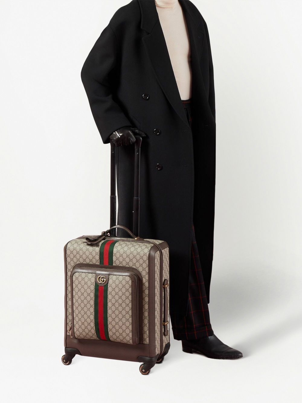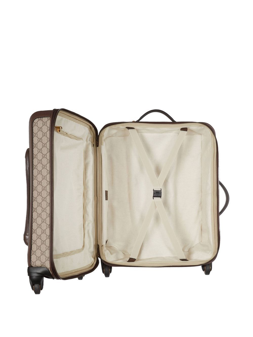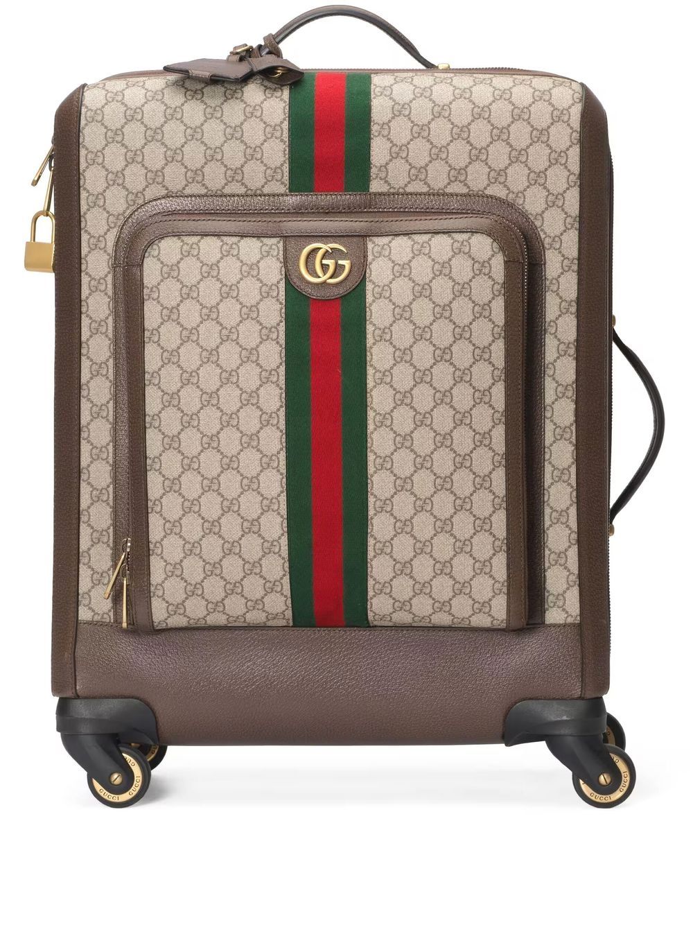 GUCCI bag in beige and dark brown fabric with leather trim, green and red Web detail, nylon lining, pockets and zip closure.