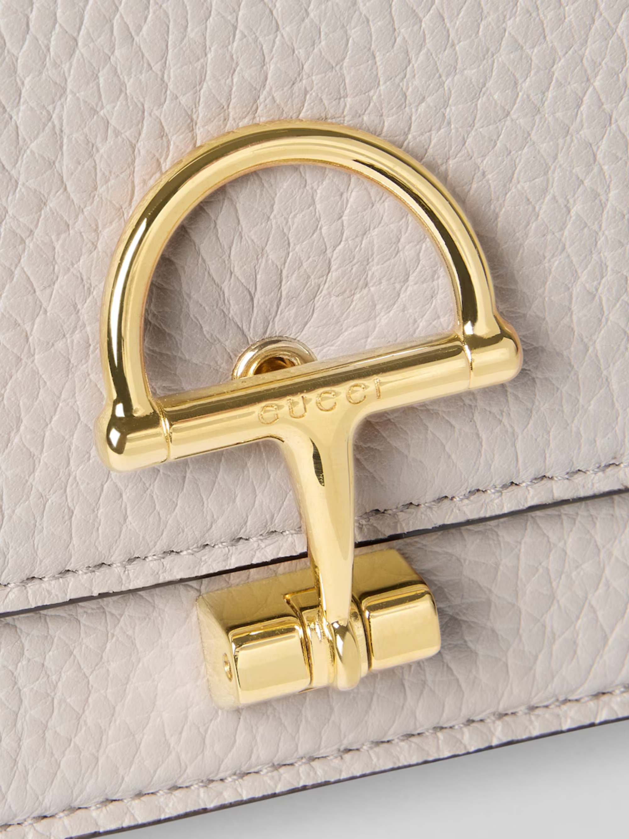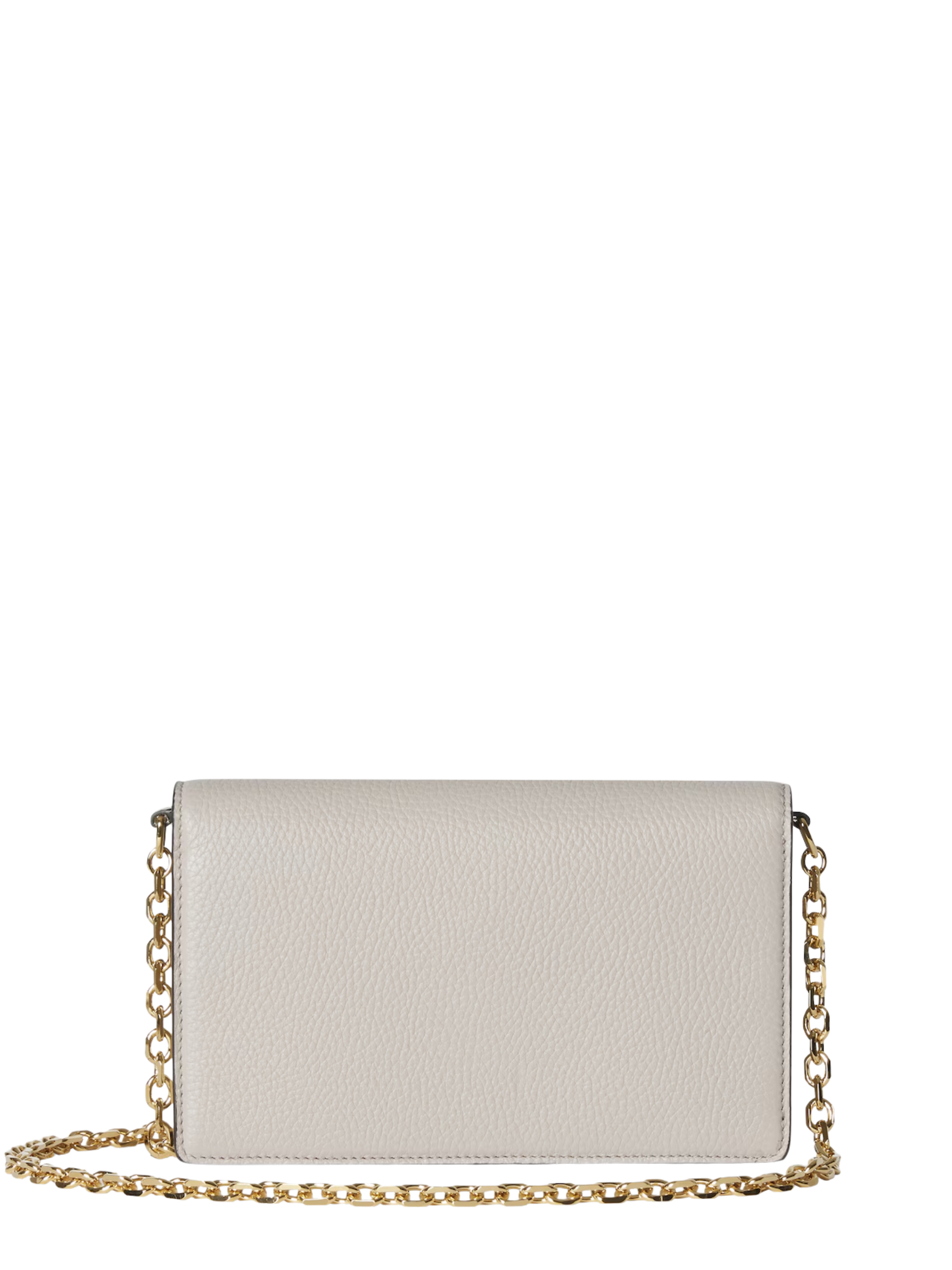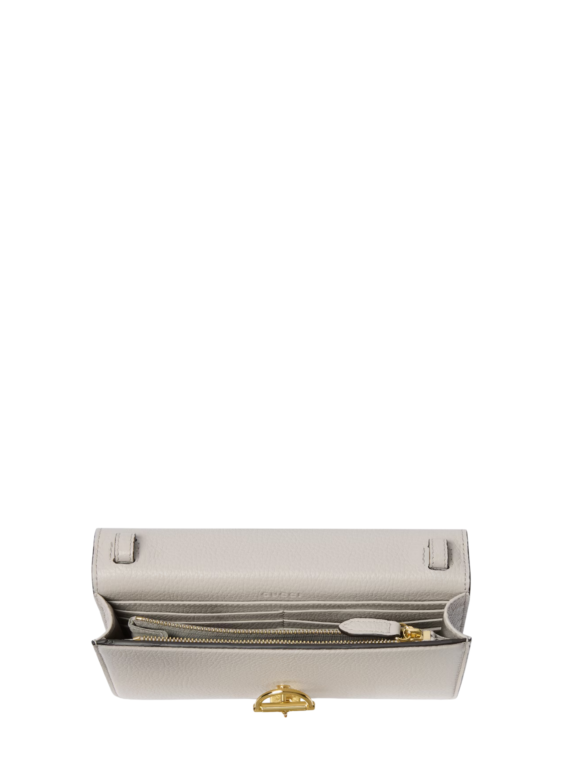 GUCCI Half Horsebit chain wallet in grey leather, featuring gold-tone hardware, a half horsebit, a removable chain shoulder strap, and a snap closure. Dimensions: 20 x 12 x 3.5 cm.