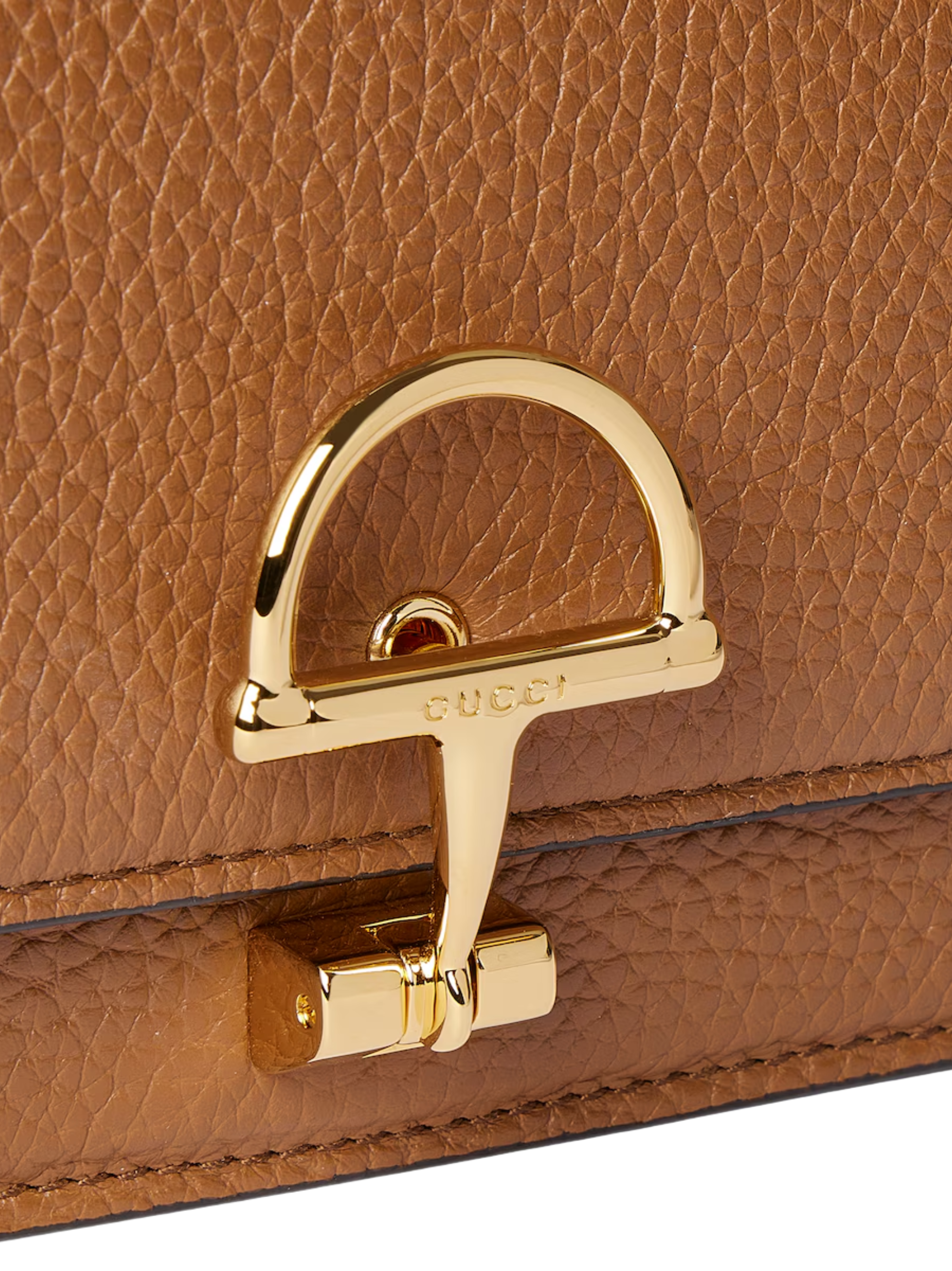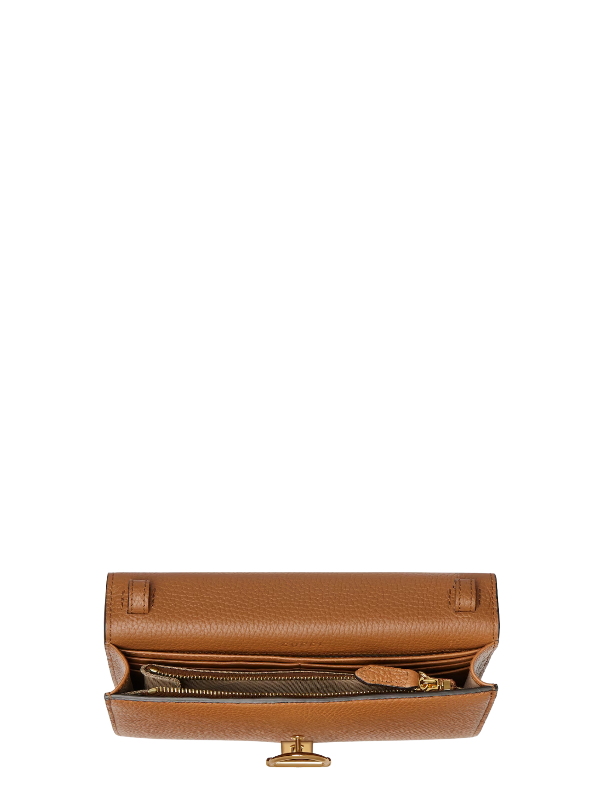 GUCCI Half Horsebit chain wallet in brown leather, featuring gold-tone hardware, a half horsebit, a removable chain shoulder strap, and a snap closure. Dimensions: 20 x 12 x 3.5 cm.