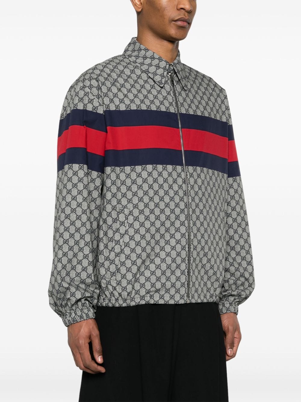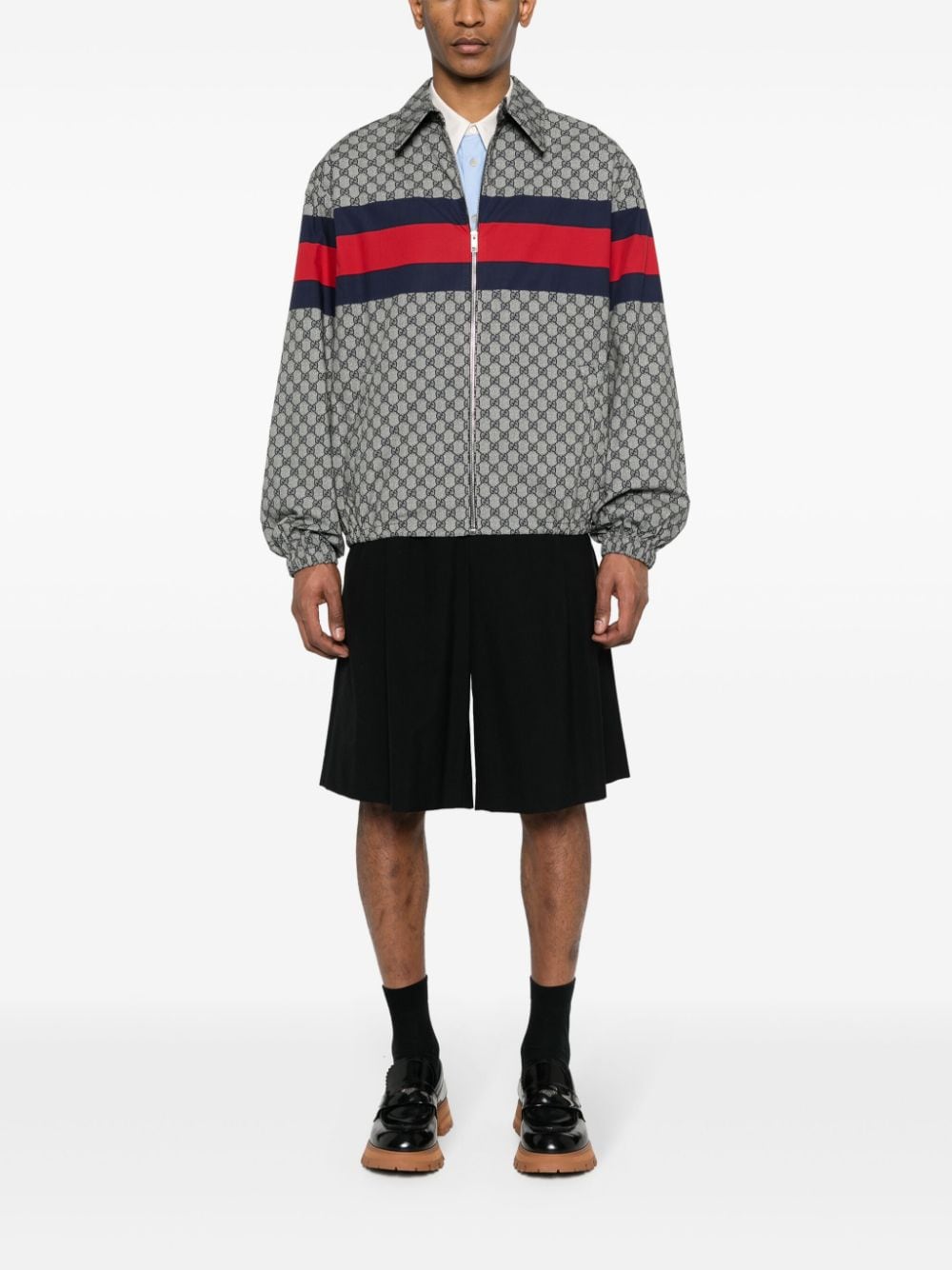 Cotton jacket by GUCCI characterized by GG print in shades of blue, Web stripe, shirt collar and zip closure.