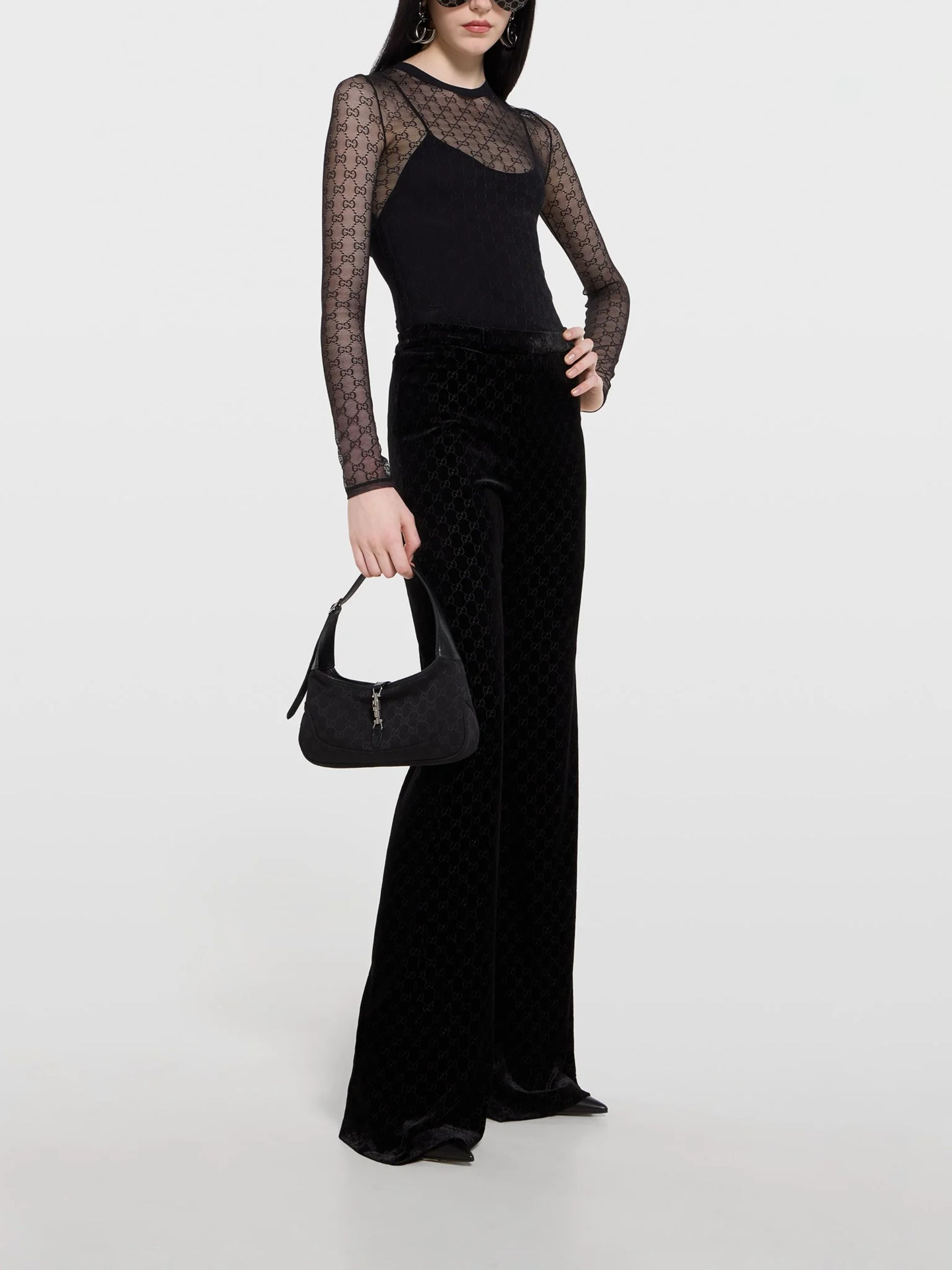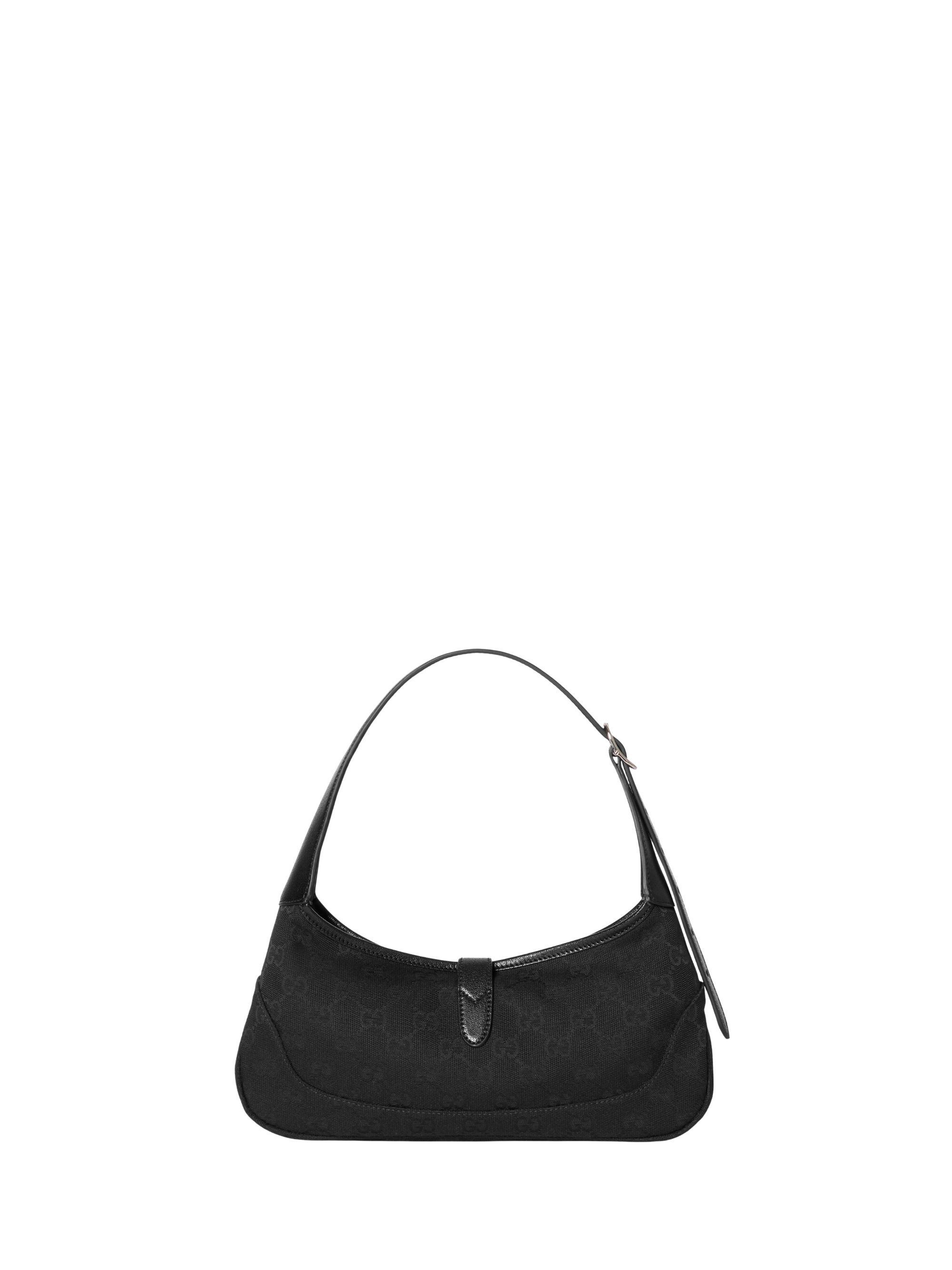 GUCCI Jackie Slim bag in black GG canvas, featuring leather trim, palladium-tone hardware, a plunger closure, Diamante fabric lining, and an adjustable shoulder strap and handle. Dimensions: 28 x 16 x 3.5 cm.