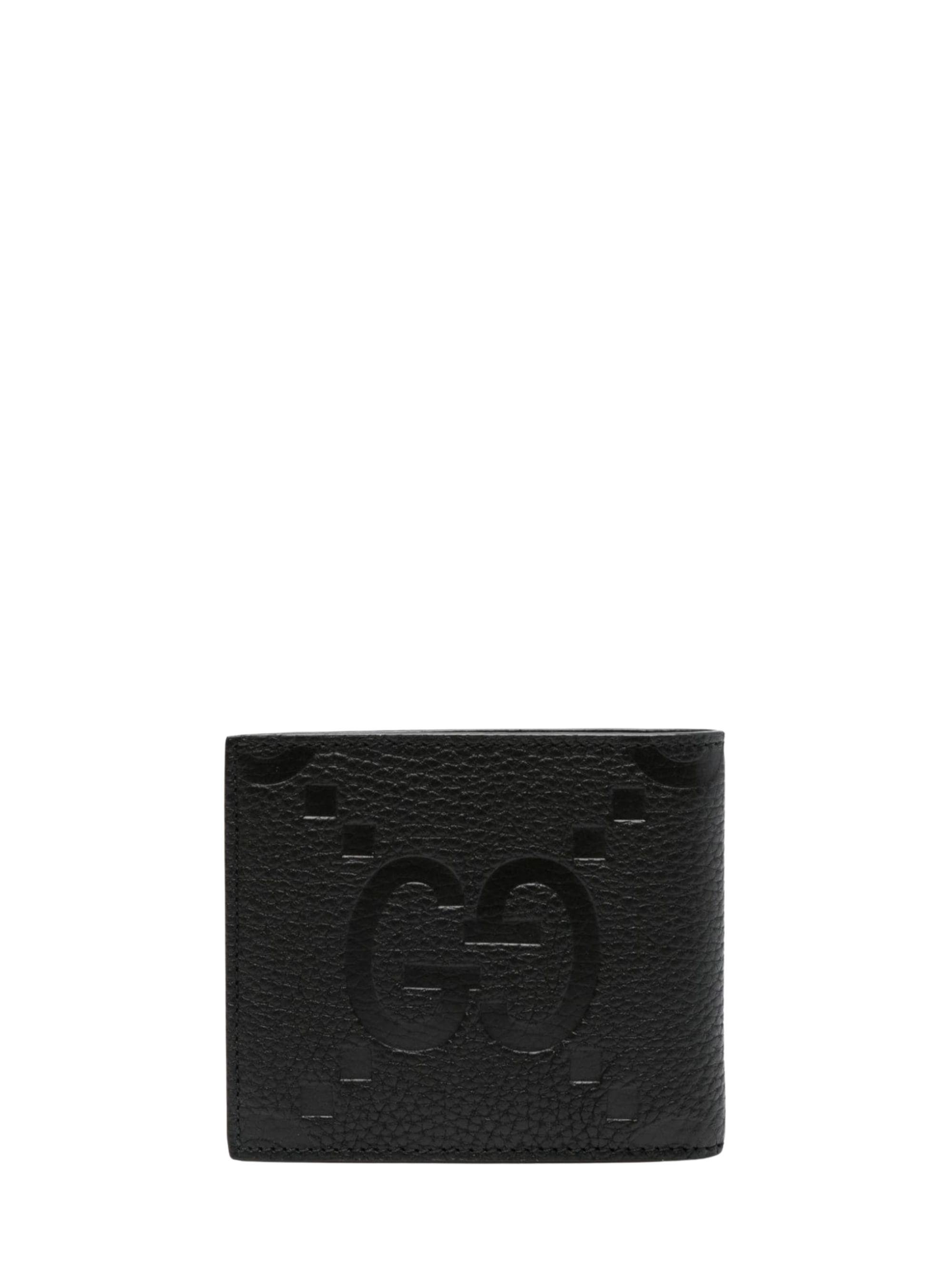 Logo wallet by GUCCI in black, featuring an all-over monogram logo, interior with slots for cards and banknotes.