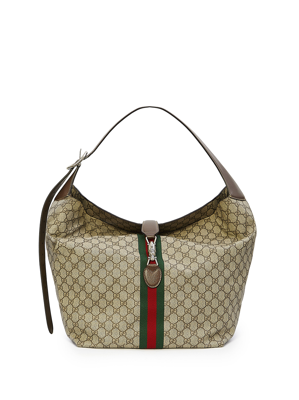 GUCCI logoed leather bag characterized by all-over texture, front web line, zip closure, adjustable handle with buckle