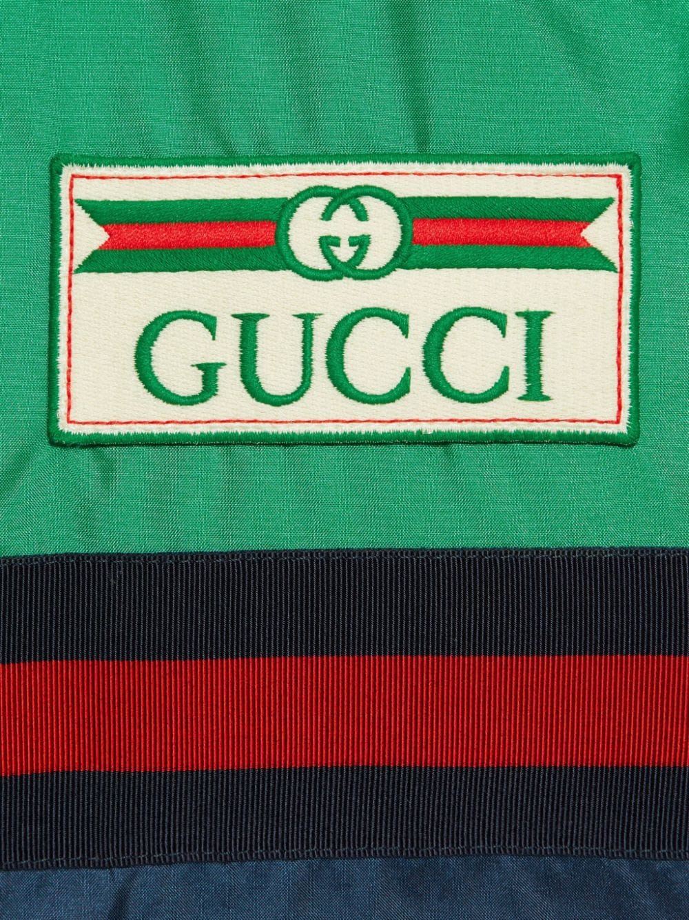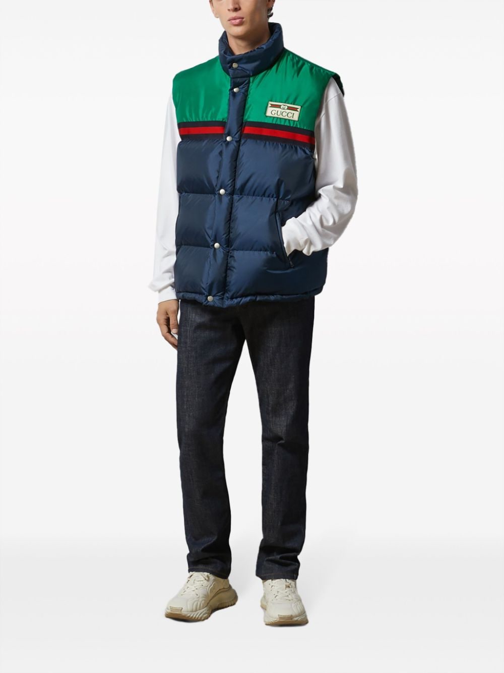 Padded vest by GUCCI in blue and green characterized by logo patch, sleeveless, button closure and drawstring waist.