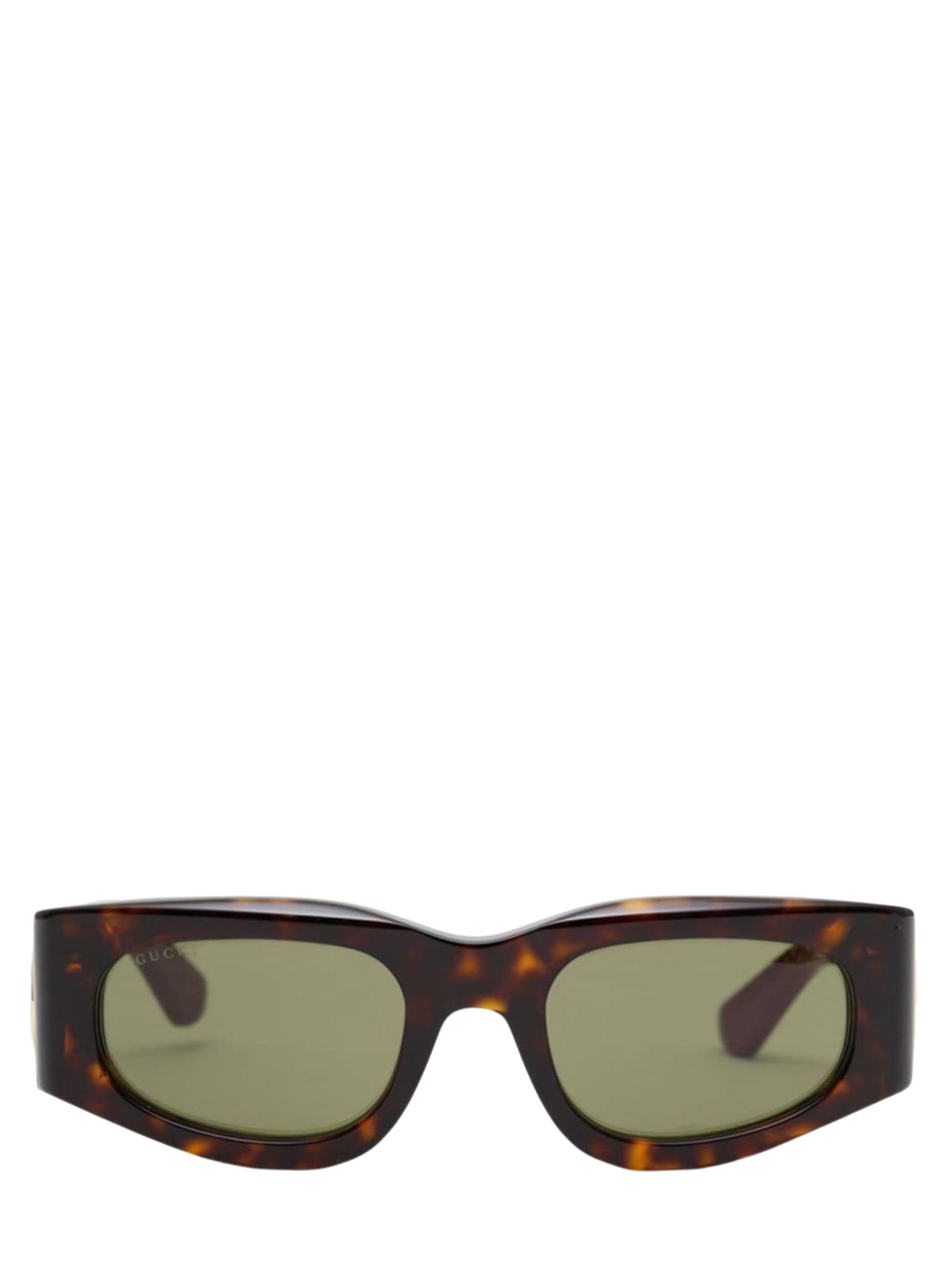 Brown rectangular sunglasses by GUCCI with tortoiseshell frame, double layer shiny green and red acetate temples with GG interlocking, dark green lenses with UVA/UVB protection.