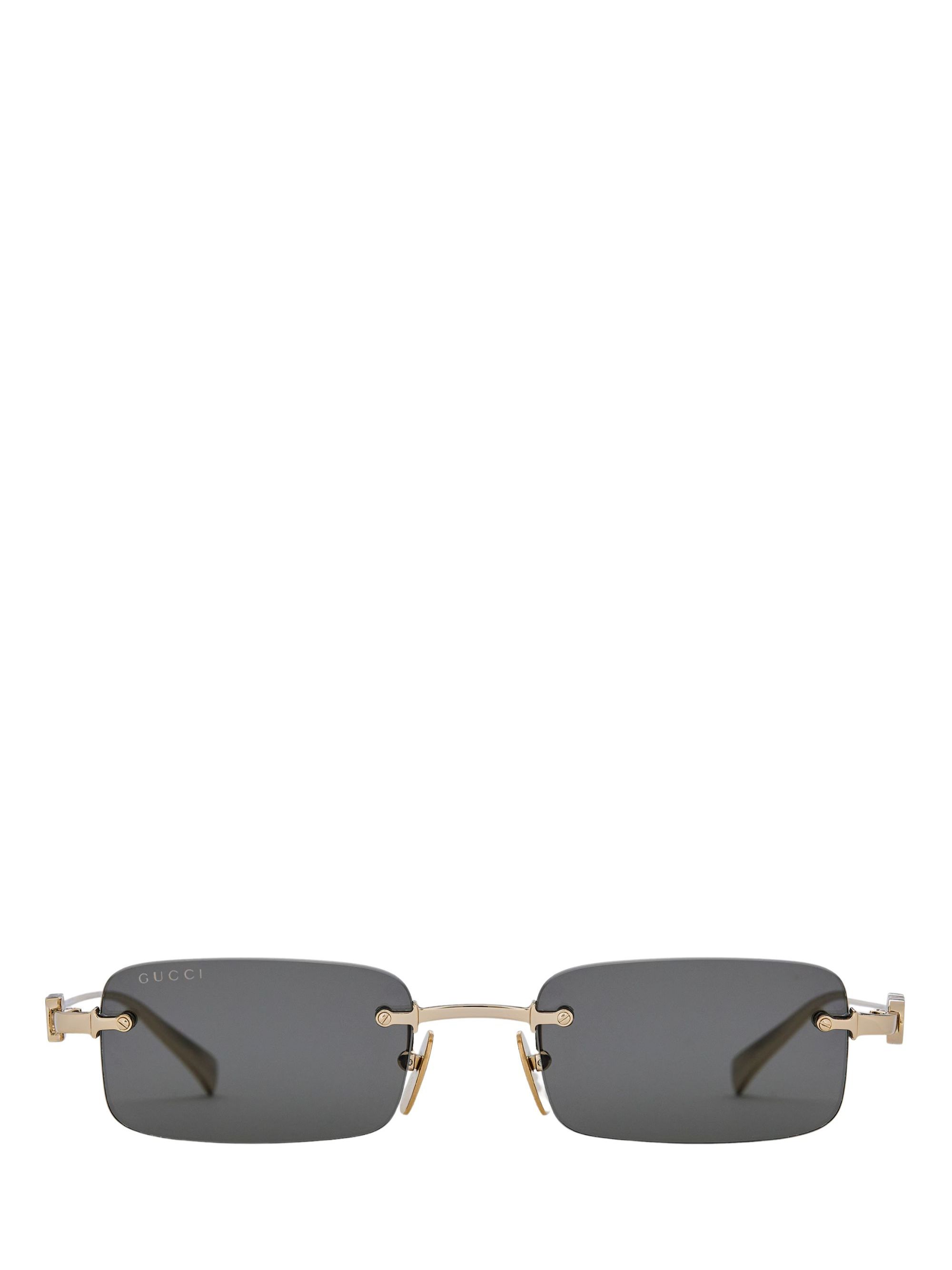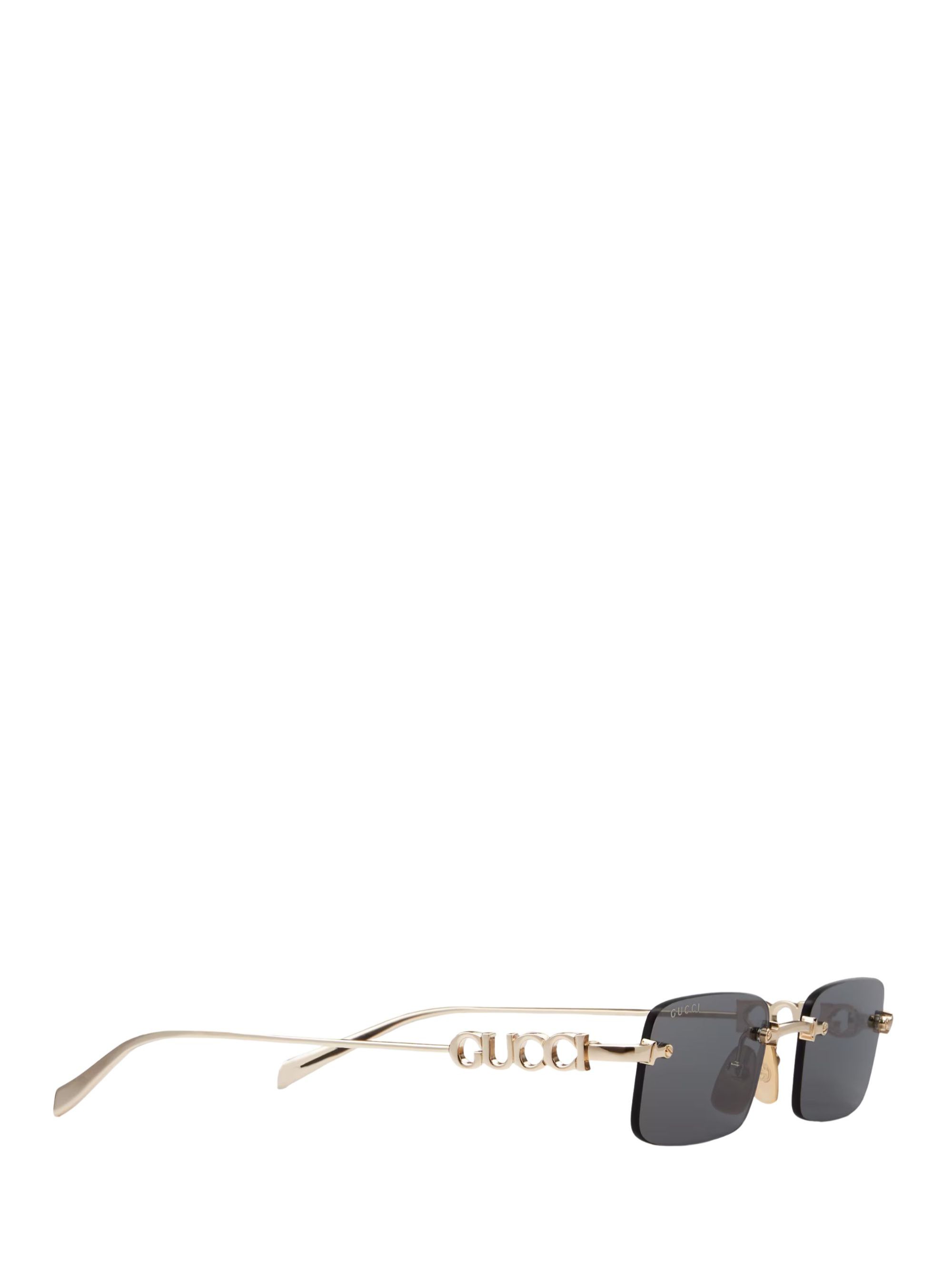 GUCCI gold rectangular sunglasses in metal with cut-out logo, grey lenses with total UVA/UVB protection.