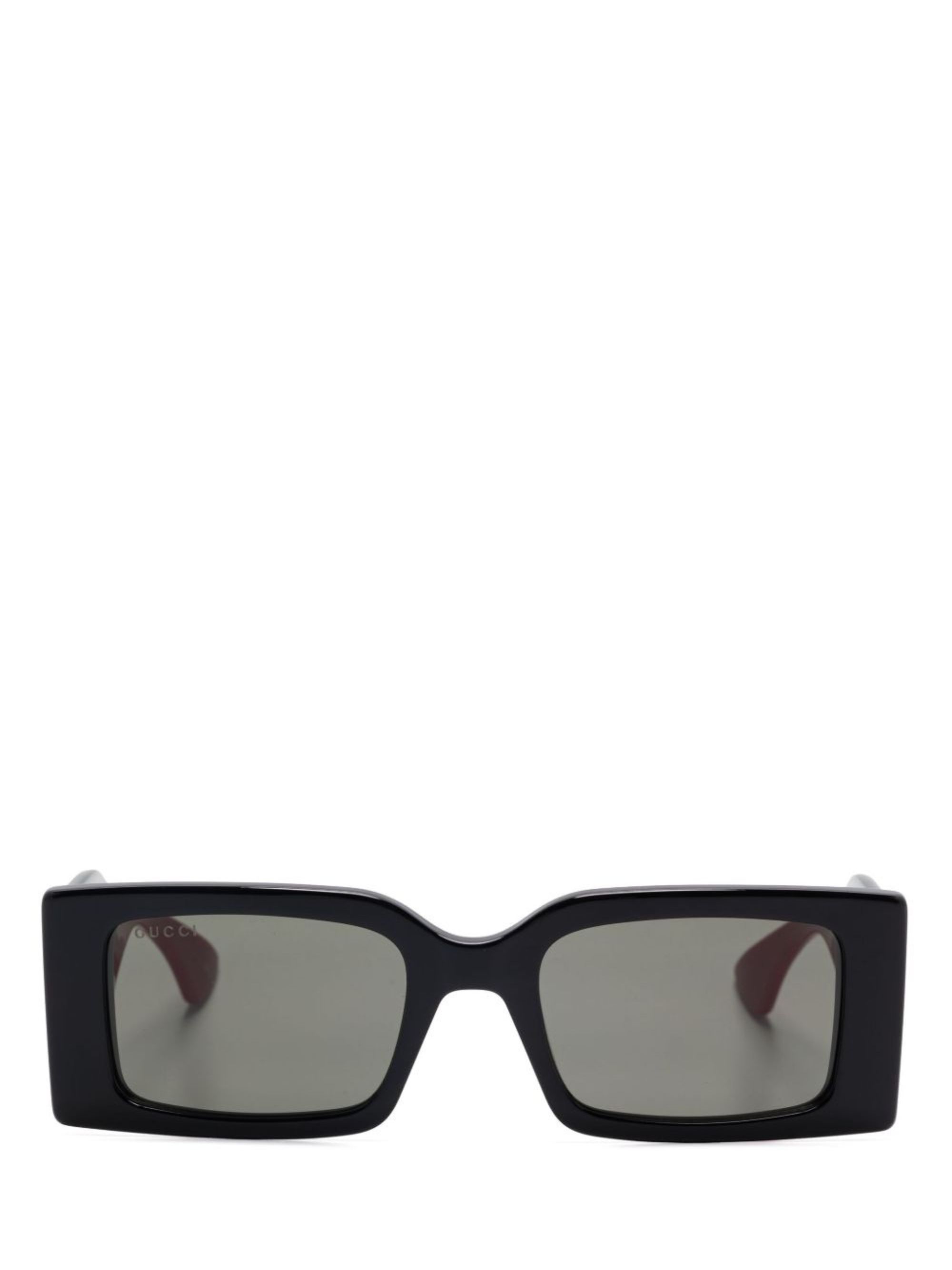 GUCCI glossy black rectangular sunglasses with green and red injected temples with Gucci logo and grey lenses with total UVA/UVB protection.