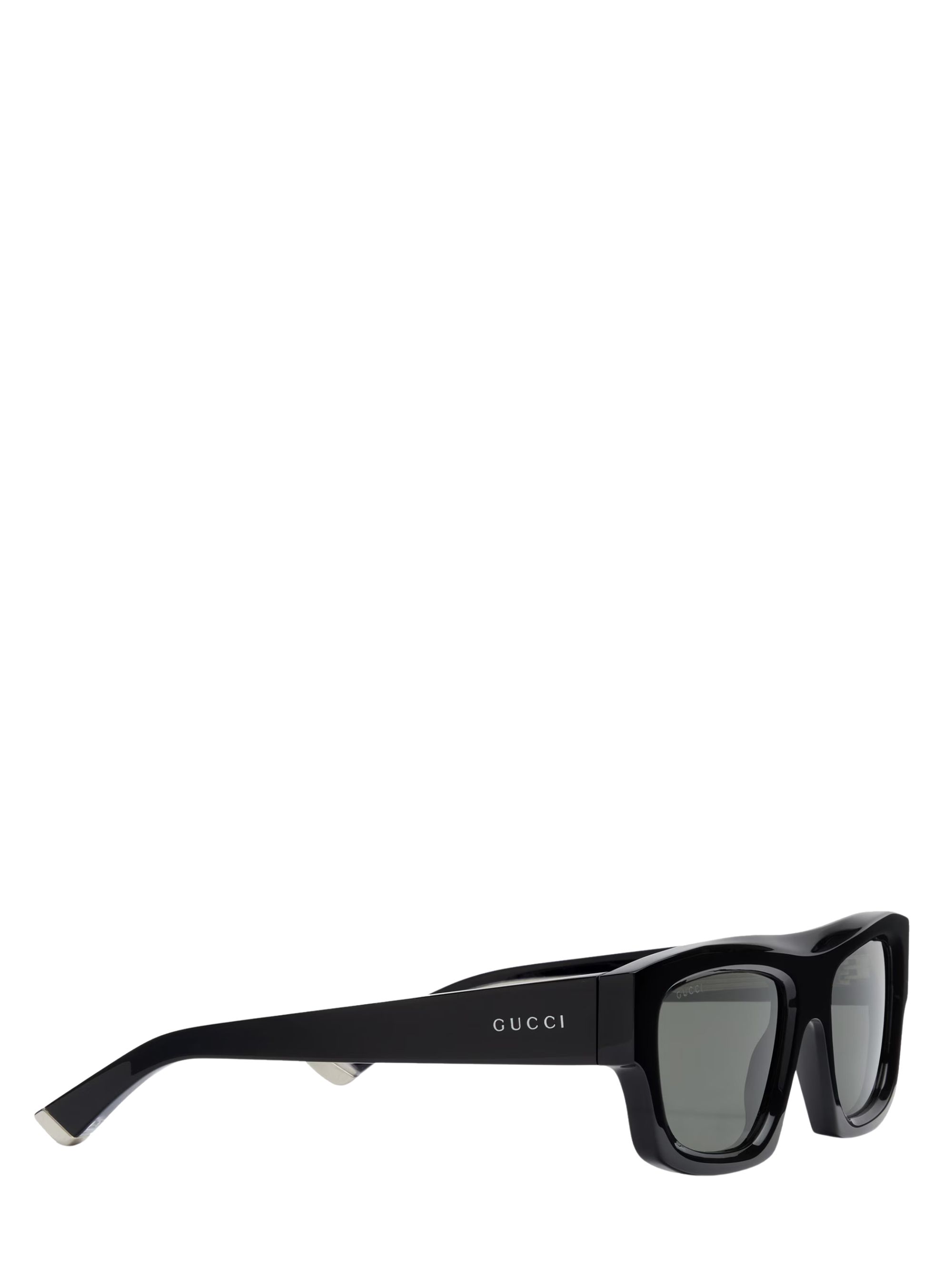 GUCCI rectangular sunglasses in black acetate with silver metal temple tips and gray lenses with total UVA/UVB protection.
