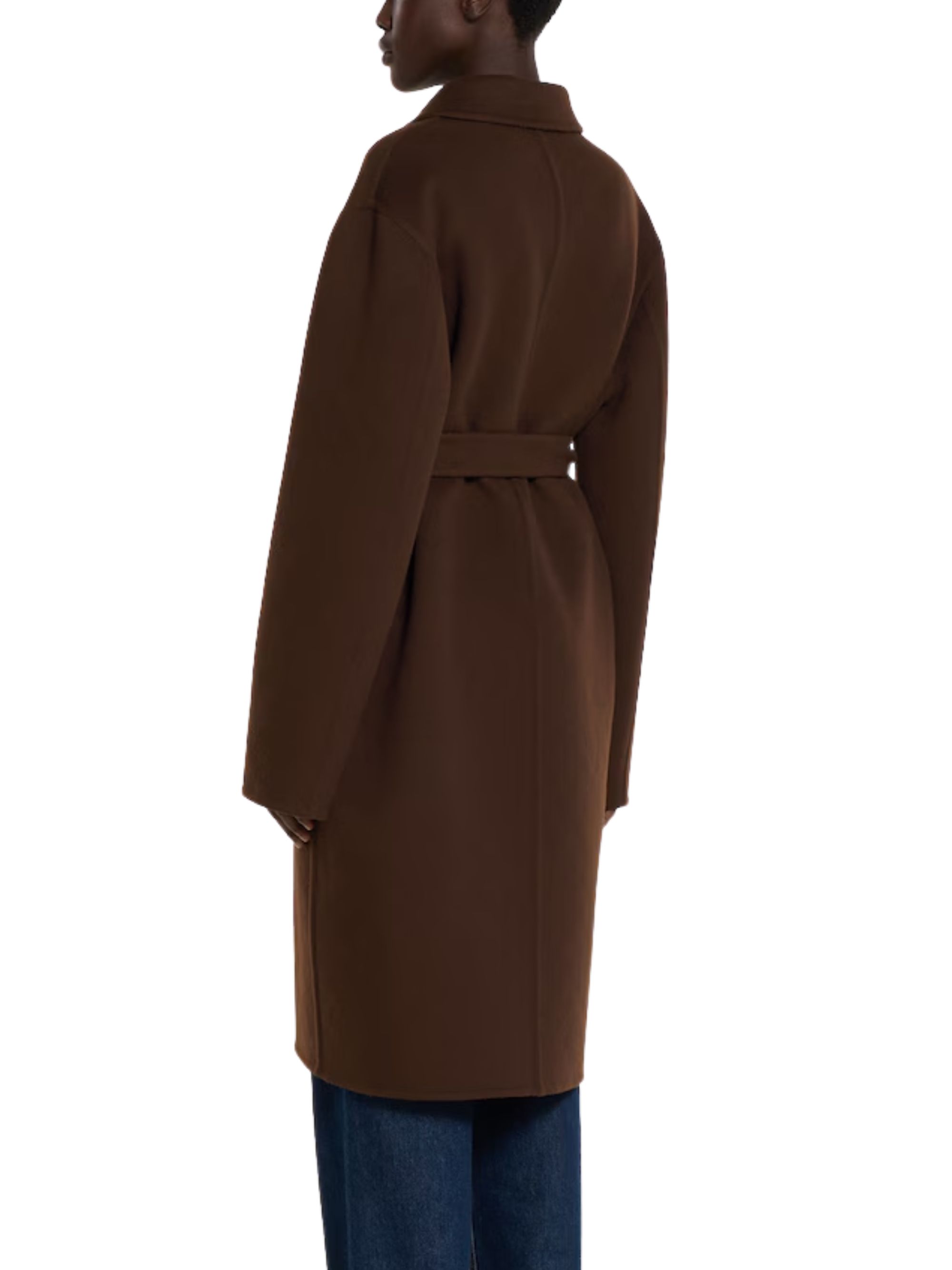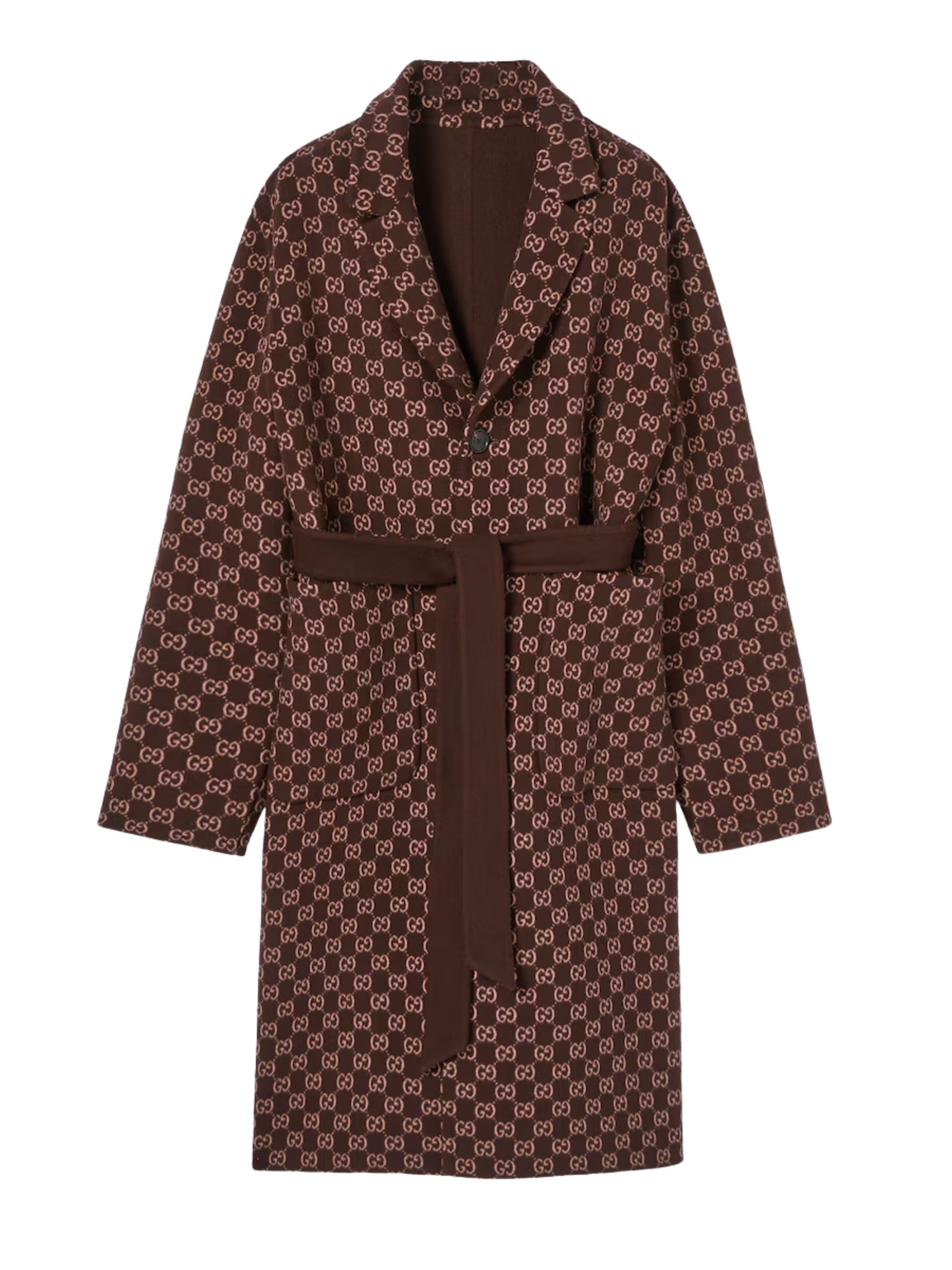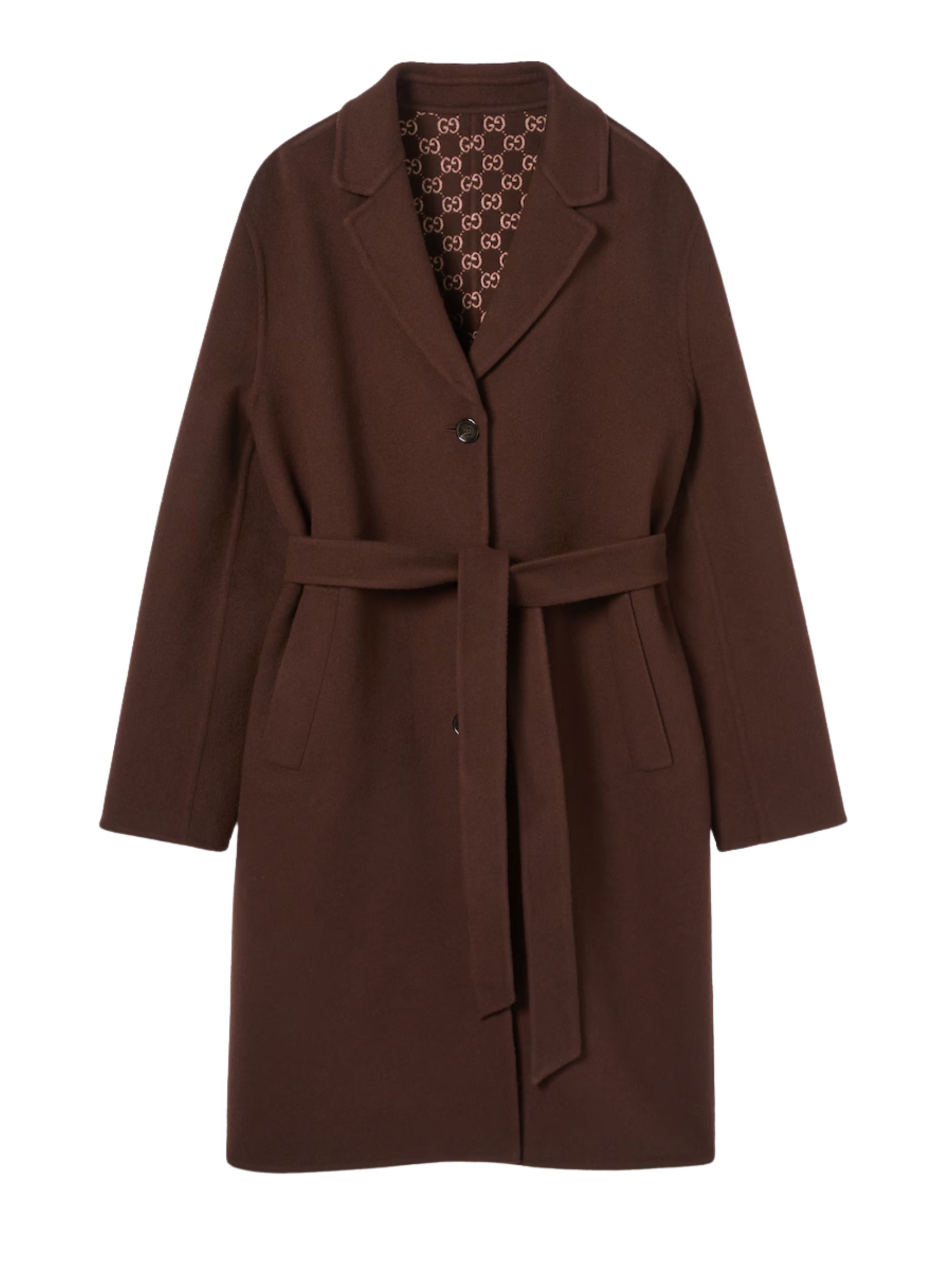 GUCCI reversible coat in brown wool and silk, featuring GG motif on the other side, notched lapels, two side pockets, button fastening and belt at the waist.
