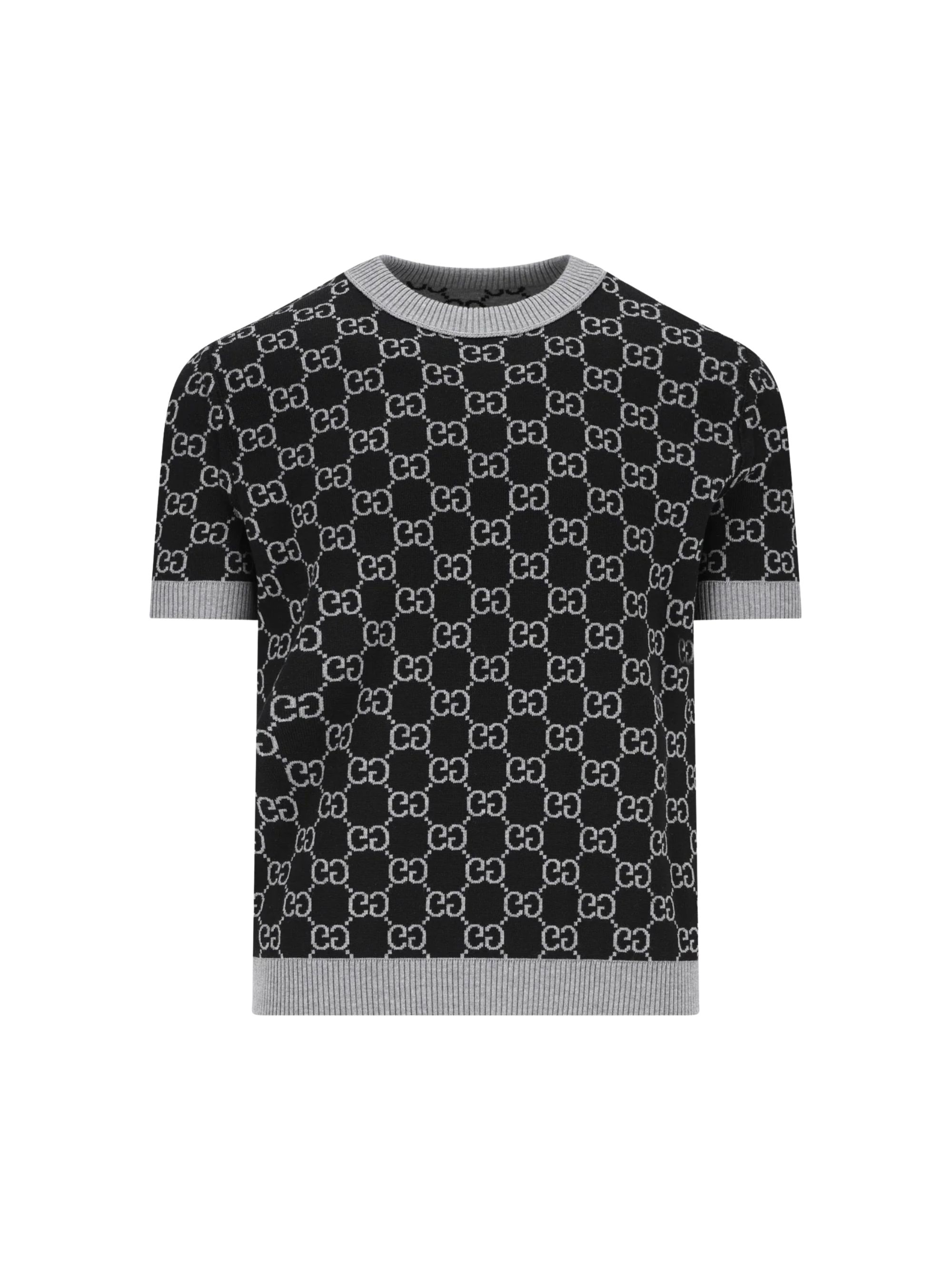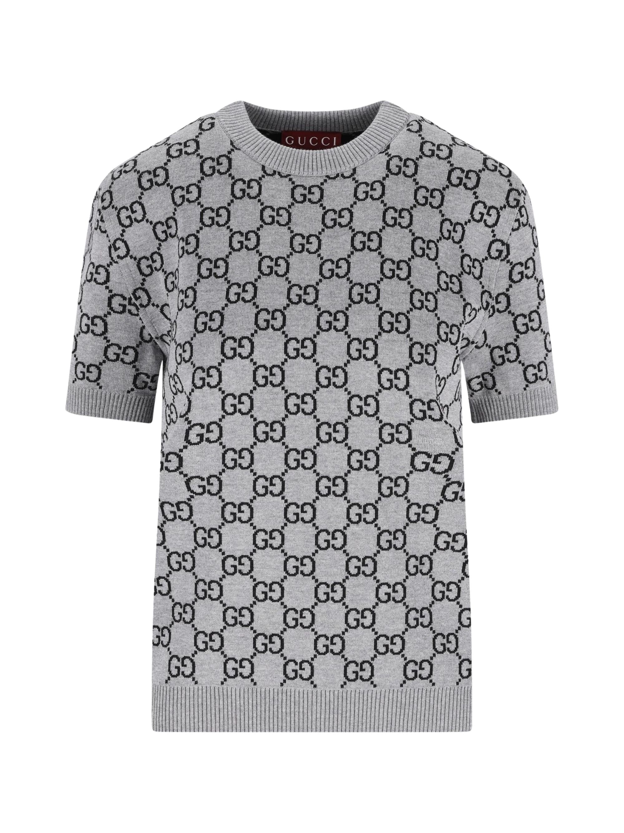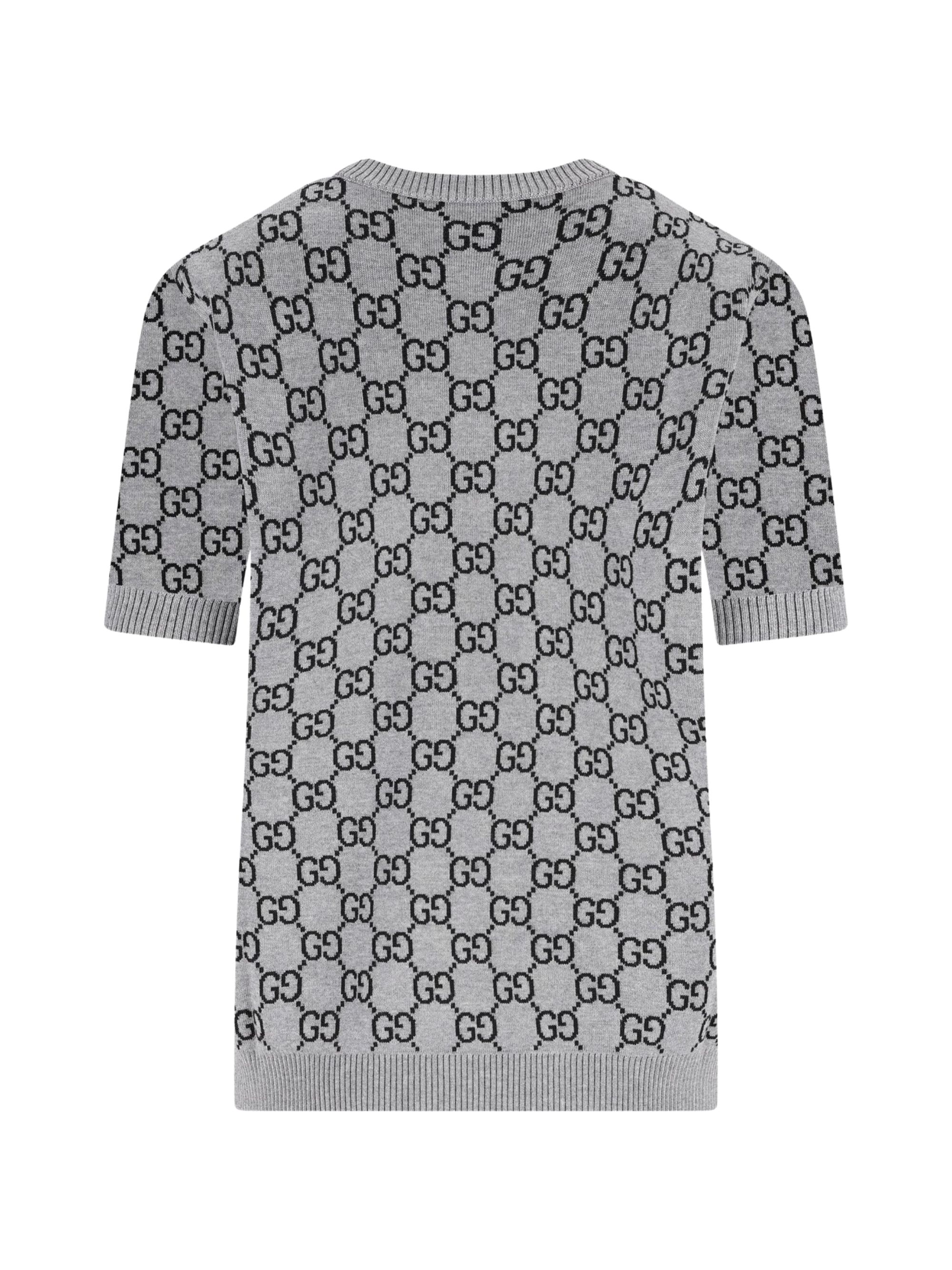 Grey GUCCI sweater featuring a crew neck, short sleeves and a contrasting allover logo.