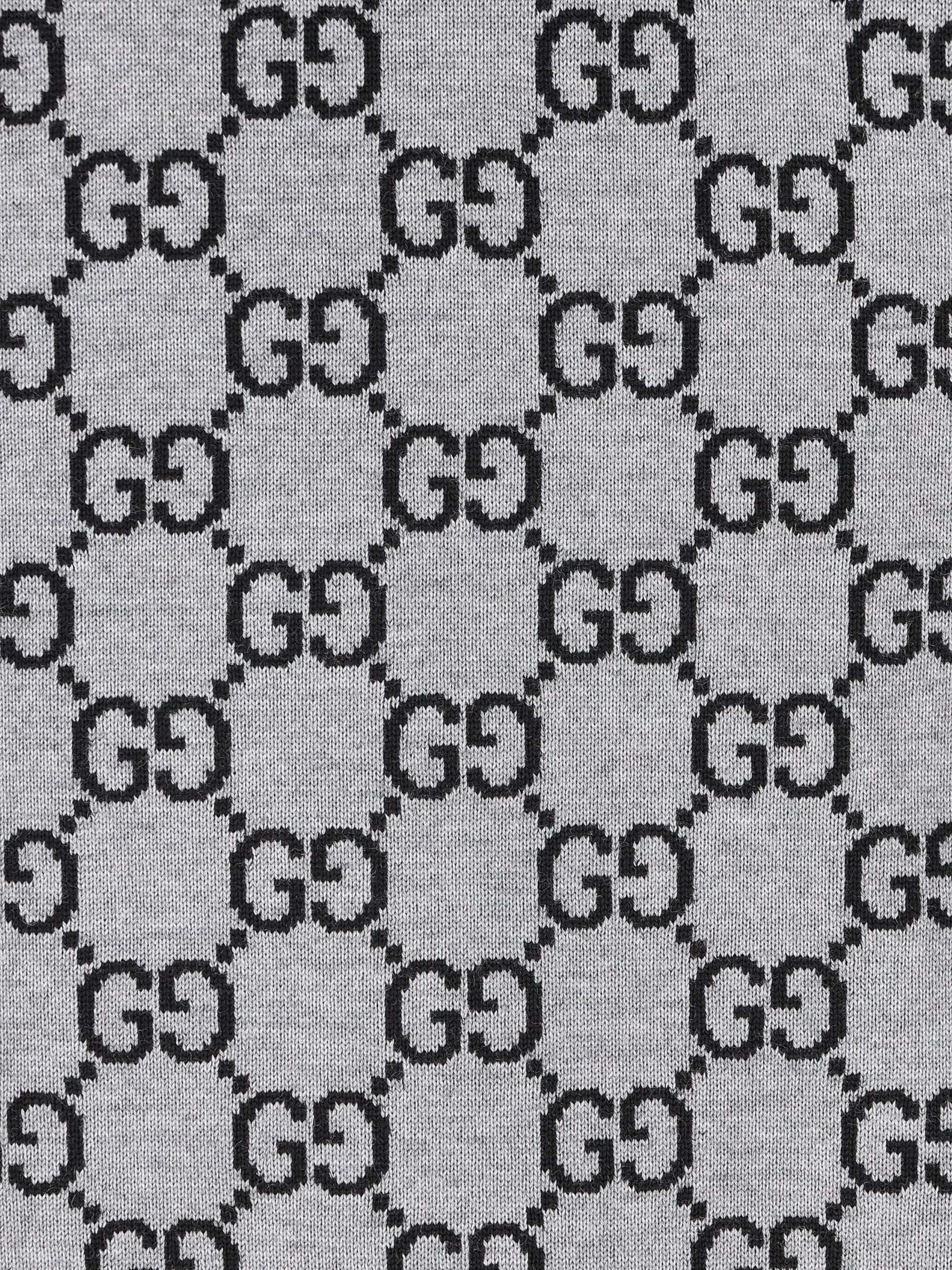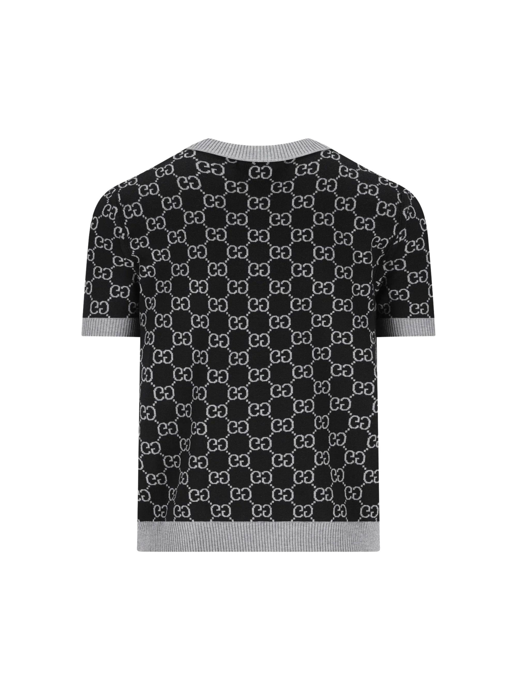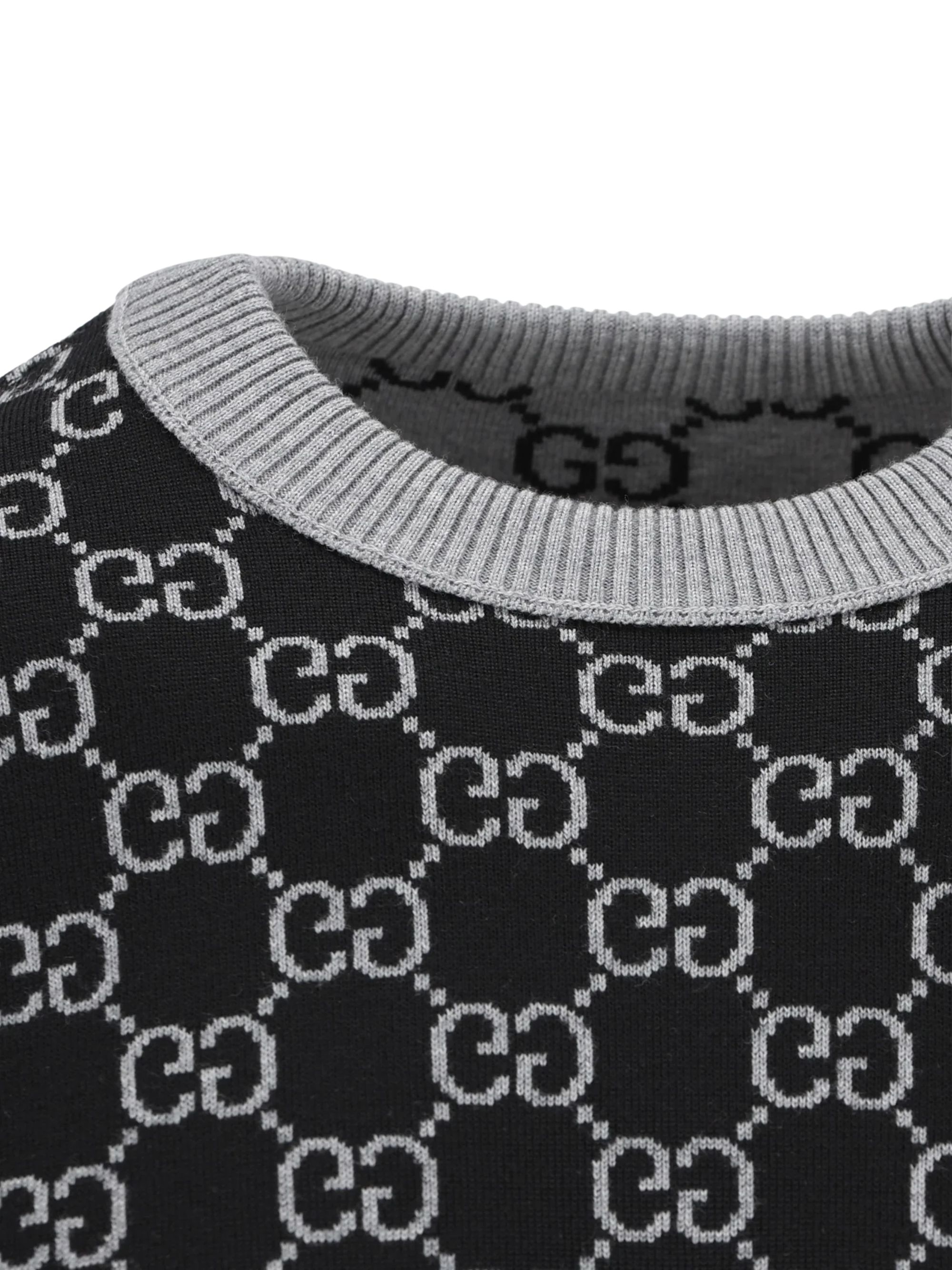 Grey GUCCI sweater featuring a crew neck, short sleeves and a contrasting allover logo.