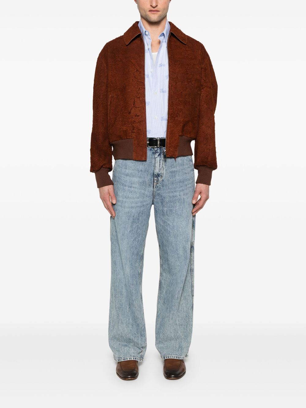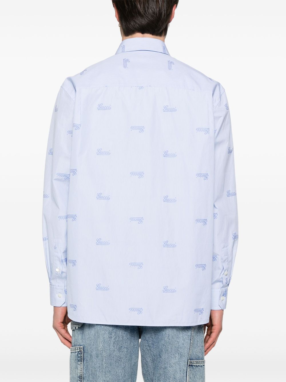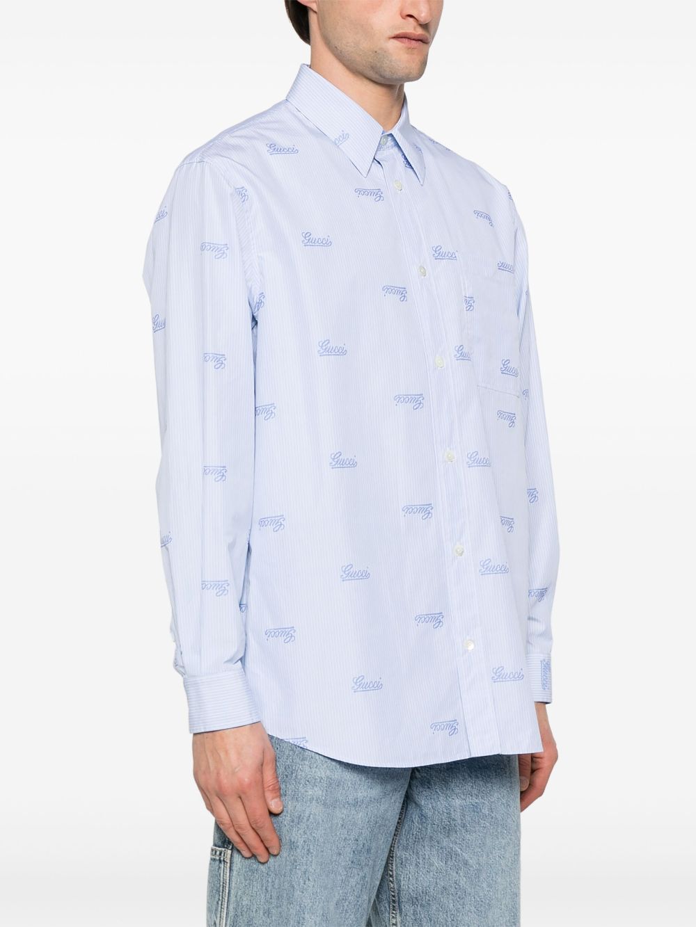 GUCCI script shirt with light blue and white stripes, pointed collar, dropped shoulders, all-over Gucci embroidery, chest pocket, ironed pleats and button fastening.