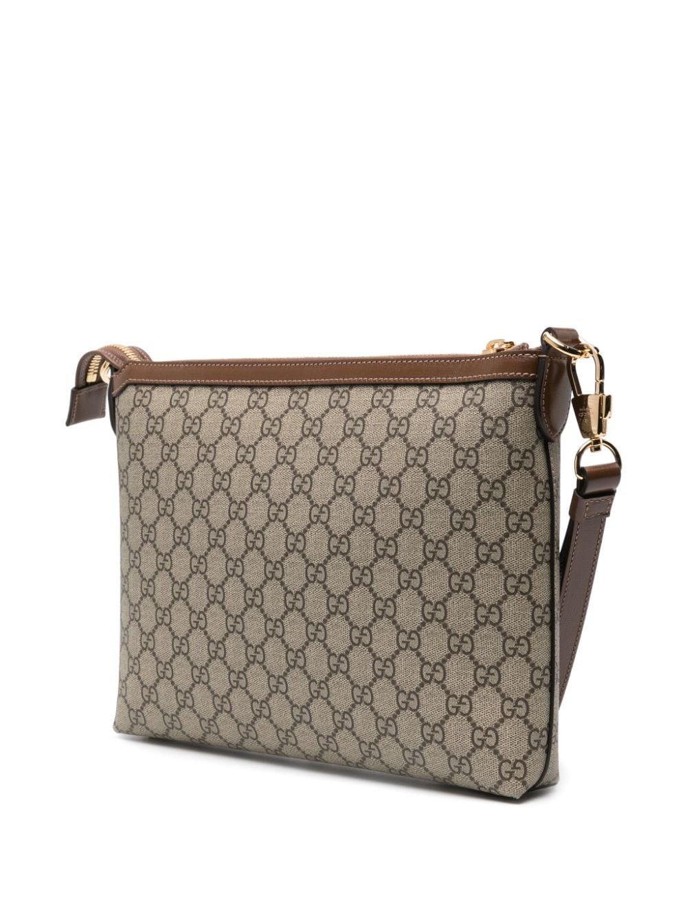 Beige GUCCI logo shoulder bag with brown leather trim, gold hardware, removable shoulder strap and zip closure.