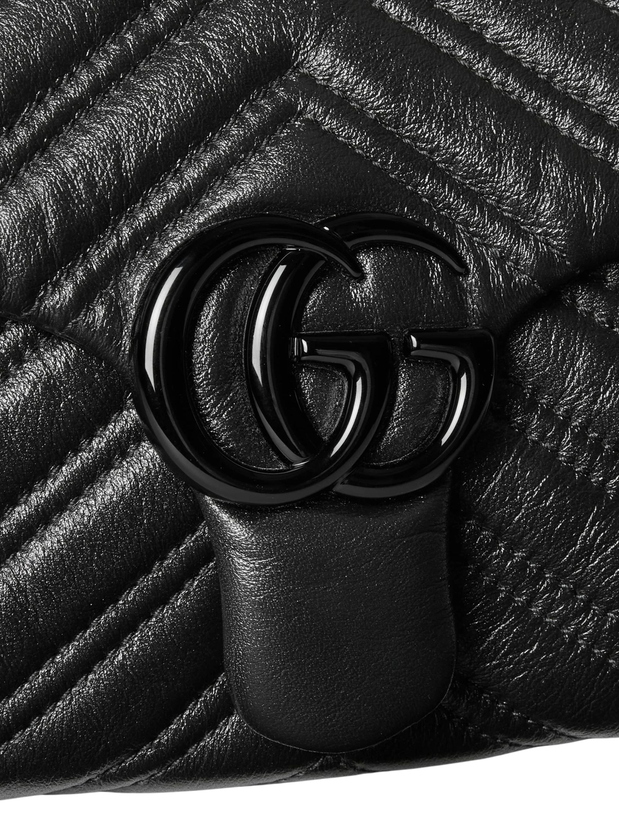 GUCCI small GG Marmont bag in black nappa leather with a chevron pattern, featuring tonal hardware, a double G, a chain shoulder strap, a magnetic closure, and a viscose lining. Dimensions: 23 x 17 x 9 cm.