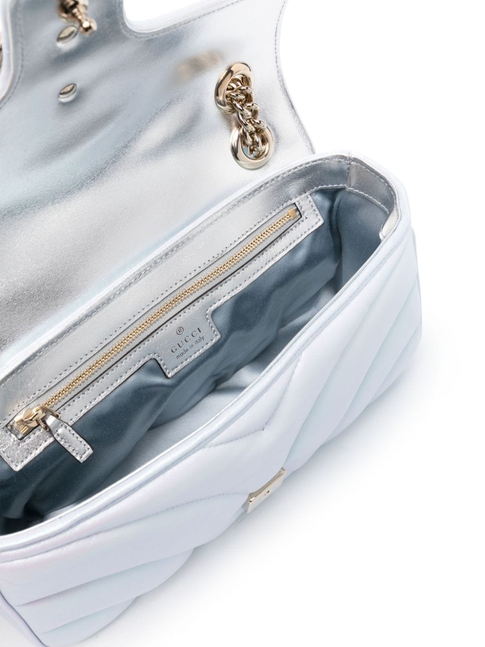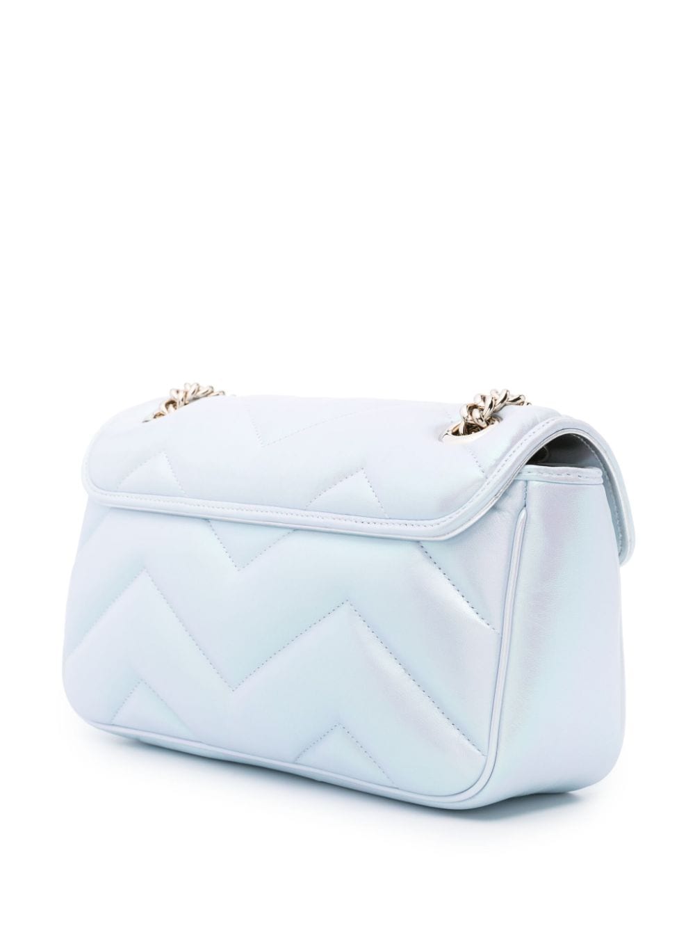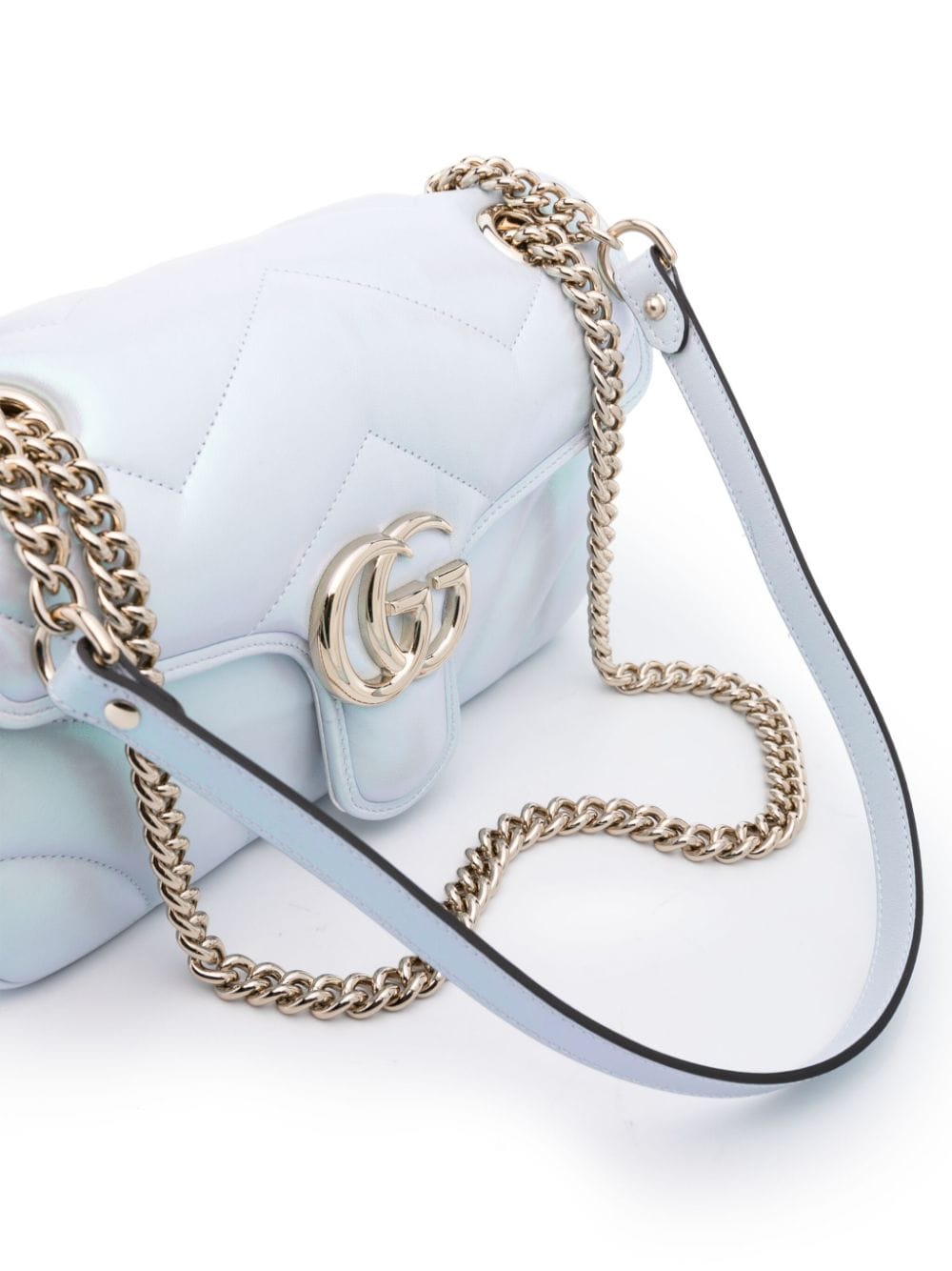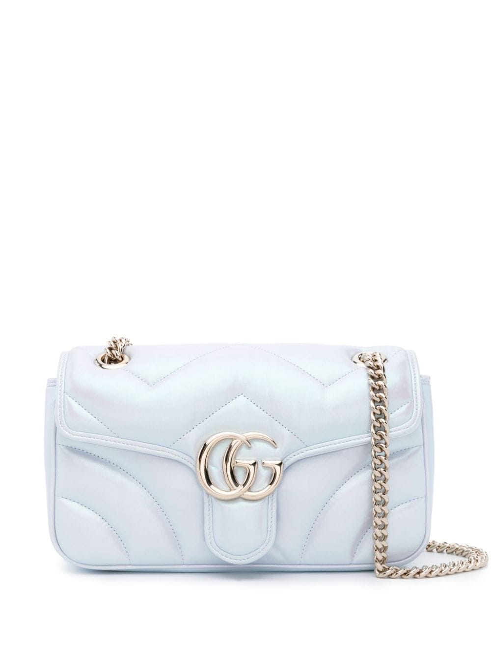 Small Marmont bag by GUCCI, light blue color, magnetic clip closure, logoed hardware in gold tones, quilted design, chain shoulder strap.