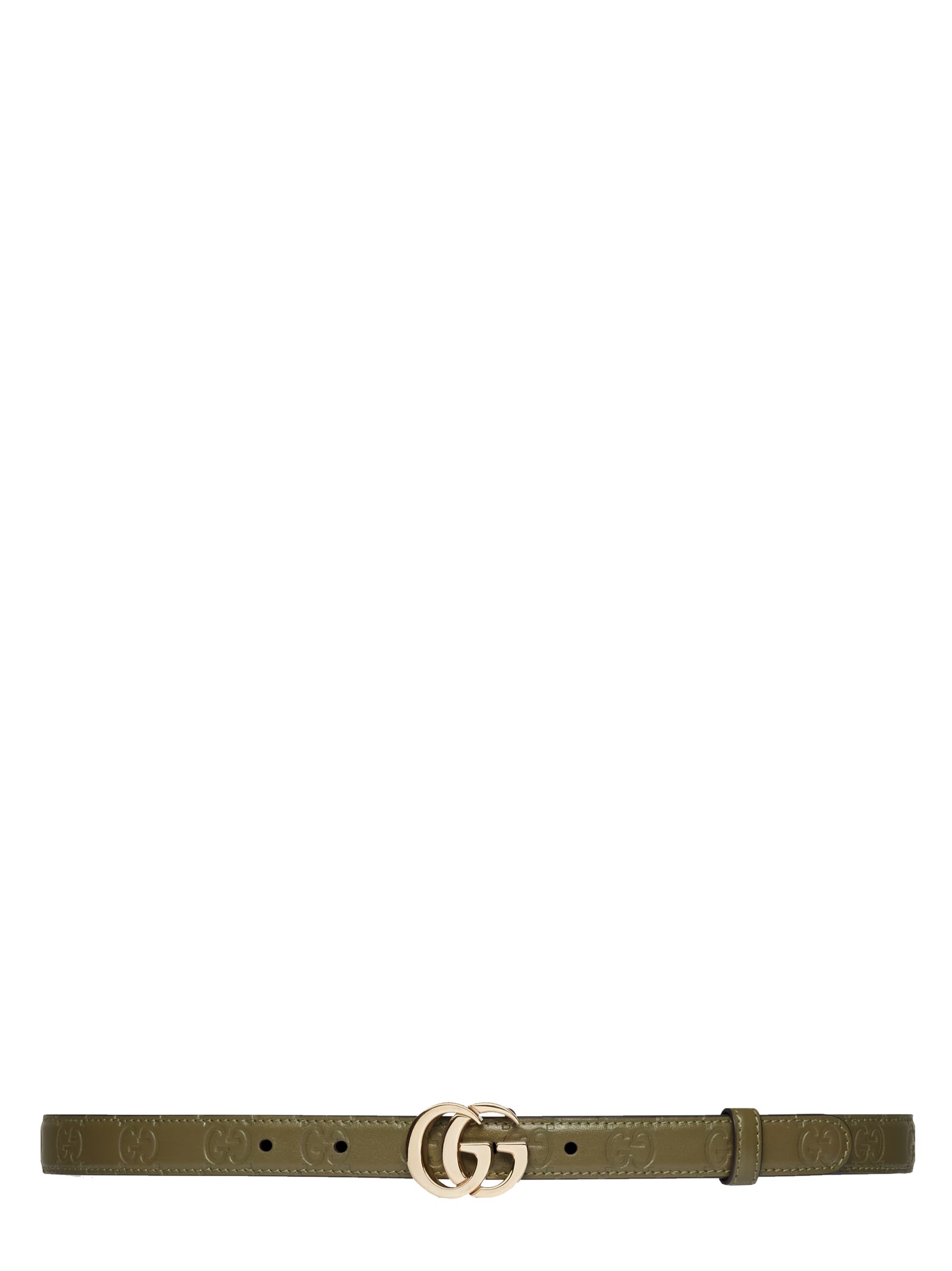GUCCI green thin leather belt with gold hardware and logo buckle.