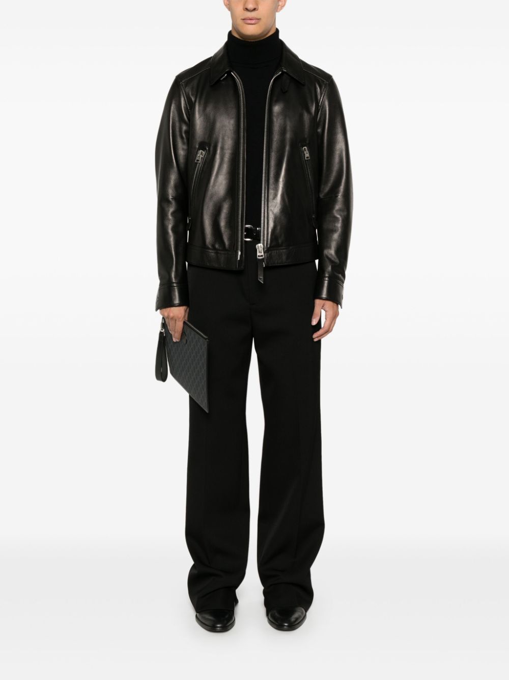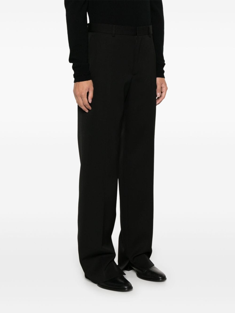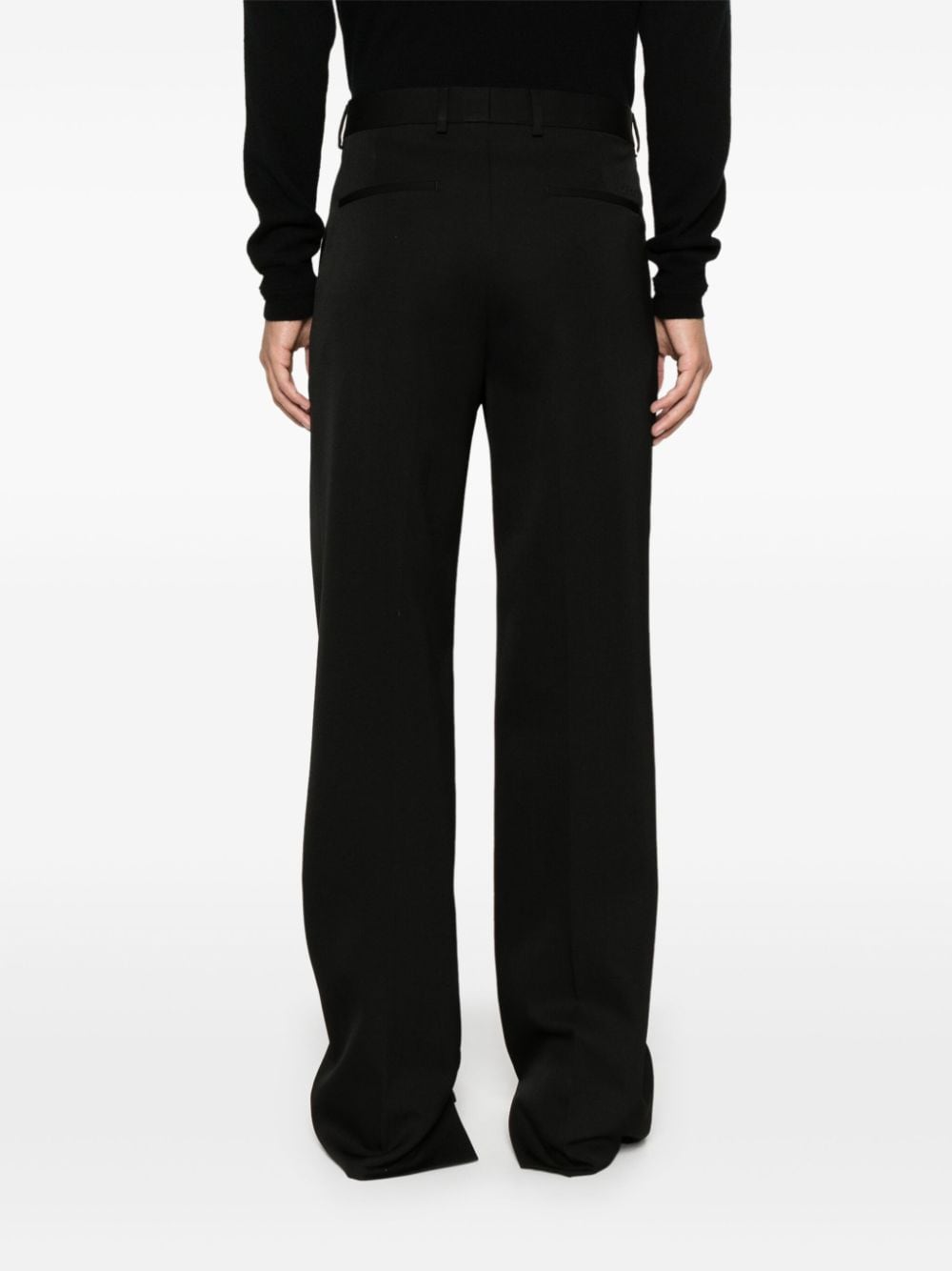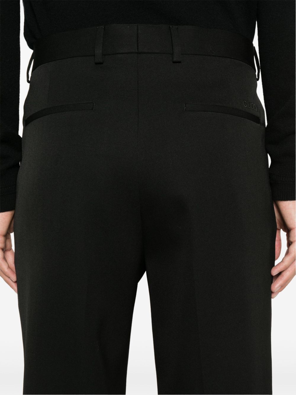 GUCCI black wool embroidered trousers with logo on the back, belt loops, pressed crease, straight fit, diagonal side and back welt pockets.
