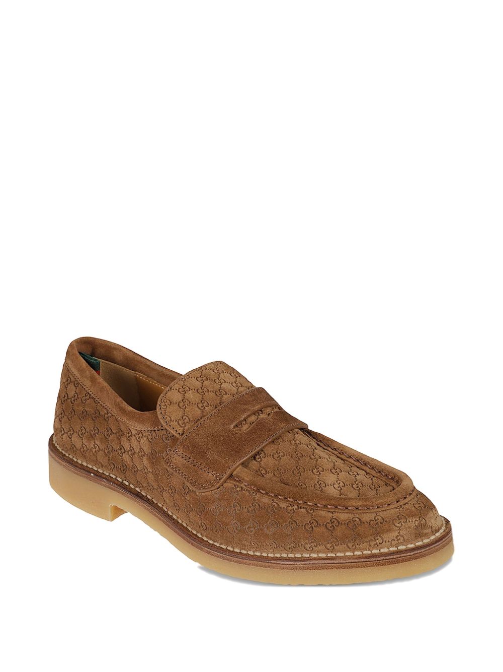 GUCCI camel suede loafer with an GG logo, a Web heel loop, and a rubber sole.
