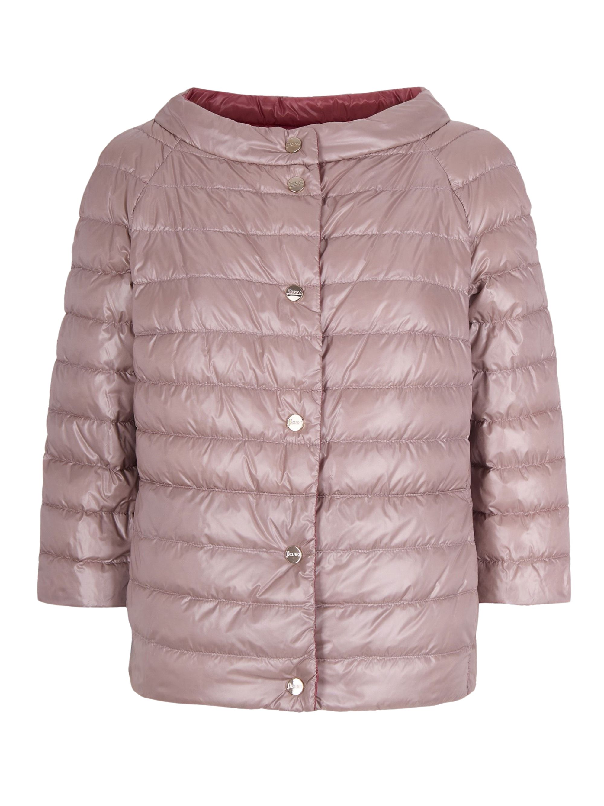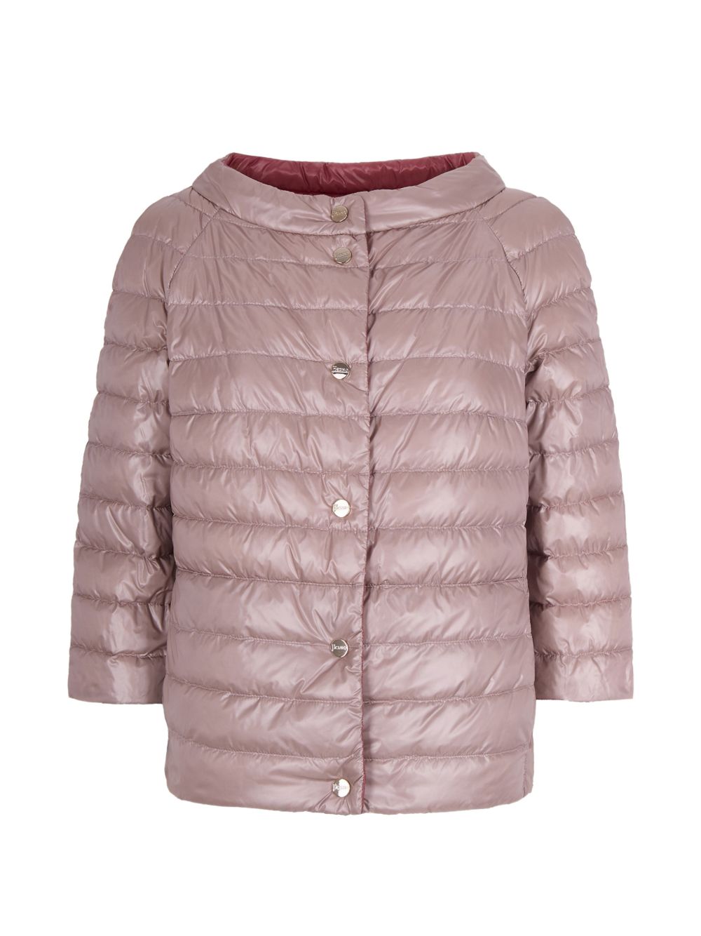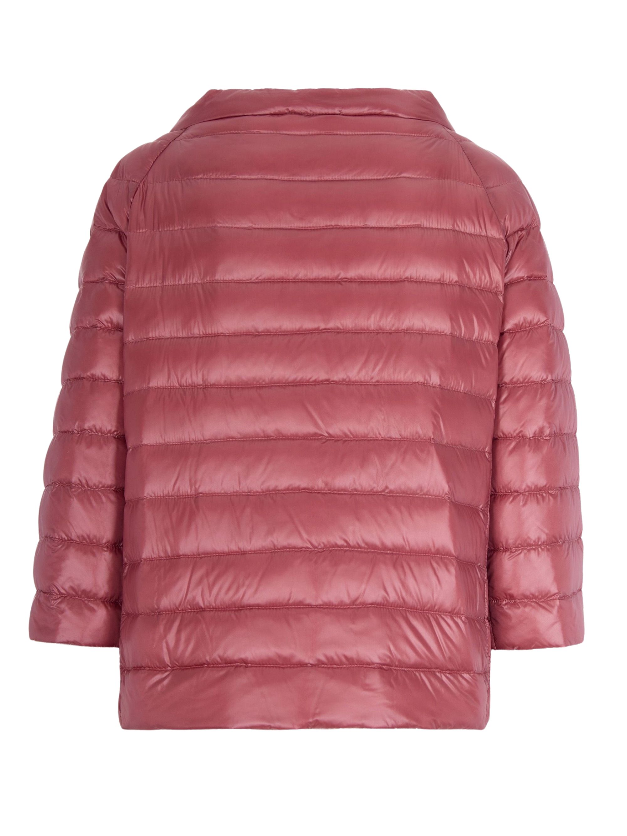 Reversible HERNO down jacket in pink nylon, featuring 3/4 sleeves, a funnel neck, boudin quilting, an A-line cut, and a logo button closure.