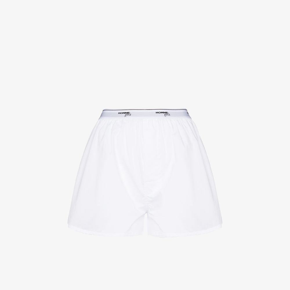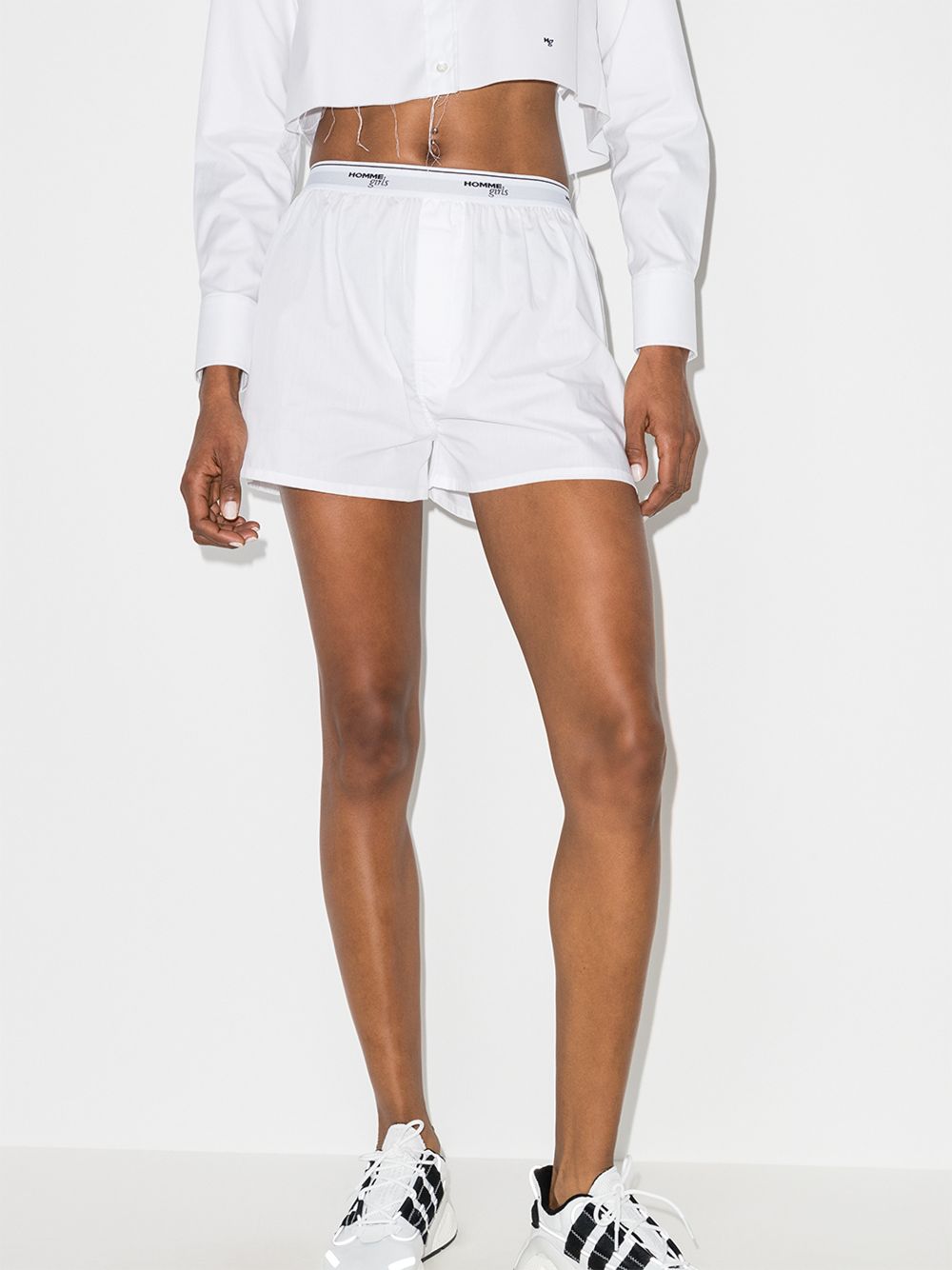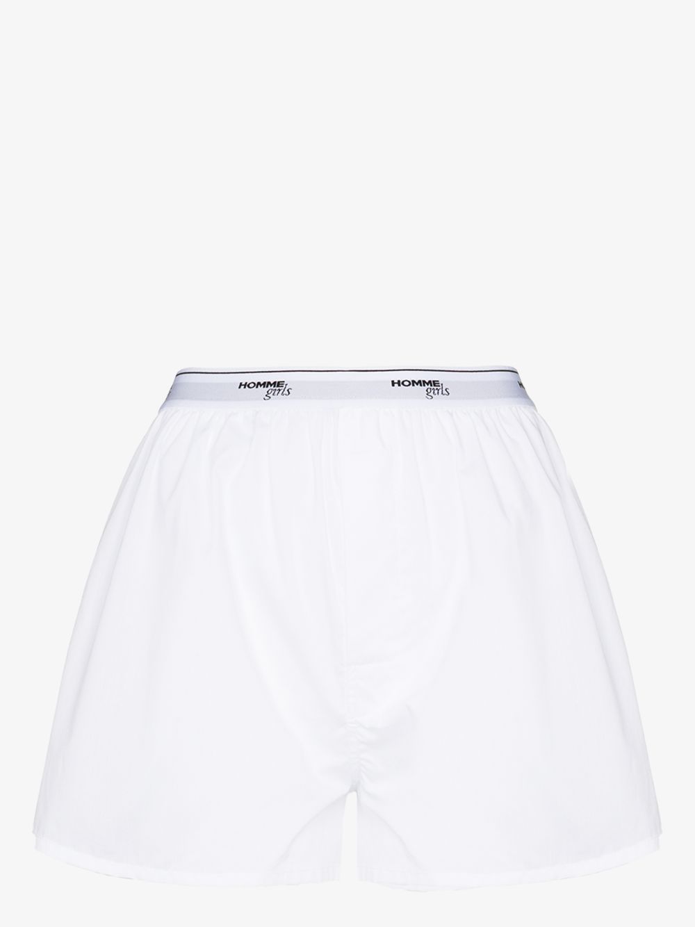 White organic cotton boxer shorts from HOMMEGIRLS featuring logo elastic waistband and fitted silhouette.