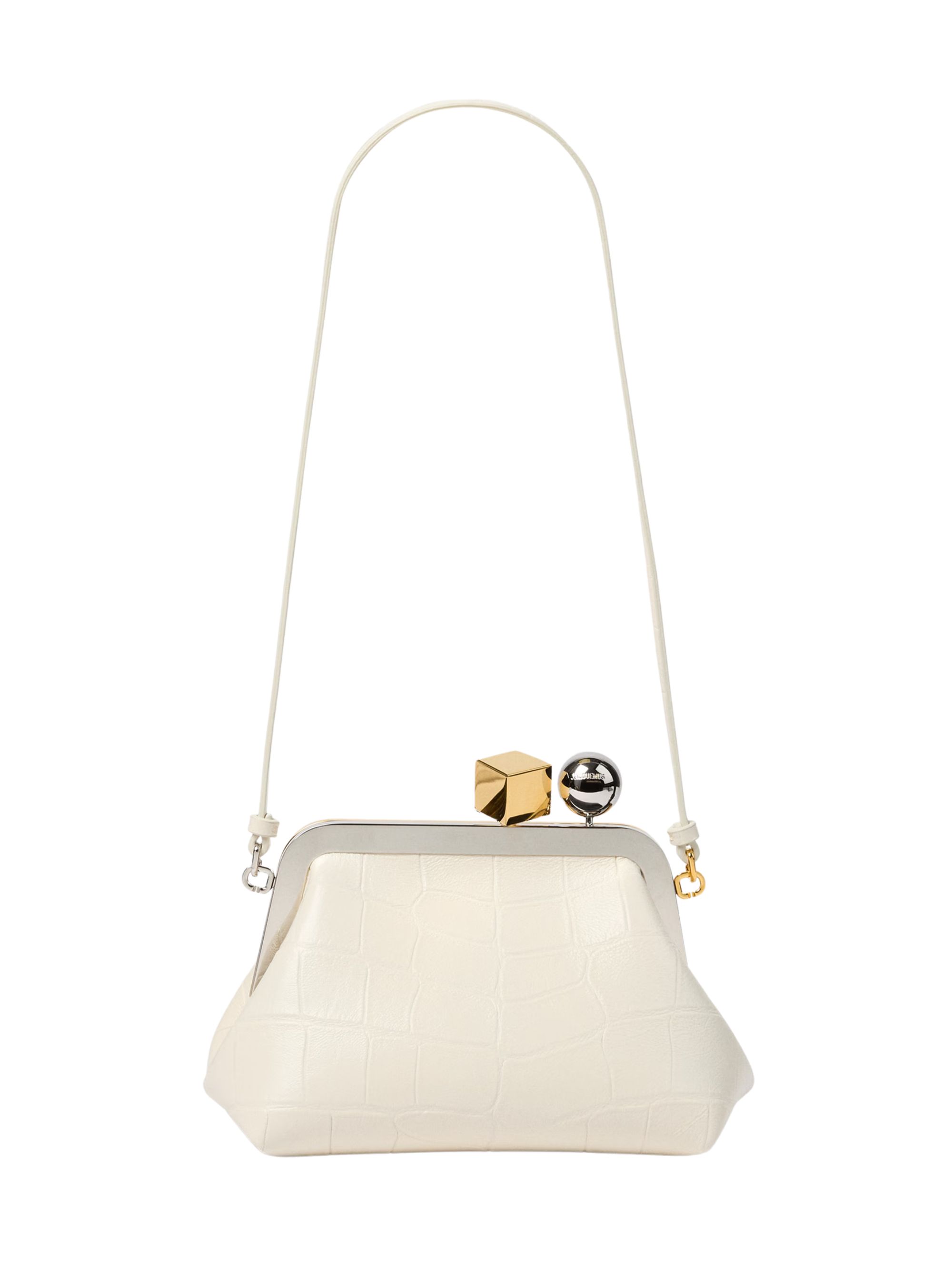 JACQUEMUS Berlingot bag in white crocodile-pattern leather, featuring a thin removable shoulder strap, a contrasting silver- and gold-tone Rond-Carré closure, and an interior pocket. Dimensions: 20 x 13.5 x 13 cm.