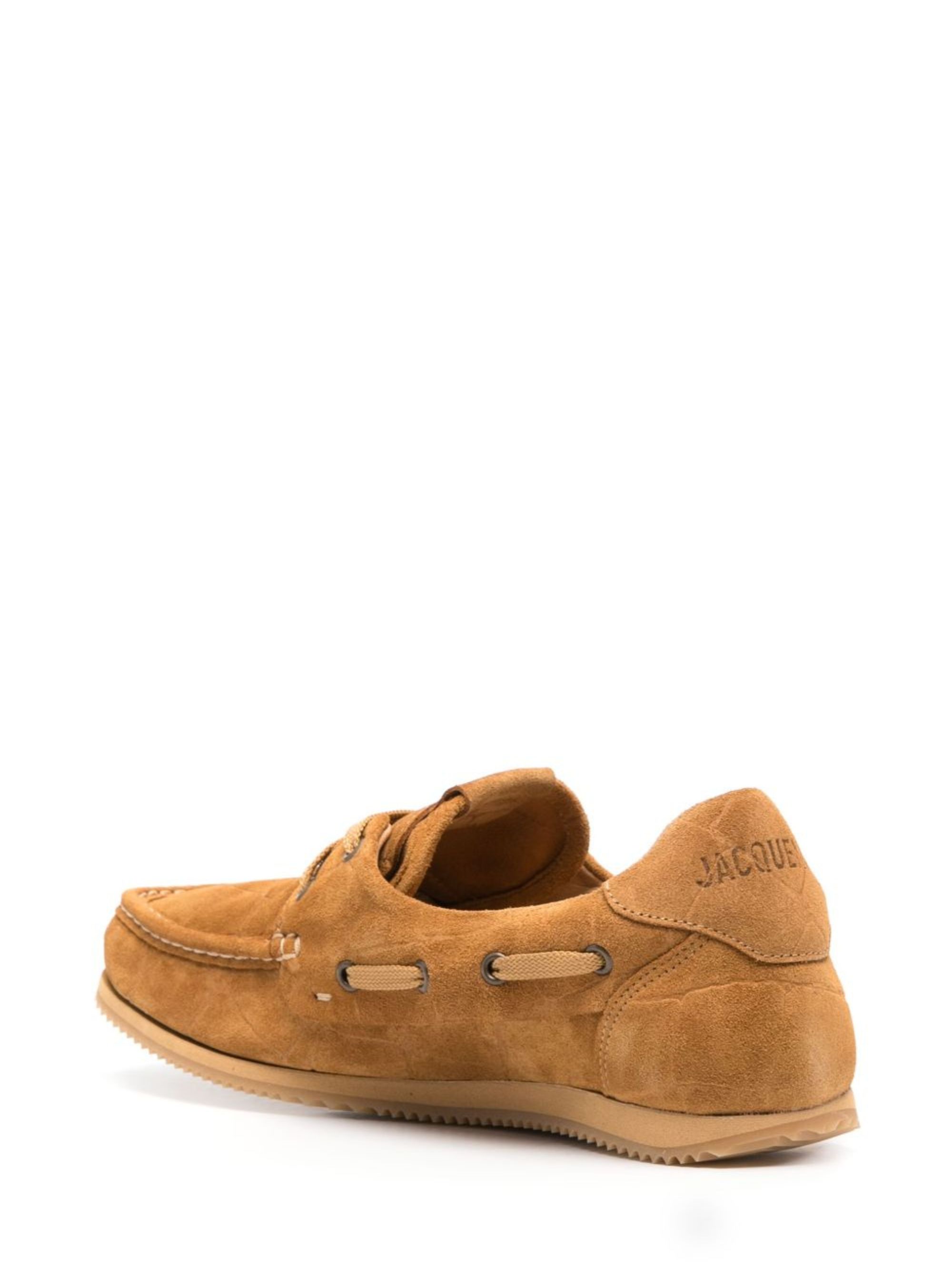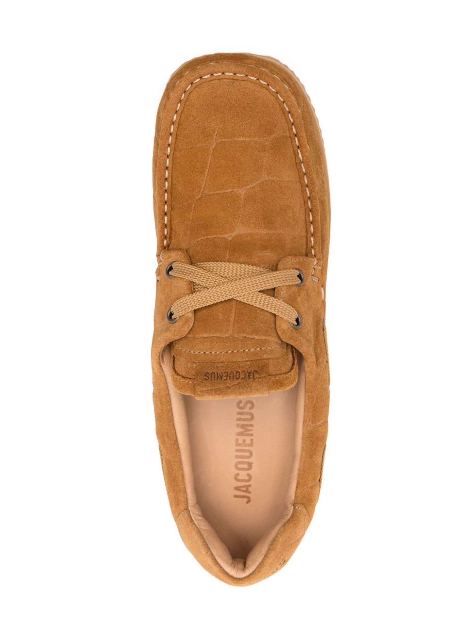 JACQUEMUS Les Batto loafer in camel brown in suede with an embossed crocodile effect, a logo on the heel and a square toe.