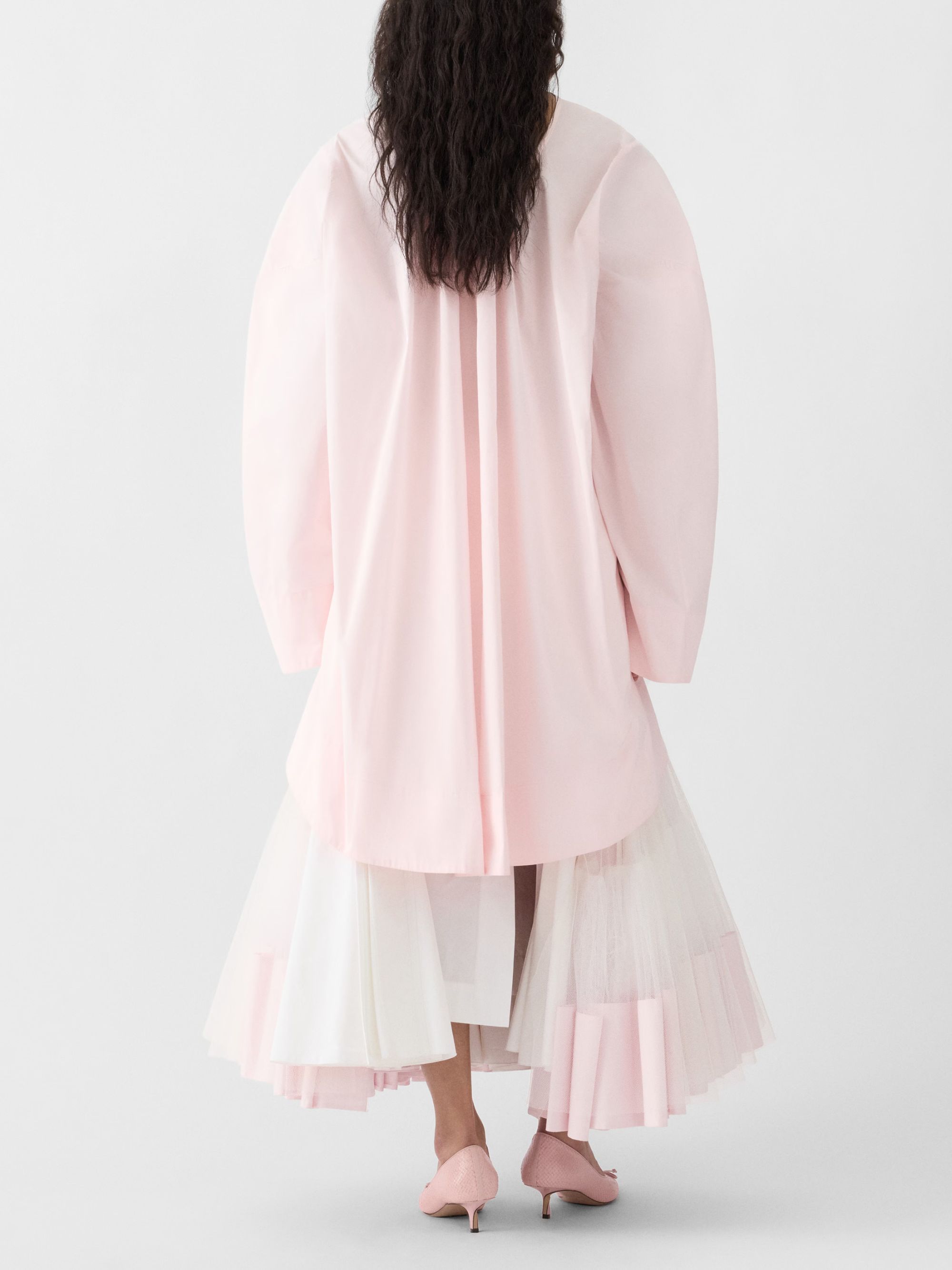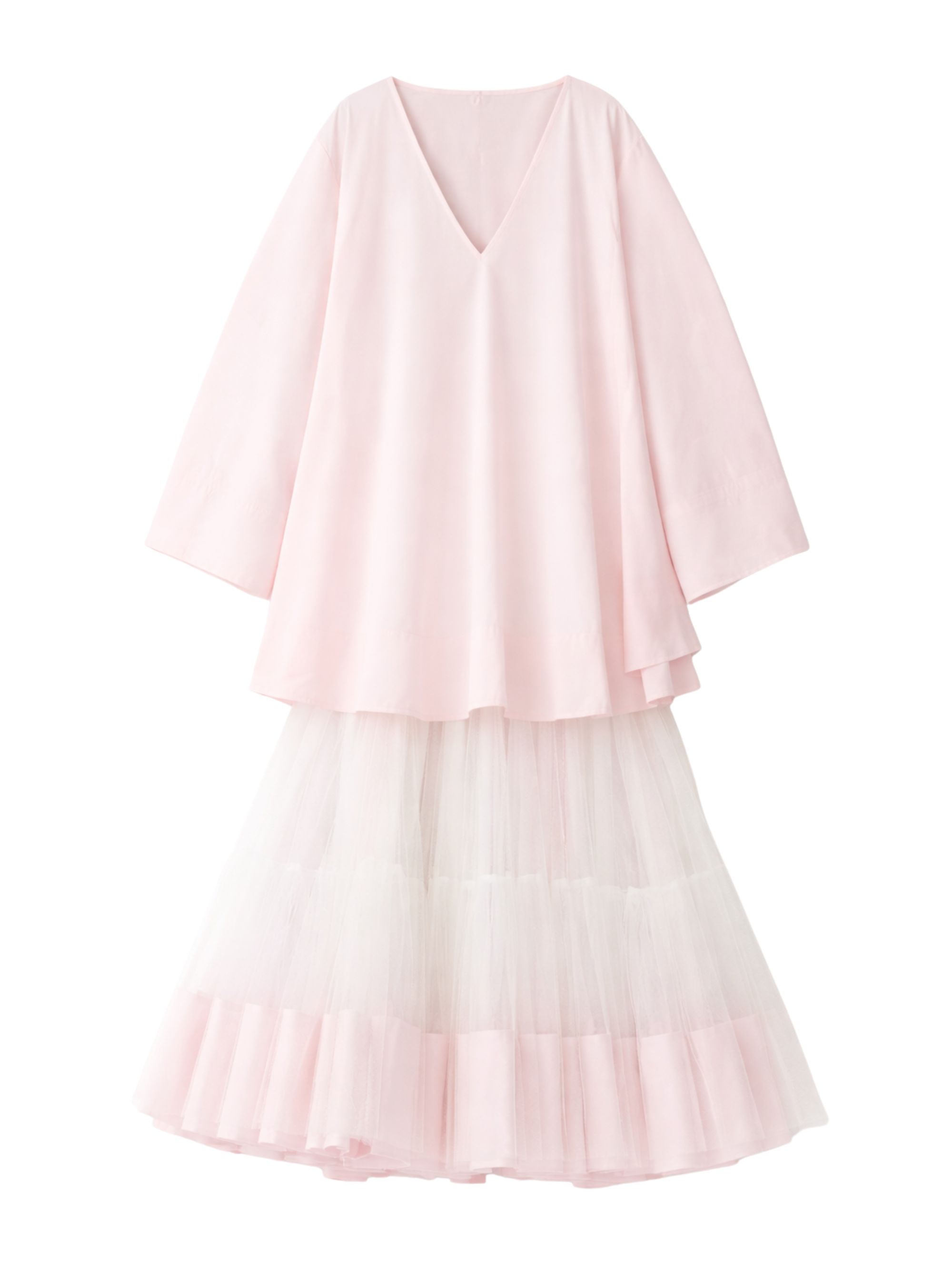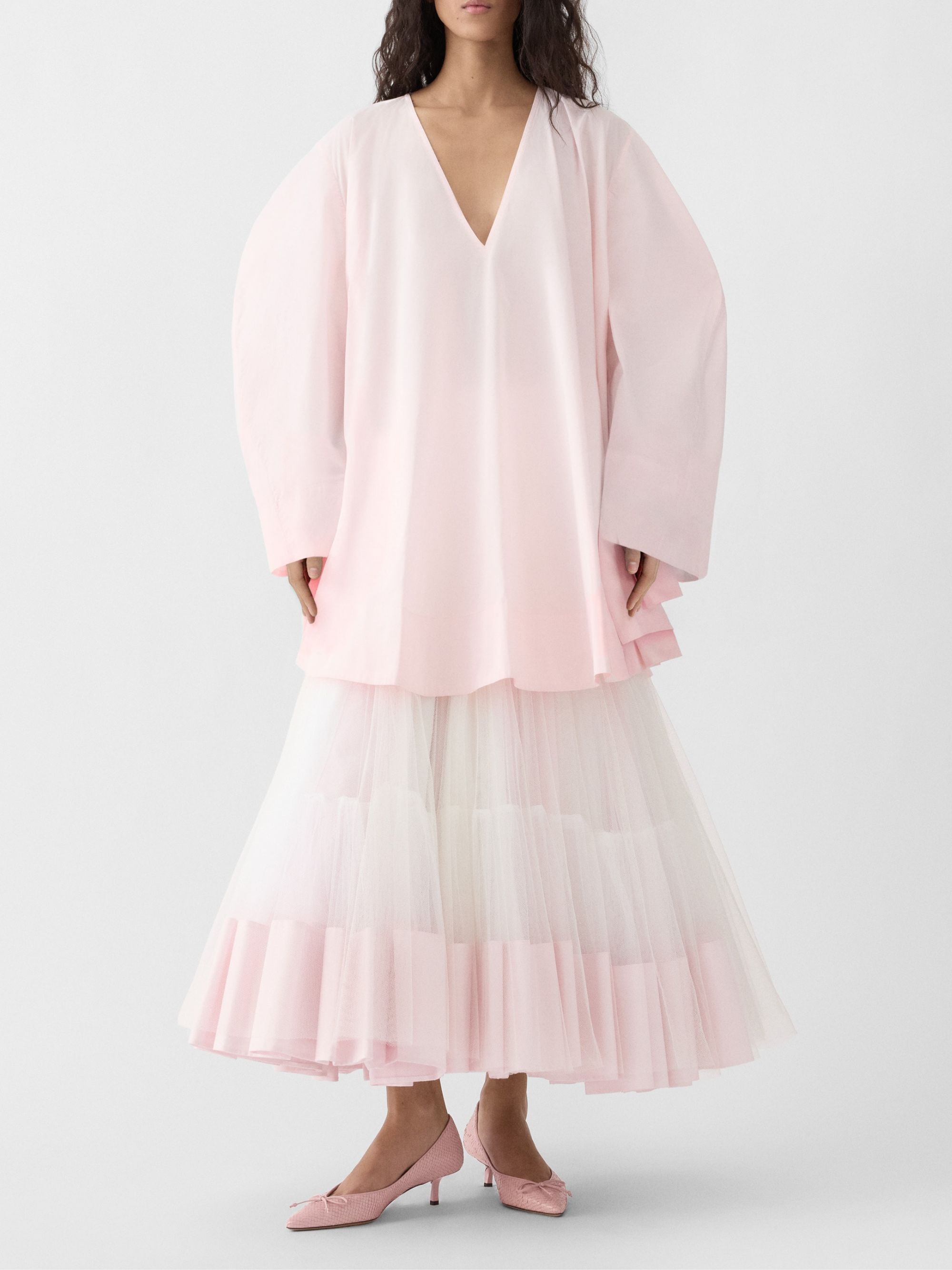 Paysan dress by JACQUEMUS in pink cotton, featuring semi-sheer cotton, V-neck, wide and curved sleeves, mini flared hem and back neckline with fastening straps.