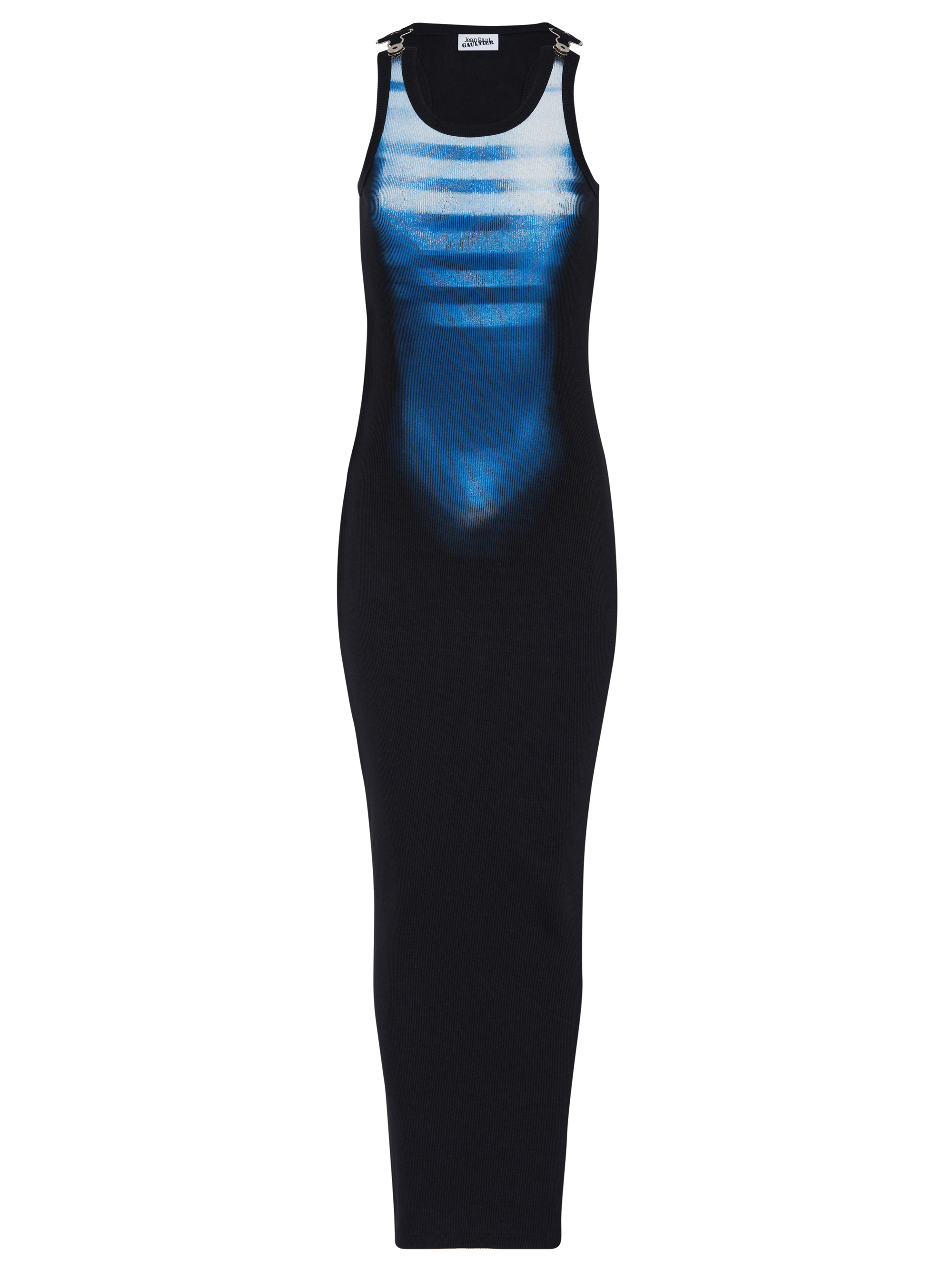 JEAN PAUL GAULTIER long dress in black and blue with a print, crew neck and sleeveless.