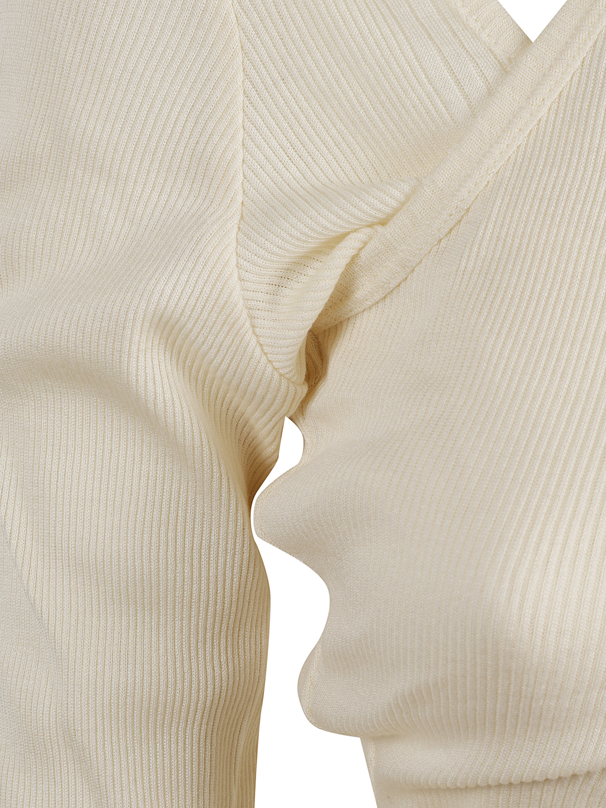 Beige top by JEAN PAUL GAULTIER featuring an asymmetrical length, ribbed knit, long sleeves, and an asymmetrical neckline.